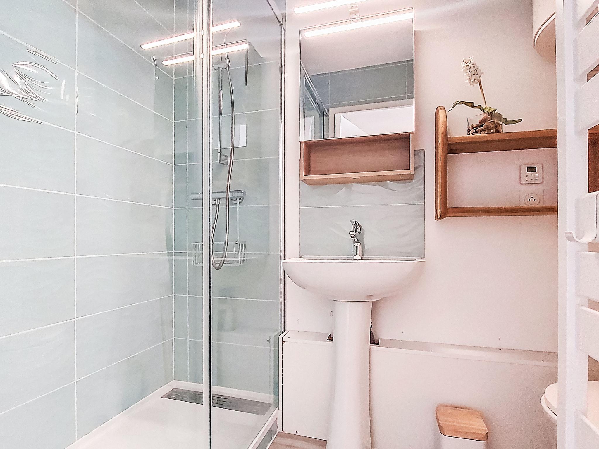 "Cimes de Caron 1603", 1-room apartment 24 m2 on 6th floor, south facing position. Bright, very comfortable furnishings: living/dining room with 1 x 2 bunk beds (80 cm, length 190 cm), TV (flat screen), electric heater. Exit to the balcony, south facing position. 1 open small room with 1 french bed (140 cm, length 190 cm), electric heater. Kitchenette (2 hot plates, electric coffee machine, raclette grill, combination microwave). Shower/WC. Small balcony 2 m2, south facing position. Facilities: Internet (WiFi, extra). Please note: non-smokers only. Maximum 1 pet/ dog allowed. Smoke alarm. 73257010873DP