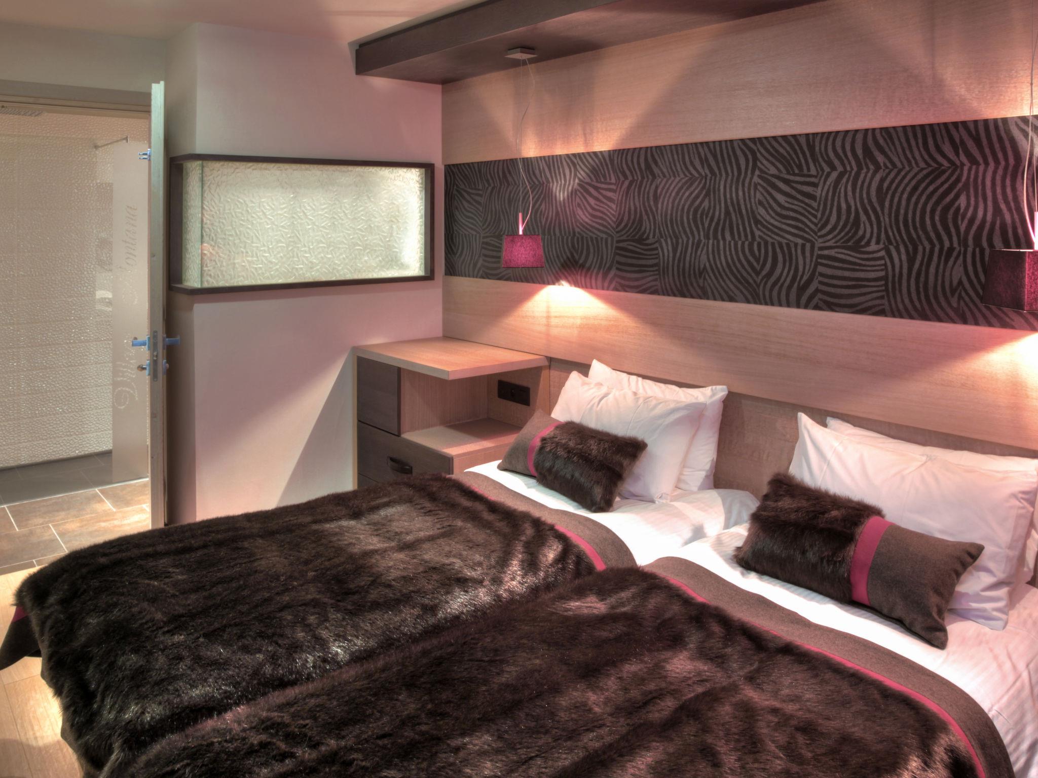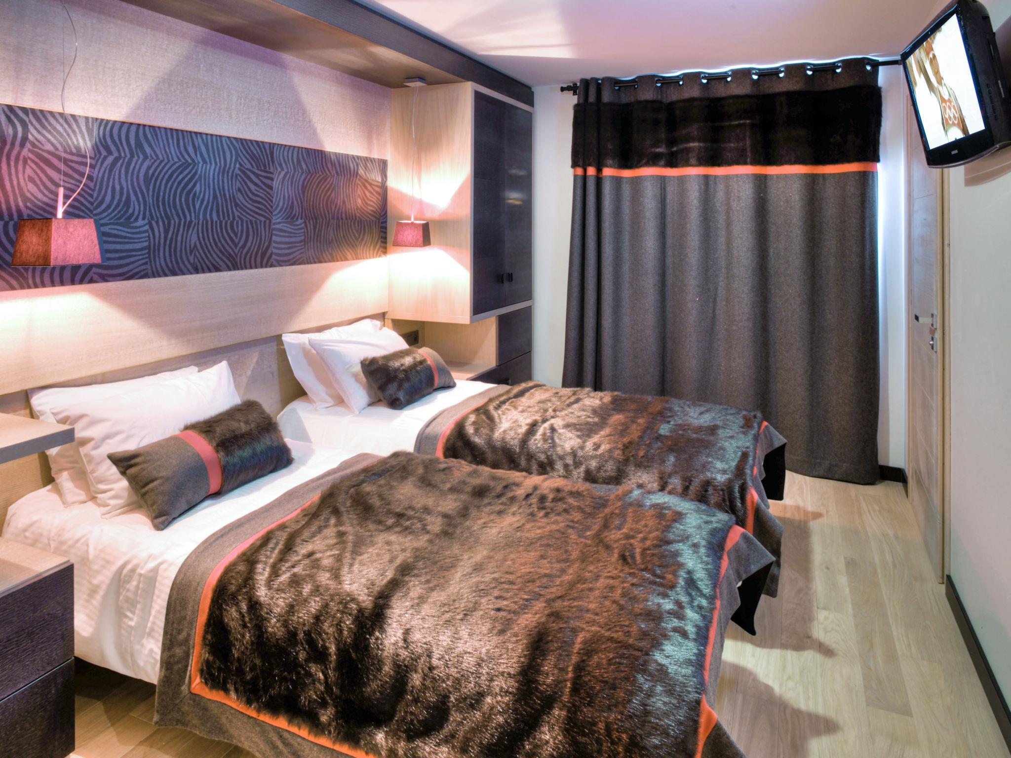 "Montana Plein Sud", 3-room apartment 55 to 60 m2. Very modern and stylish furnishings: living room with dining table and satellite TV. Exit to the balcony. 1 room with 2 beds and shower/WC. 1 room with 1 french bed and bath/WC. Kitchenette (oven, dishwasher, 2 ceramic glass hob hotplates, toaster, kettle, microwave, electric coffee machine). Electric heating. Balcony. Facilities: safe. Internet (WiFi, free).