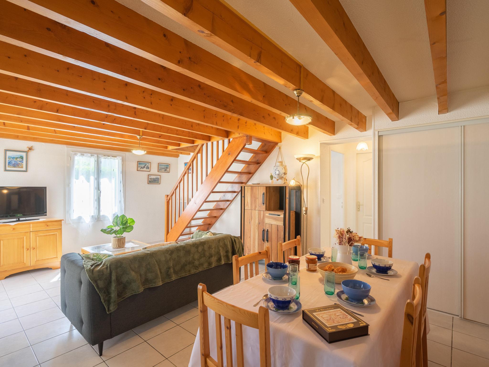4-room house 70 m2 on 2 levels. Comfortable furnishings: living/dining room with TV (flat screen). Exit to the terrace. 1 room with 1 french bed (1 x 140 cm, length 190 cm). Open kitchen (oven, dishwasher, 4 ceramic glass hob hotplates, microwave, electric coffee machine). Bathroom, sep. WC. Electric heating. Upper floor: 2 rooms, each room with 1 french bed (1 x 140 cm, length 190 cm). Terrace furniture. Facilities: washing machine, iron. Internet (WiFi, free). Parking (2 cars). Please note: smoke alarm.