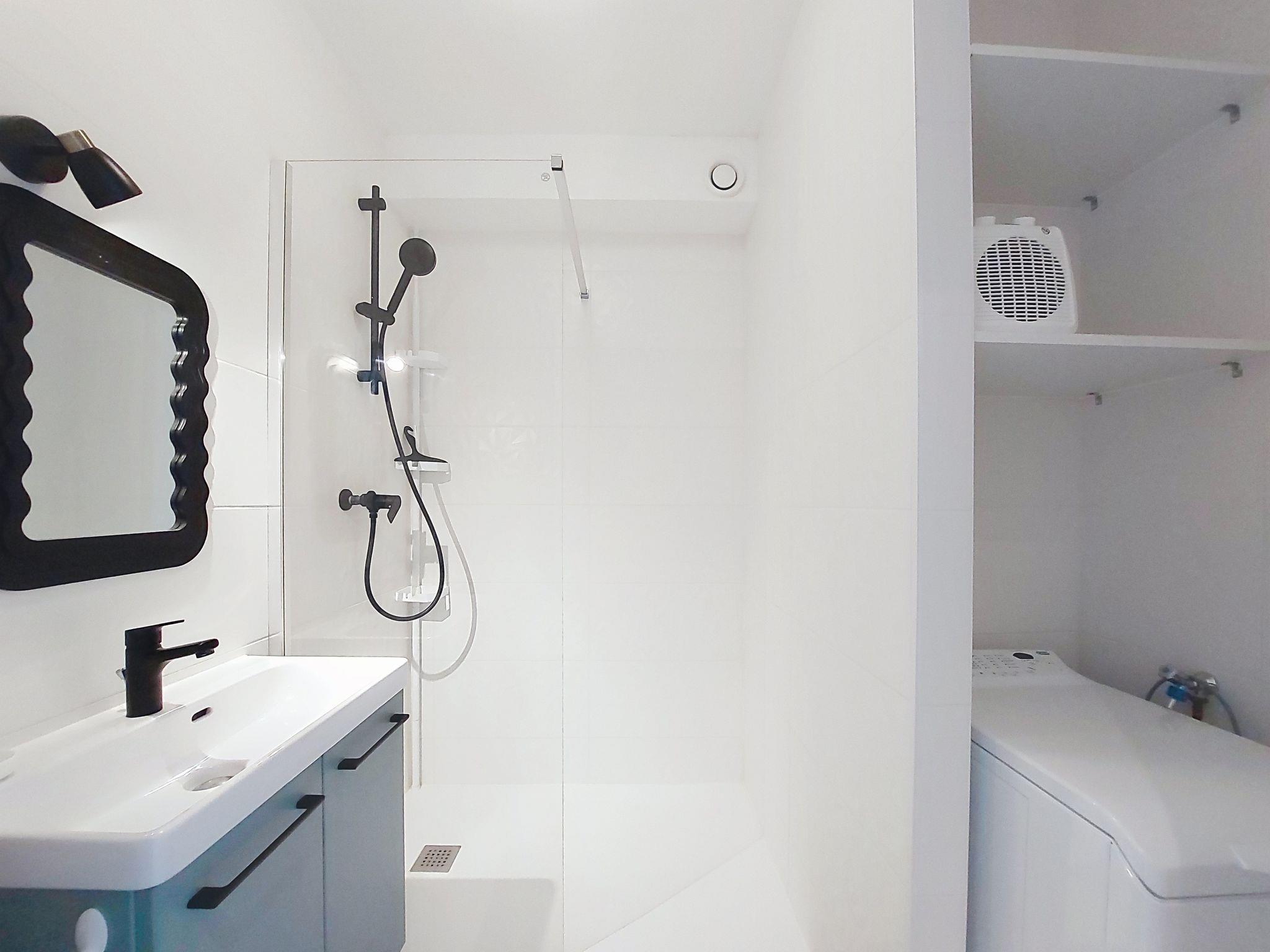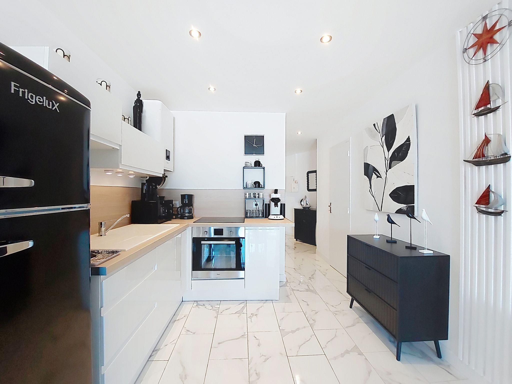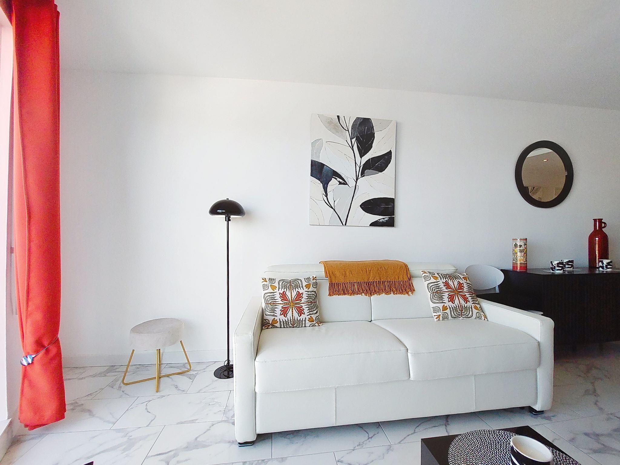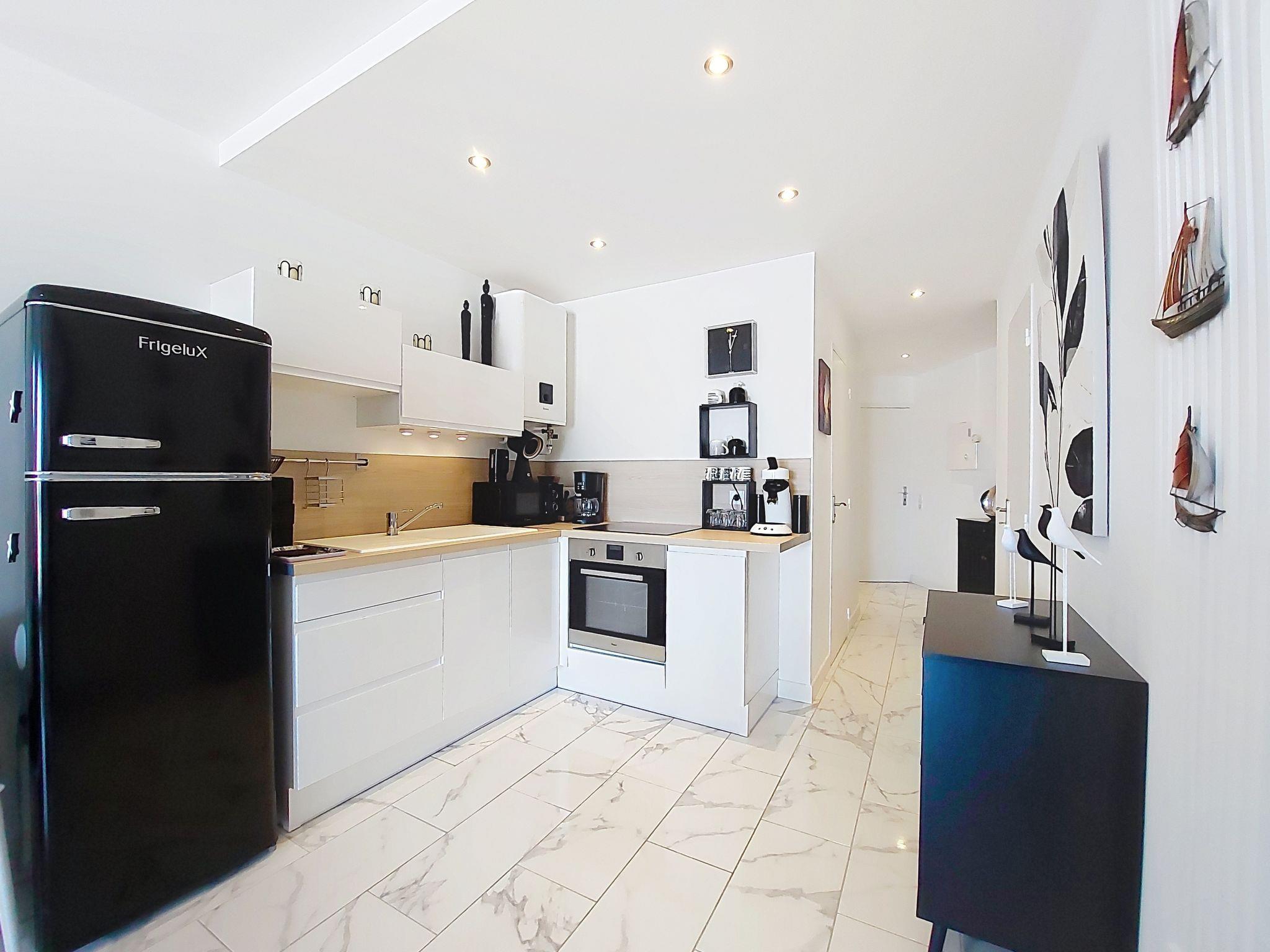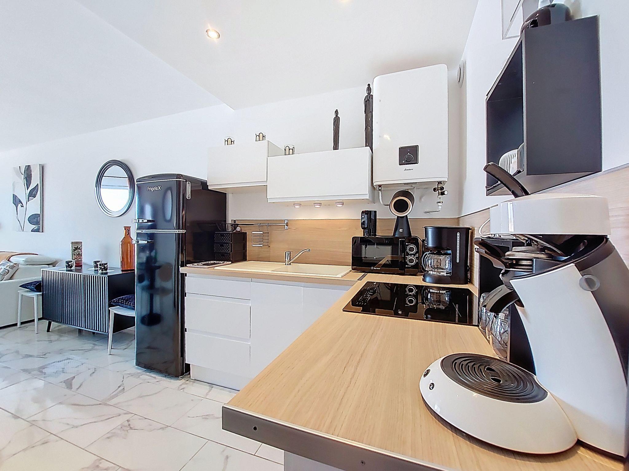 1-room studio 33 m2 on 4th floor. Fully renovated in 2025, modern furnishings: living room with 1 double sofabed (1 x 140 cm, length 190 cm), TV (flat screen). Exit to the balcony. Kitchenette (oven, 4 induction hot plates, toaster, kettle, microwave, freezer, electric coffee machine, Capsules for coffee machine (Senseo) extra). Shower, sep. WC. Electric heating. Balcony 7 m2. Balcony furniture. Side view of the sea. Facilities: washing machine, iron. Internet (WiFi, free). Parking space n 8. Please note: smoke alarm. Offer by a private individual according to Art. 155, IV of CGI.
