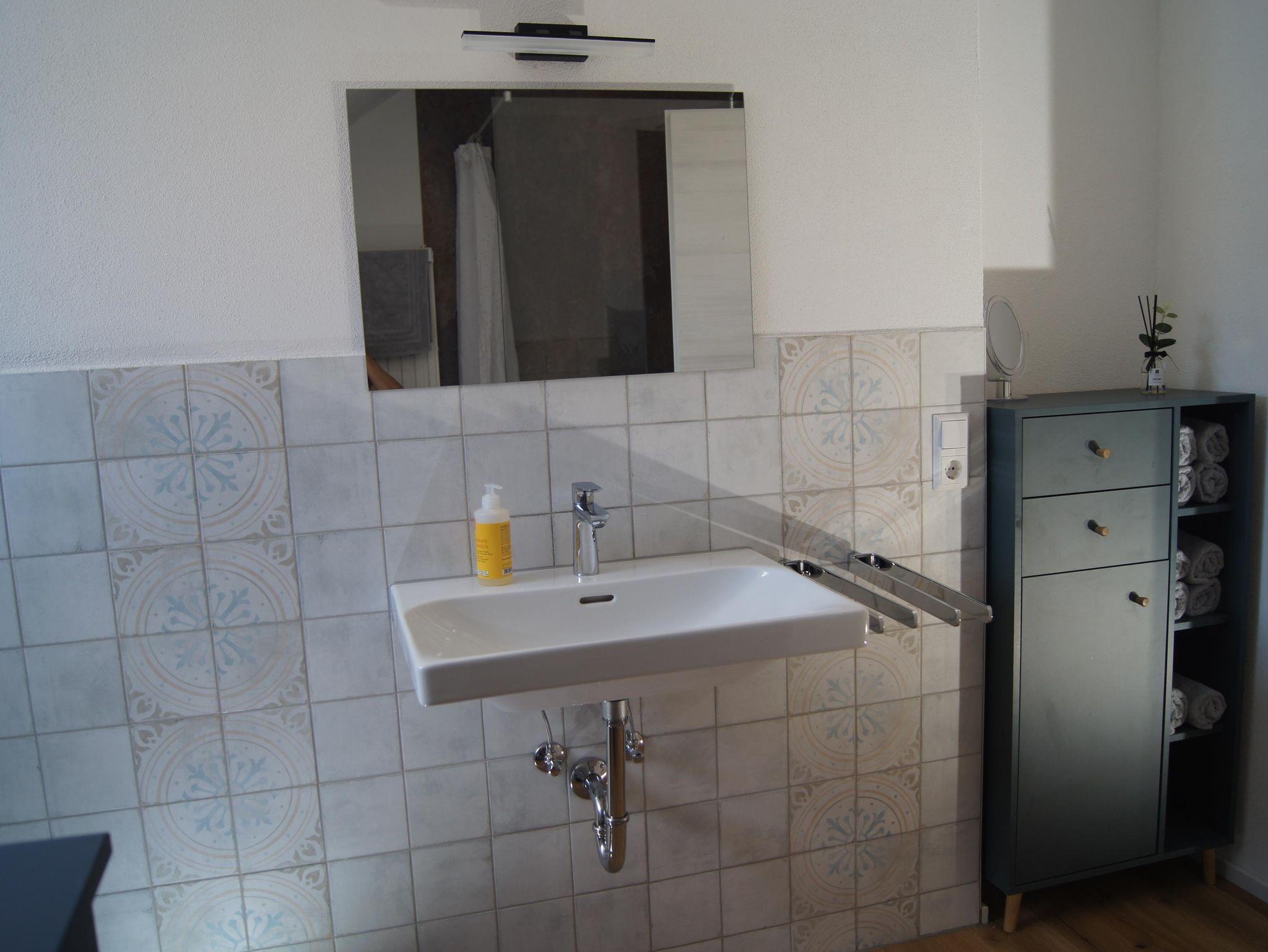 · Bad mit Dusche, Waschbecken, WC und Wasch-Trocknerkombination