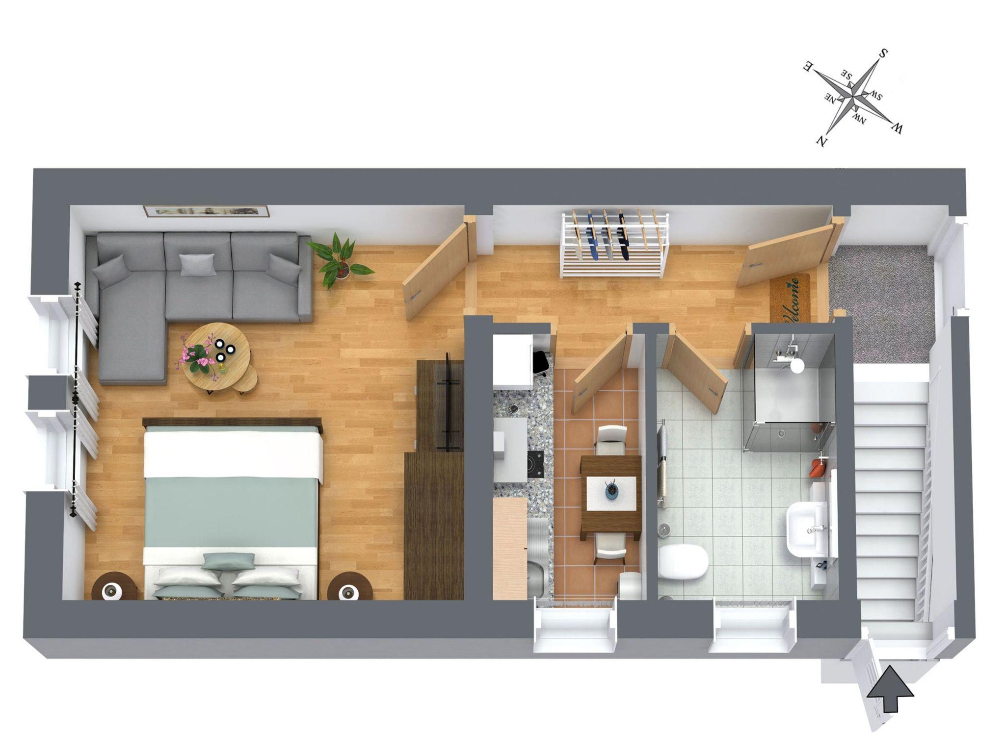 Das 30 qm große Appartement im ersten Oberschoss verfügt über ein kombiniertes Wohn-/Schlafzimmer mit Doppelbett und einen kleinen Sitzplatz. Die separate Küche ist mit 2-Platten-Herd, Kühlschrank, Mikrowelle mit Grillfunktion und vielen weiteren Küchenutensilien sowie einem kleinen Essplatz ausgestattet. Bad mit Dusche und WC.