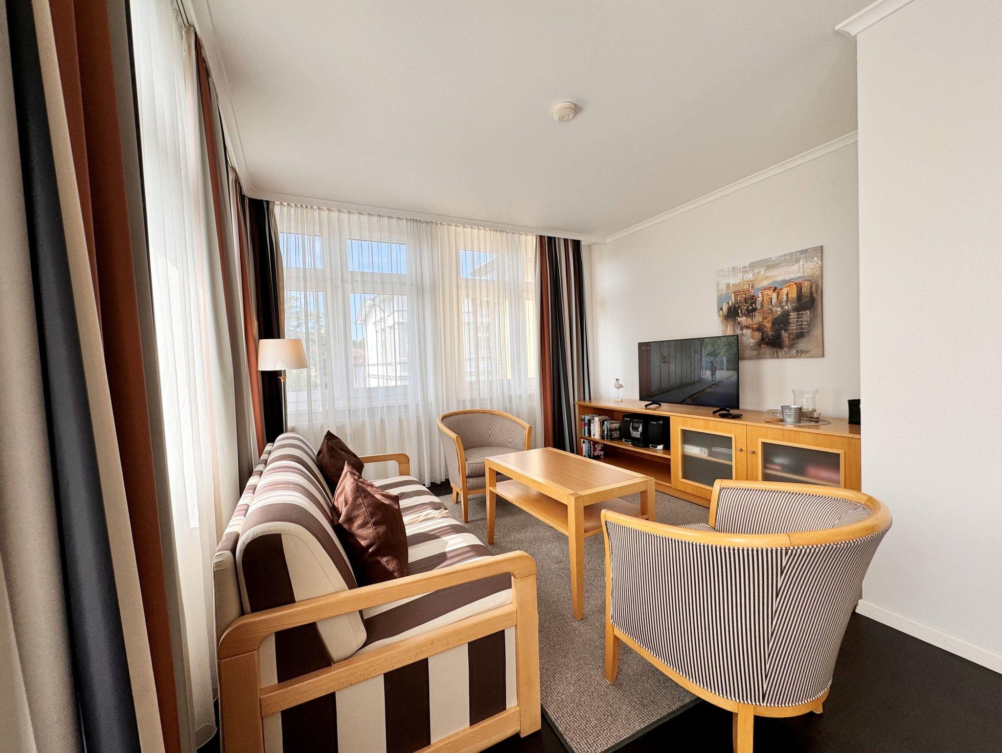 Die 50 qm große 2-Raum-Ferienwohnung befindet sich im 2. Obergeschoss (Ostlage) der Appartementanlage und ist für zwei Erwachsene ausgestattet. Die Wohnung verfügt über ein großes Wohnzimmer mit Couch, bequemen Sesseln und einen Essbereich mit 4 Stühlen. Für die Unterhaltung sorgen ein Flachbild-TV und eine Stereo-Anlage. Eine vollständig ausgestattete Küchenzeile mit Ceranherd, Backofen, Mikrowelle, Kühlschrank mit Gefrierfach und Geschirrspülmaschine lassen keine Wünsche offen. Im gemütlichen Schlafzimmer befinden sich ein Doppelbett und Kleiderschrank. Das Bad ist mit Dusche/WC, Haarfön und Kosmetikspiegel ausgestattet. Ein Balkon lädt zum Sitzen und Verweilen ein. Ein Kinderbett mit Wäsche sowie ein Hochstuhl können auf Anfrage gegen eine Gebühr von einmalig 50 € vom Verwalter zur Verfügung gestellt werden.