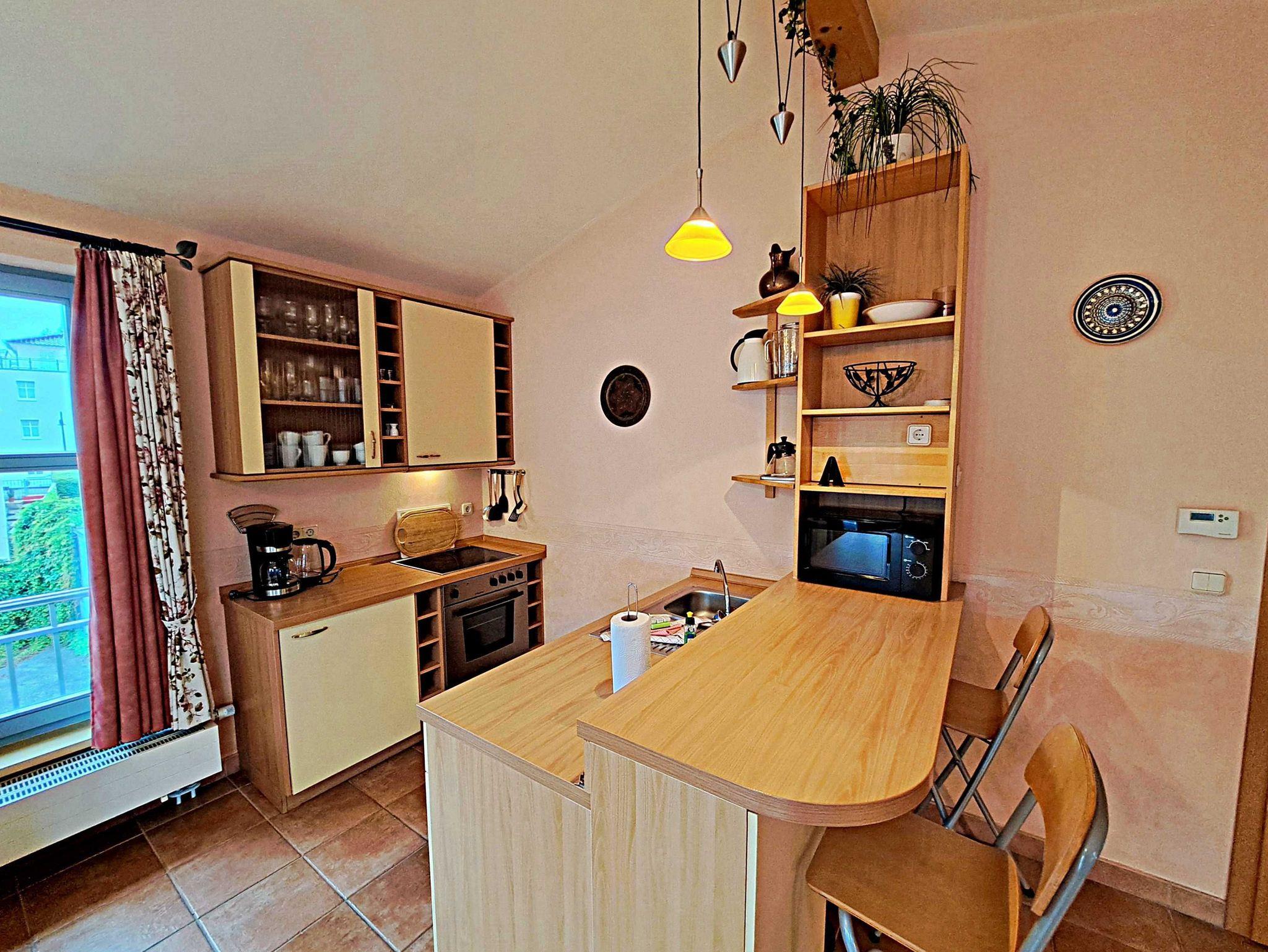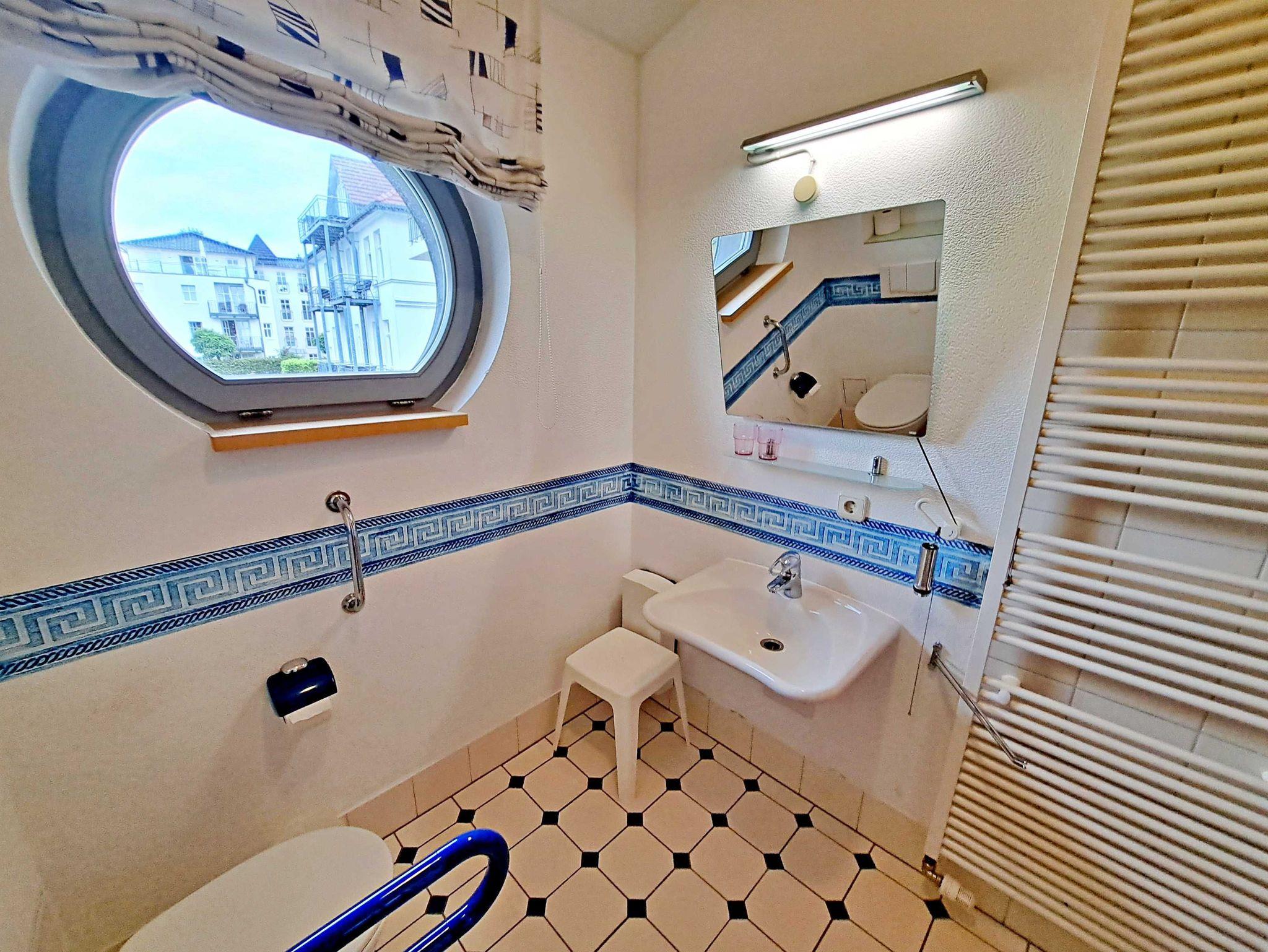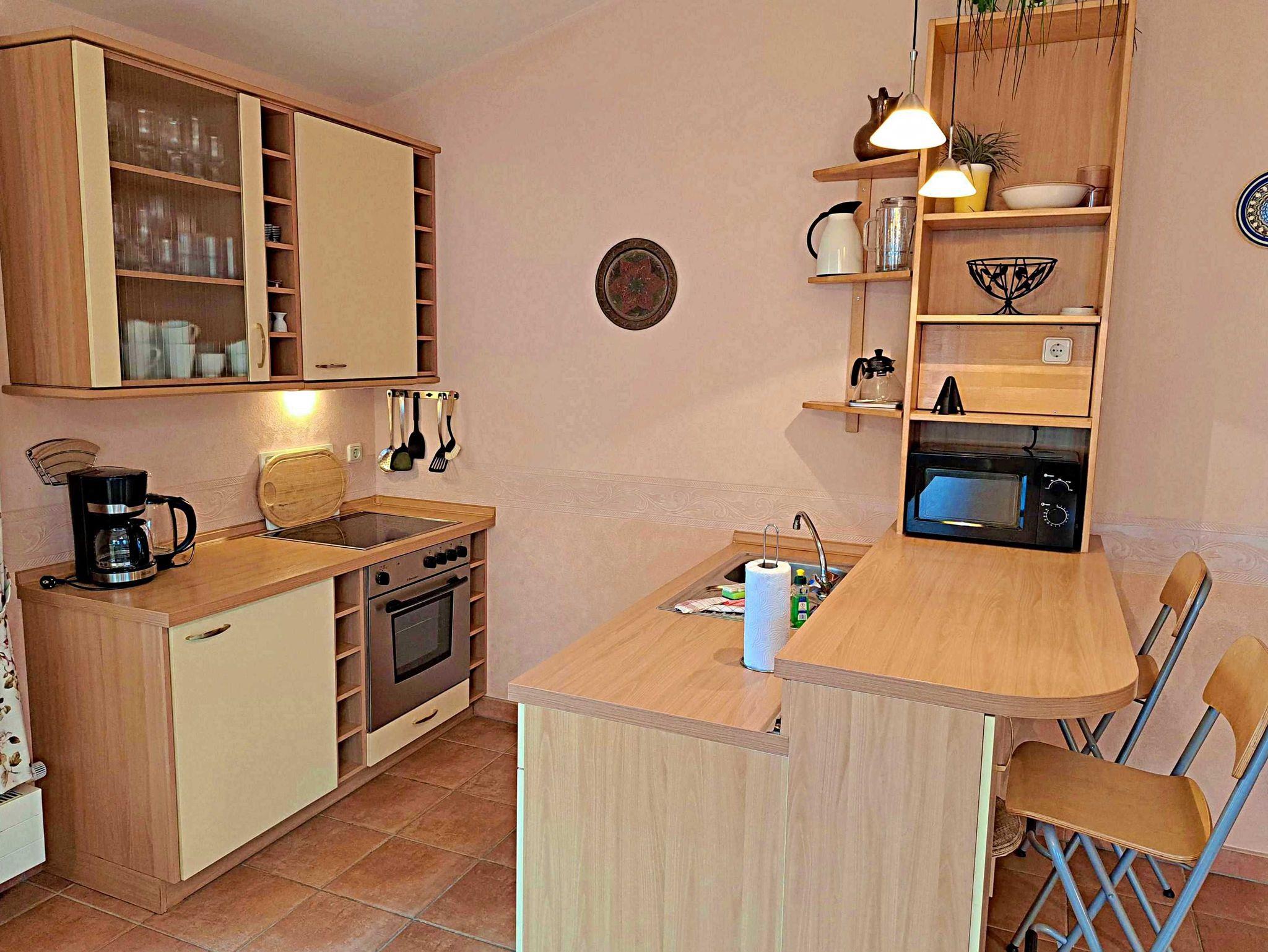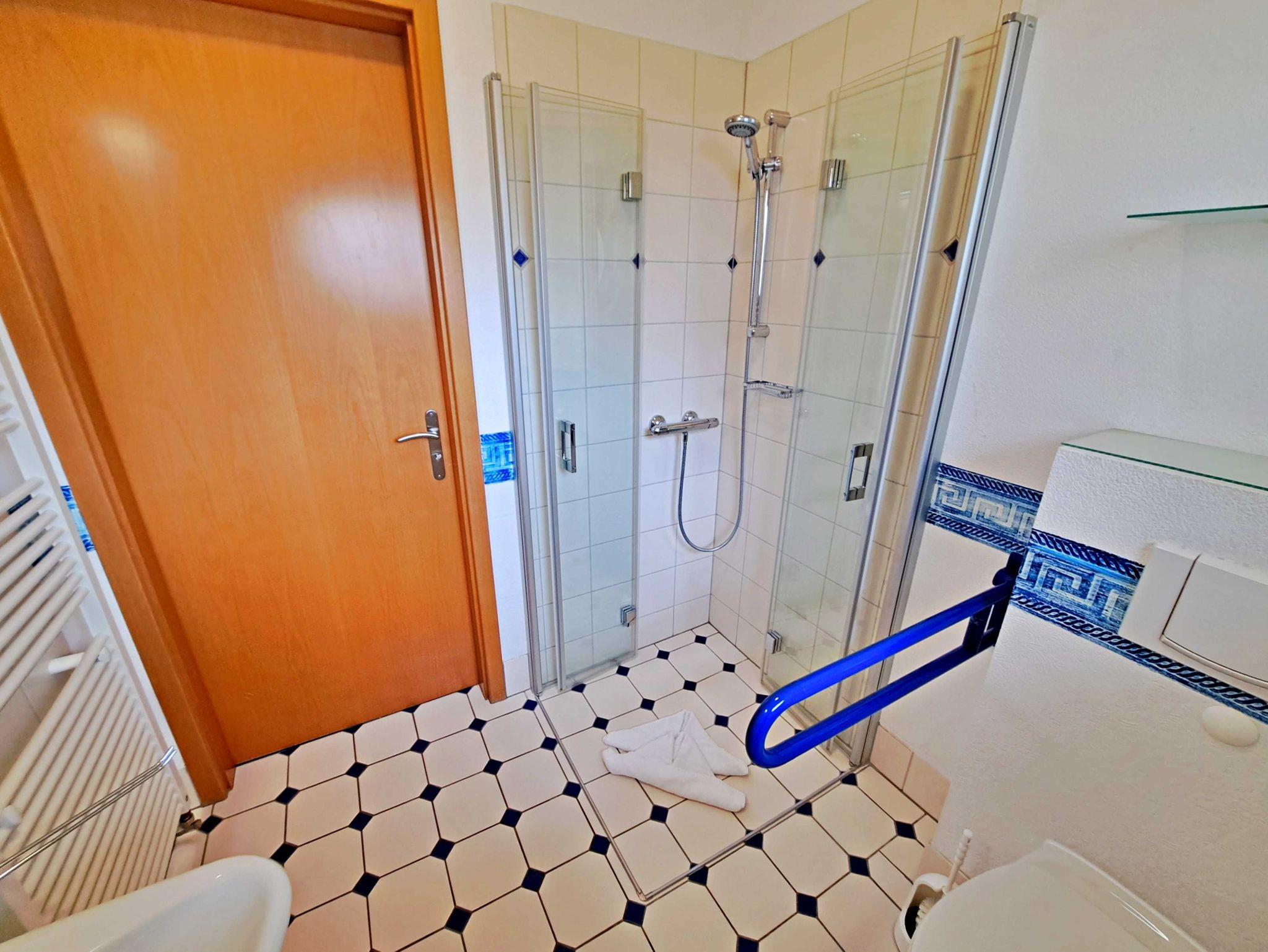 Herzlich willkommen in dieser lichtdurchfluteten, behindertenfreundlichen Wohnung! Sie erreichen die Wohnung bequem ebenerdig von der Promenade aus, auch wenn sie aufgrund des abfallenden Geländes in der ersten Etage liegt. Der großzügige Wohnbereich, der mit einem schönem Fliesenboden ausgestattet ist, lädt mit einer gemütlichen Couch, einer einladenden Sitzgruppe, Esstisch mit viel Beinfreiheit sowie Flachbild-TV und moderner Audiotechnik zum Verweilen ein. Die offene Einbauküche, die nahtlos in den Wohnbereich integriert ist, lässt keine Wünsche offen: Hier finden Sie einen Herd, Backofen, Geschirrspüler, Mikrowelle, Kaffeemaschine, Wasserkocher und ausreichend Geschirr, um Ihre kulinarischen Ideen umzusetzen. Das separate Schlafzimmer bietet ein behindertenfreundliches Bett mit hoher Einstiegshöhe, einen geräumigen Kleiderschrank und einen gemütlichen Teppichboden. Das Tageslicht-Bad ist mit einer absatzfreien Dusche und einem WC mit Haltegriffen ausgestattet, was zusätzlichen Komfort bietet. Ein besonderes Highlight ist der halbrunde Südbalkon, der über zwei Flügeltüren vom Wohnzimmer aus zugänglich ist. Hier können Sie bereits am Morgen bei schönem Wetter Ihren Kaffee genießen oder den Abend entspannt mit einem Glas Wein ausklingen lassen. Für Ihren eigenen Pkw steht Ihnen ein Parkplatz direkt am Haus zur Verfügung, und Ihre Fahrräder können sicher in der eigenen Abstellkammer auf dem Grundstück untergebracht werden. Zudem stehen Ihnen eine Münzwaschmaschine und ein Münztrockner zur Verfügung. WLAN ist in der gesamten Wohnung kostenfrei für Sie zugänglich. Bitte beachten Sie, dass eine Kaution in Höhe von 100 Euro für die Funk-Fernbedienung zum Befahren der Promenade erhoben wird.