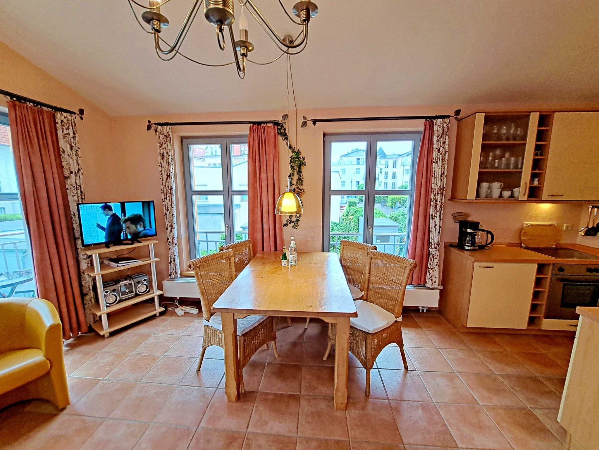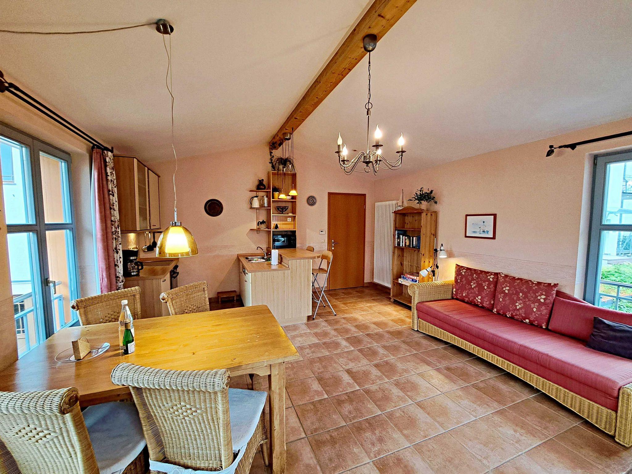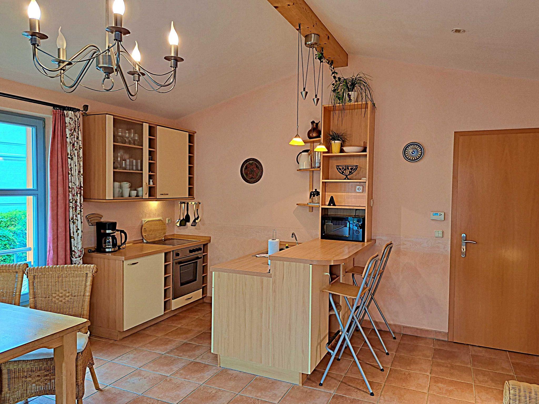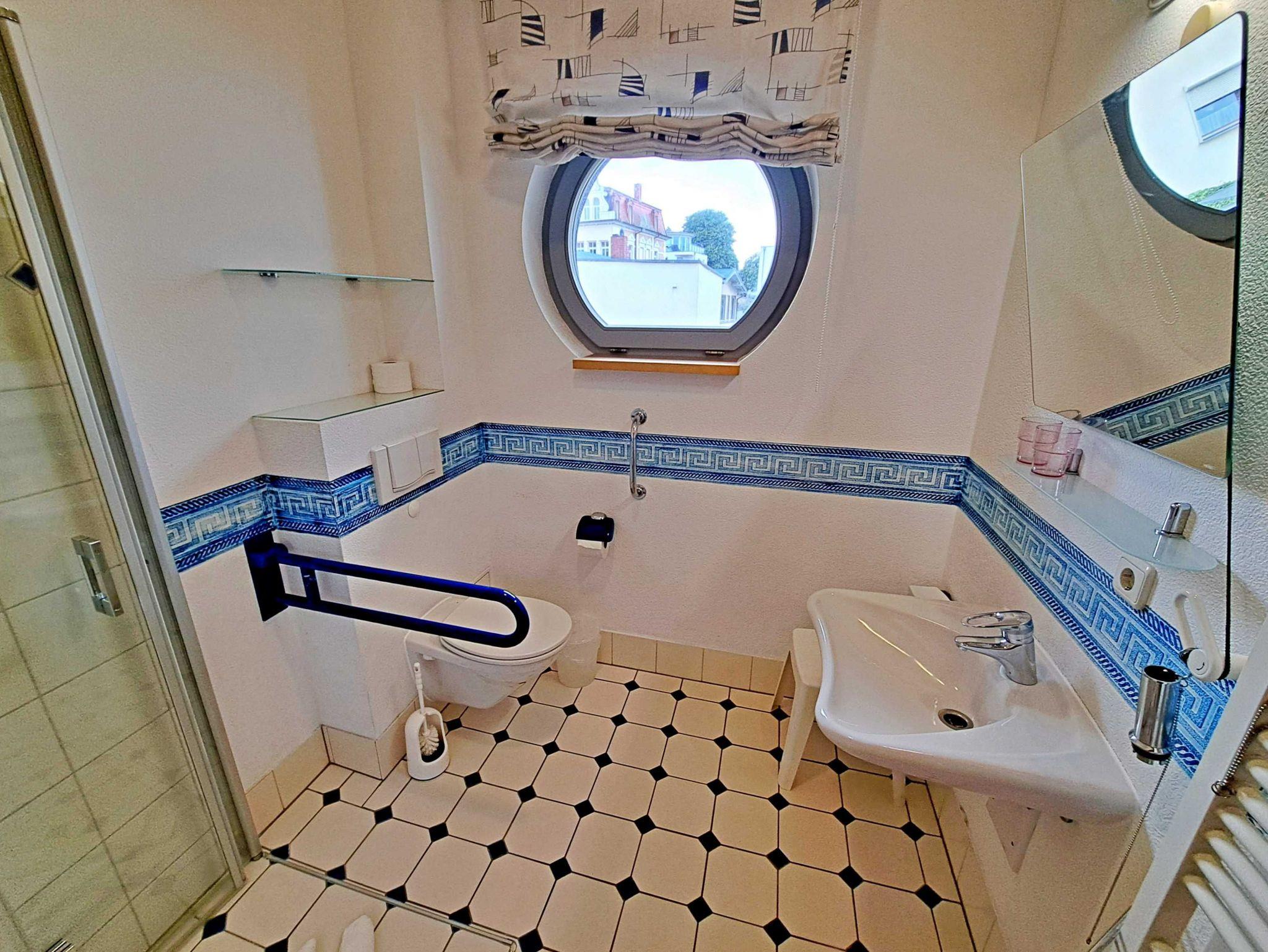Herzlich willkommen in dieser lichtdurchfluteten, behindertenfreundlichen Wohnung! Sie erreichen die Wohnung bequem ebenerdig von der Promenade aus, auch wenn sie aufgrund des abfallenden Geländes in der ersten Etage liegt. Der großzügige Wohnbereich, der mit einem schönem Fliesenboden ausgestattet ist, lädt mit einer gemütlichen Couch, einer einladenden Sitzgruppe, Esstisch mit viel Beinfreiheit sowie Flachbild-TV und moderner Audiotechnik zum Verweilen ein. Die offene Einbauküche, die nahtlos in den Wohnbereich integriert ist, lässt keine Wünsche offen: Hier finden Sie einen Herd, Backofen, Geschirrspüler, Mikrowelle, Kaffeemaschine, Wasserkocher und ausreichend Geschirr, um Ihre kulinarischen Ideen umzusetzen. Das separate Schlafzimmer bietet ein behindertenfreundliches Bett mit hoher Einstiegshöhe, einen geräumigen Kleiderschrank und einen gemütlichen Teppichboden. Das Tageslicht-Bad ist mit einer absatzfreien Dusche und einem WC mit Haltegriffen ausgestattet, was zusätzlichen Komfort bietet. Ein besonderes Highlight ist der halbrunde Südbalkon, der über zwei Flügeltüren vom Wohnzimmer aus zugänglich ist. Hier können Sie bereits am Morgen bei schönem Wetter Ihren Kaffee genießen oder den Abend entspannt mit einem Glas Wein ausklingen lassen. Für Ihren eigenen Pkw steht Ihnen ein Parkplatz direkt am Haus zur Verfügung, und Ihre Fahrräder können sicher in der eigenen Abstellkammer auf dem Grundstück untergebracht werden. Zudem stehen Ihnen eine Münzwaschmaschine und ein Münztrockner zur Verfügung. WLAN ist in der gesamten Wohnung kostenfrei für Sie zugänglich. Bitte beachten Sie, dass eine Kaution in Höhe von 100 Euro für die Funk-Fernbedienung zum Befahren der Promenade erhoben wird.