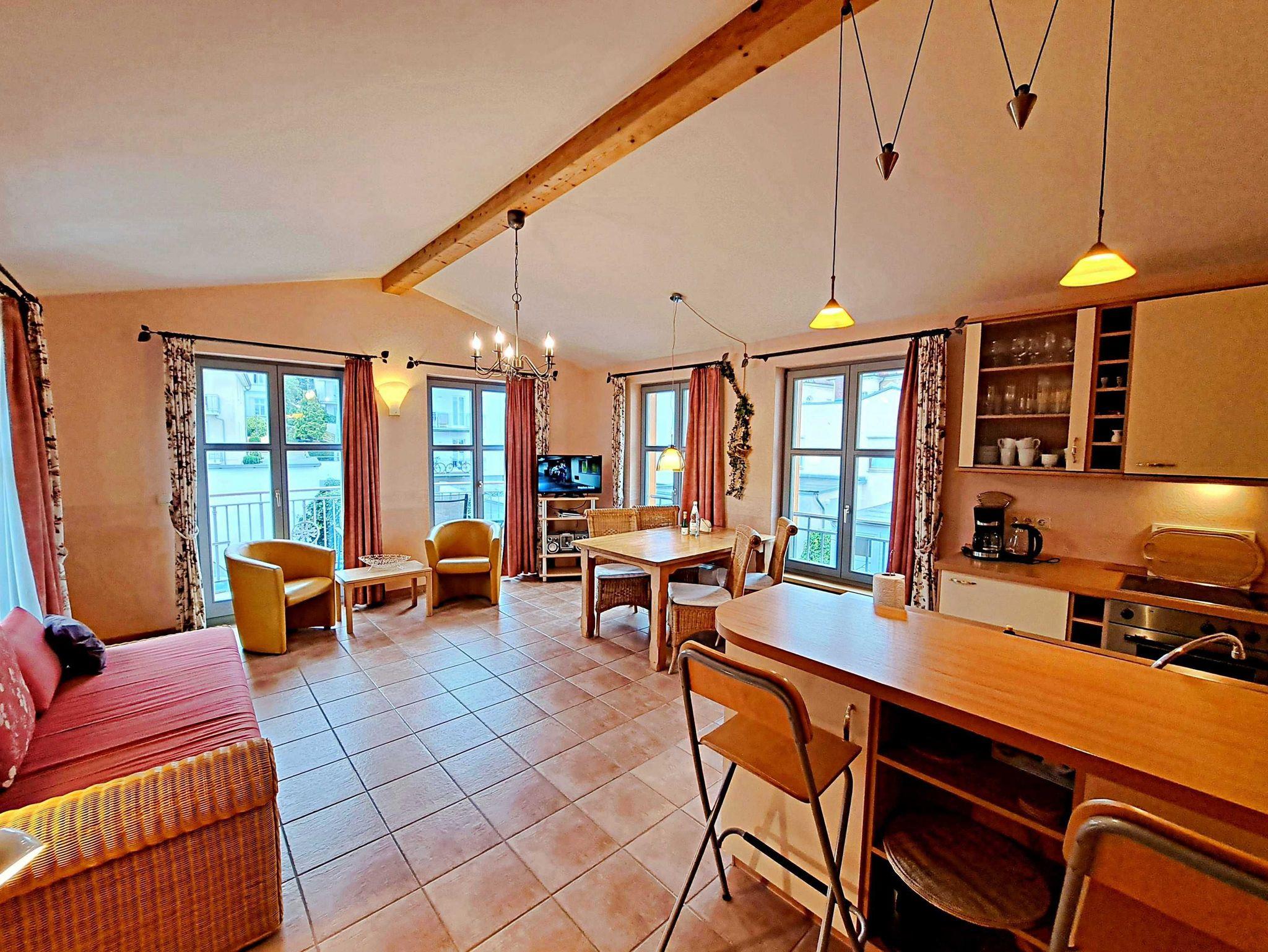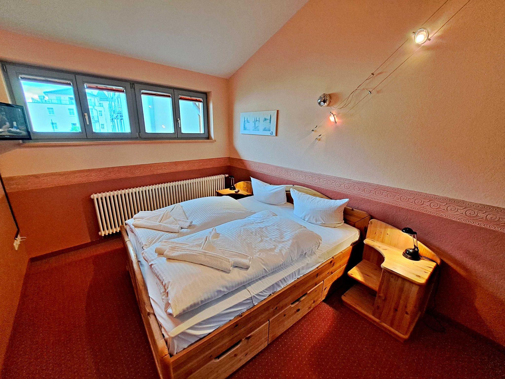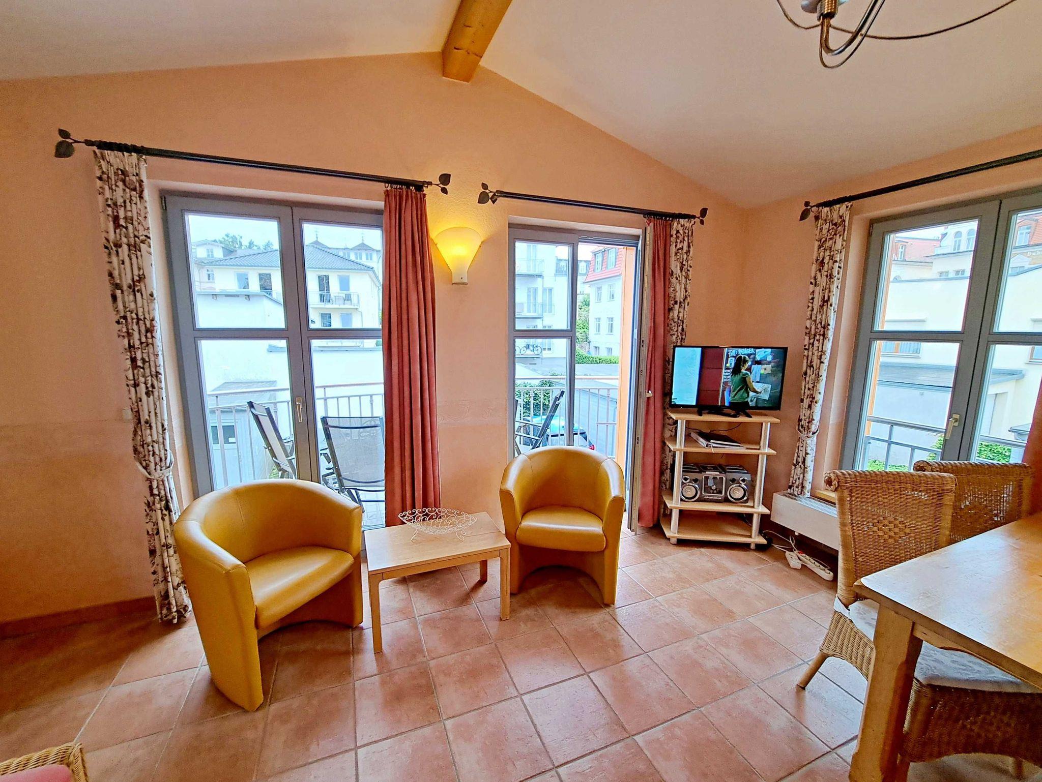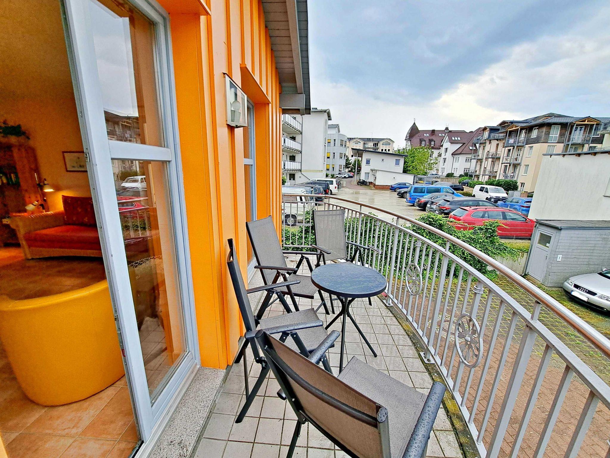Herzlich willkommen in dieser lichtdurchfluteten, behindertenfreundlichen Wohnung! Sie erreichen die Wohnung bequem ebenerdig von der Promenade aus, auch wenn sie aufgrund des abfallenden Geländes in der ersten Etage liegt. Der großzügige Wohnbereich, der mit einem schönem Fliesenboden ausgestattet ist, lädt mit einer gemütlichen Couch, einer einladenden Sitzgruppe, Esstisch mit viel Beinfreiheit sowie Flachbild-TV und moderner Audiotechnik zum Verweilen ein. Die offene Einbauküche, die nahtlos in den Wohnbereich integriert ist, lässt keine Wünsche offen: Hier finden Sie einen Herd, Backofen, Geschirrspüler, Mikrowelle, Kaffeemaschine, Wasserkocher und ausreichend Geschirr, um Ihre kulinarischen Ideen umzusetzen. Das separate Schlafzimmer bietet ein behindertenfreundliches Bett mit hoher Einstiegshöhe, einen geräumigen Kleiderschrank und einen gemütlichen Teppichboden. Das Tageslicht-Bad ist mit einer absatzfreien Dusche und einem WC mit Haltegriffen ausgestattet, was zusätzlichen Komfort bietet. Ein besonderes Highlight ist der halbrunde Südbalkon, der über zwei Flügeltüren vom Wohnzimmer aus zugänglich ist. Hier können Sie bereits am Morgen bei schönem Wetter Ihren Kaffee genießen oder den Abend entspannt mit einem Glas Wein ausklingen lassen. Für Ihren eigenen Pkw steht Ihnen ein Parkplatz direkt am Haus zur Verfügung, und Ihre Fahrräder können sicher in der eigenen Abstellkammer auf dem Grundstück untergebracht werden. Zudem stehen Ihnen eine Münzwaschmaschine und ein Münztrockner zur Verfügung. WLAN ist in der gesamten Wohnung kostenfrei für Sie zugänglich. Bitte beachten Sie, dass eine Kaution in Höhe von 100 Euro für die Funk-Fernbedienung zum Befahren der Promenade erhoben wird.