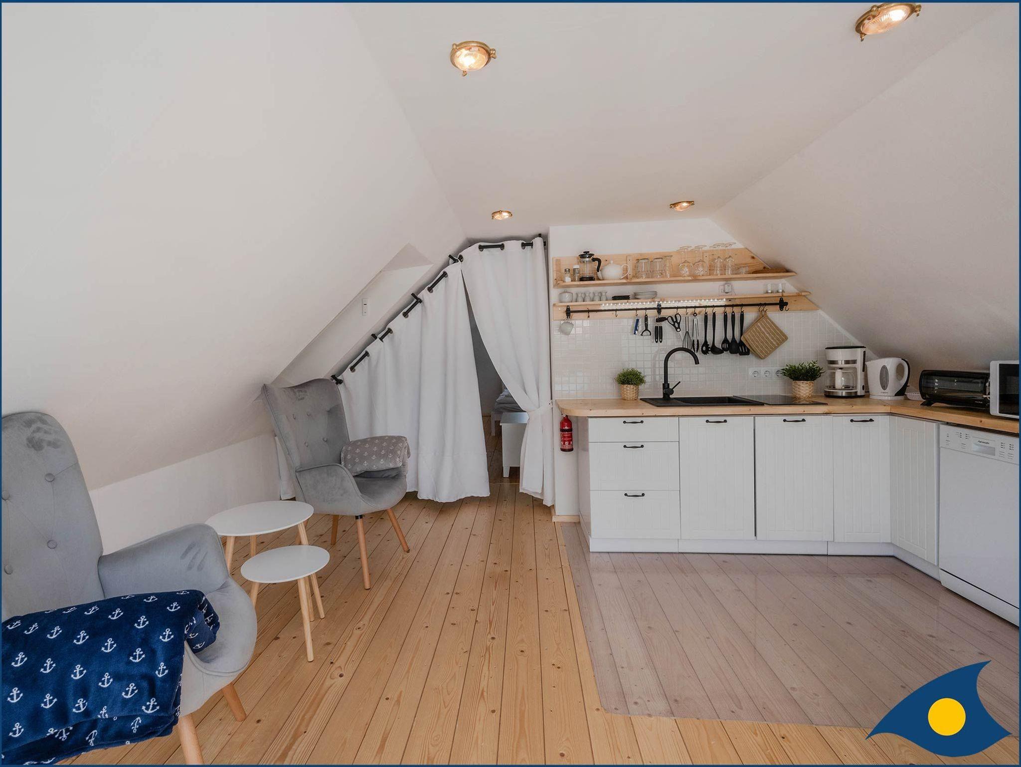Das offene Atelier im Dachgeschoss, mit maritimer Einrichtung hat einen gemütlichen Wohnküchenbereich mit Balkon. Die Küche ist ausgestattet mit zwei Kochplatten, Geschirrspüler, Kühlschrank, Mikrowelle und Minibackofen. TV, WLAN und Klimaanlage sind vorhanden. Bitte beachten Sie, das aufgrund der Dachkonstuktion die Deckenhöhe maximal 2.12m beträgt.