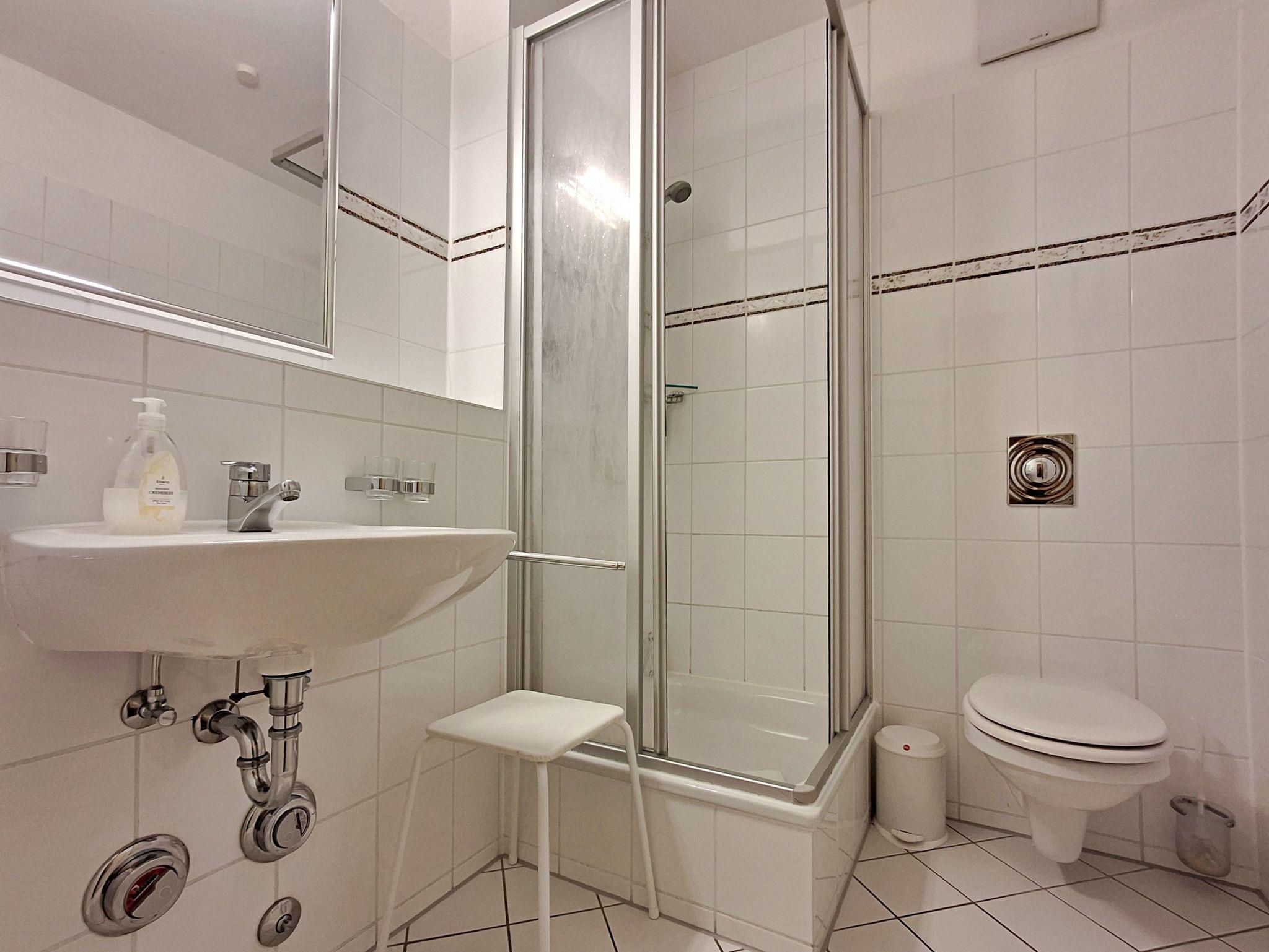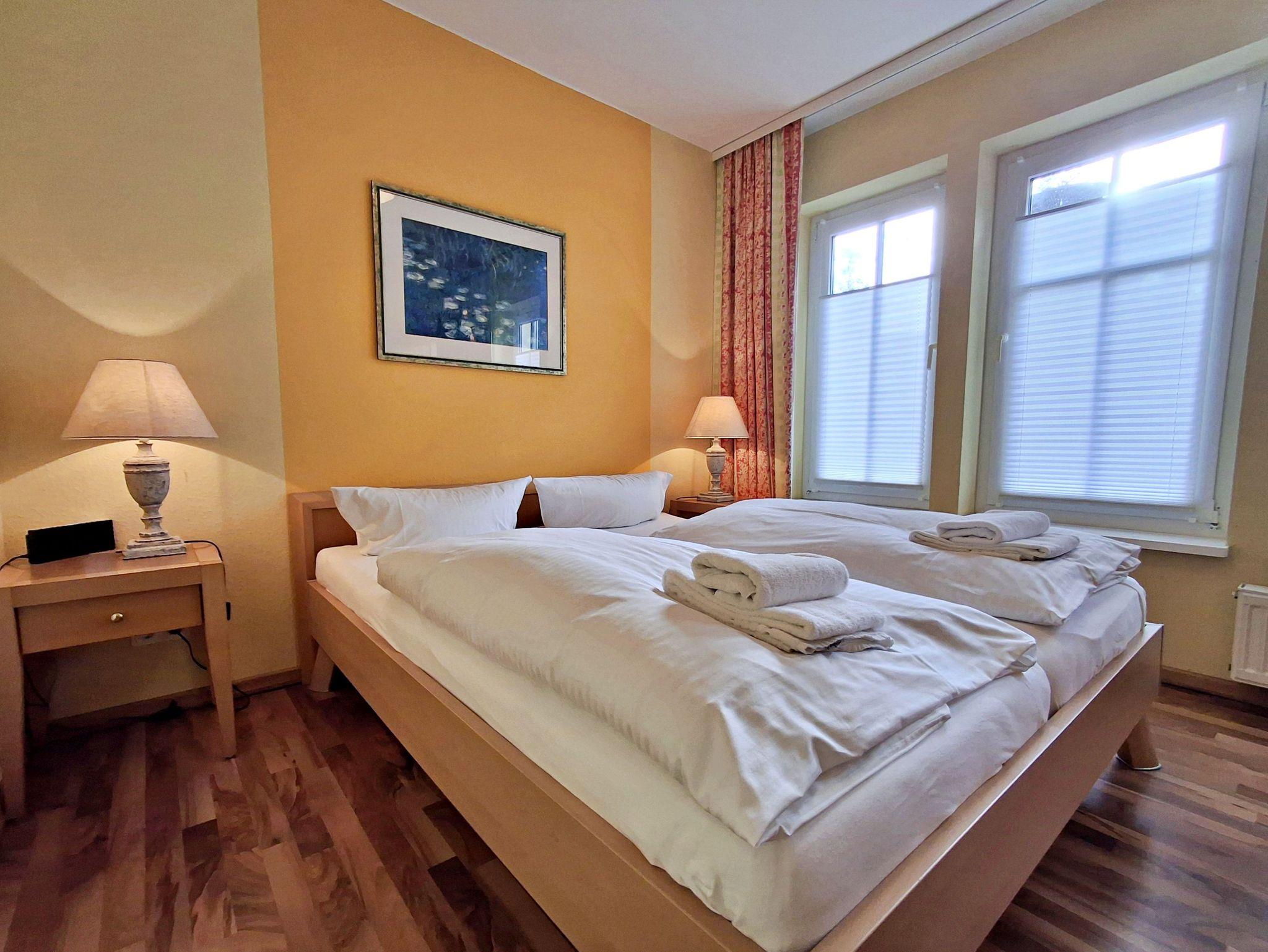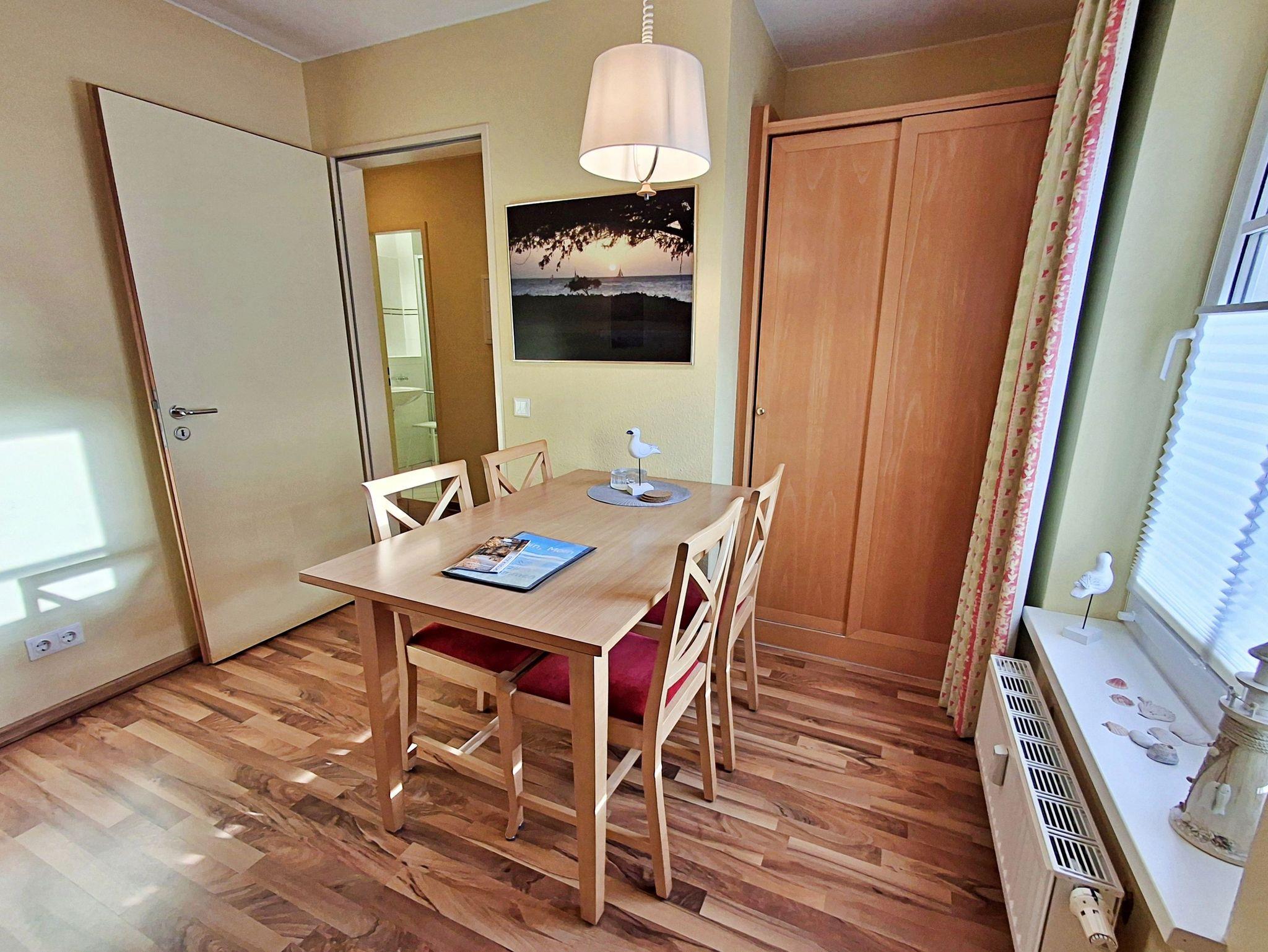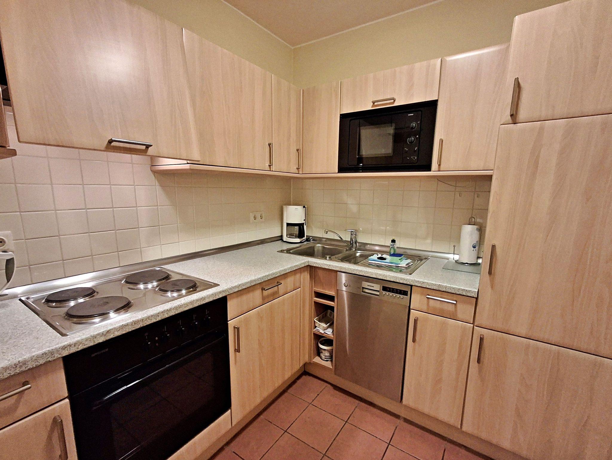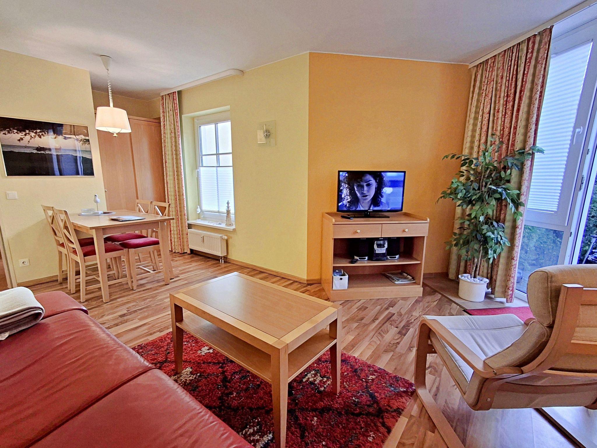 Die 46 qm große 2-Raum-Ferienwohnung befindet sich im Erdgeschoss (Süd-Westlage) der Appartementanlage und ist für 2 Personen ausgerichtet. Die Wohnung verfügt über ein Wohnzimmer mit bequemer Couch, Fernsehsessel sowie eine Essecke mit 4 Stühlen. Für die Unterhaltung sorgt ein Flachbild-TV und eine Stereo-Anlage. Die vollständig ausgestattete separate Küche mit 4-Plattenherd, Backofen, Mikrowelle, Kühlschrank mit Gefrierfach und Spülmaschine lässt keine Wünsche offen. Im Schlafzimmer befindet sich ein Doppelbett (2,10 m lang) mit in Höhe und Festigkeit verstellbarem Lattenrost. Das Bad ist mit Dusche/WC und Haarfön ausgestattet. Eine Terrasse lädt zum Sitzen und Verweilen ein. W-LAN steht Ihnen in der gesamten Wohnung kostenfrei zur Verfügung.