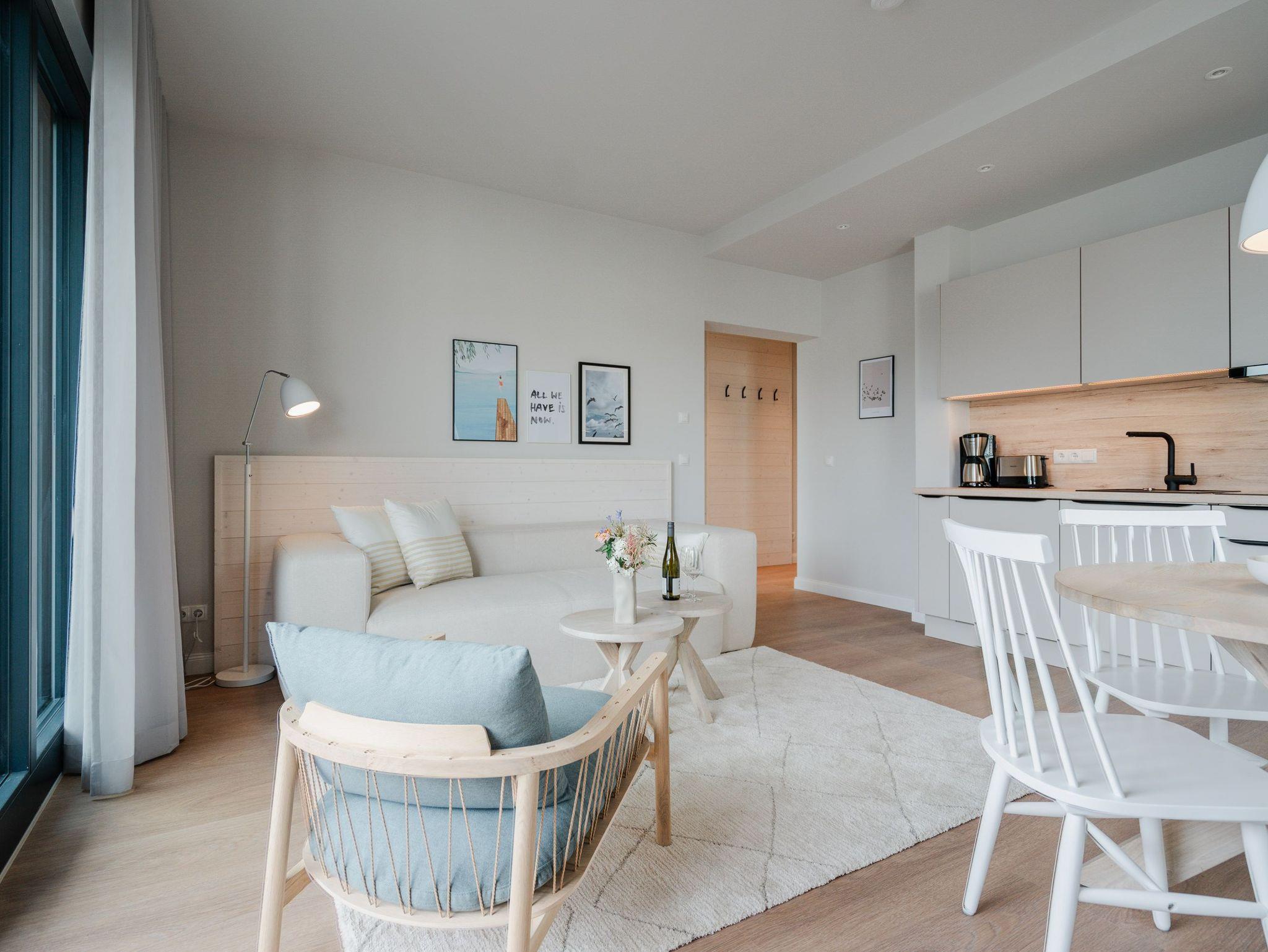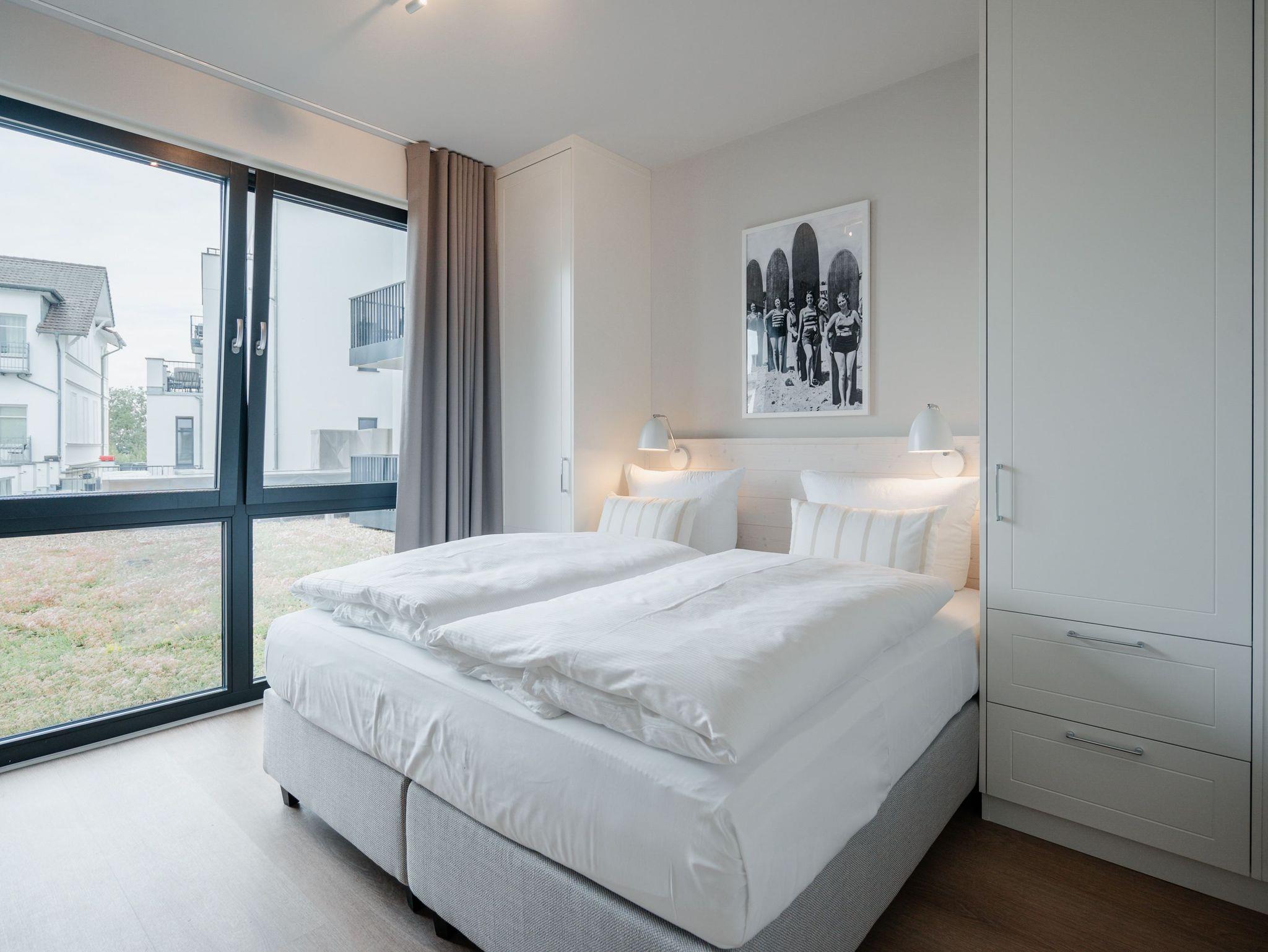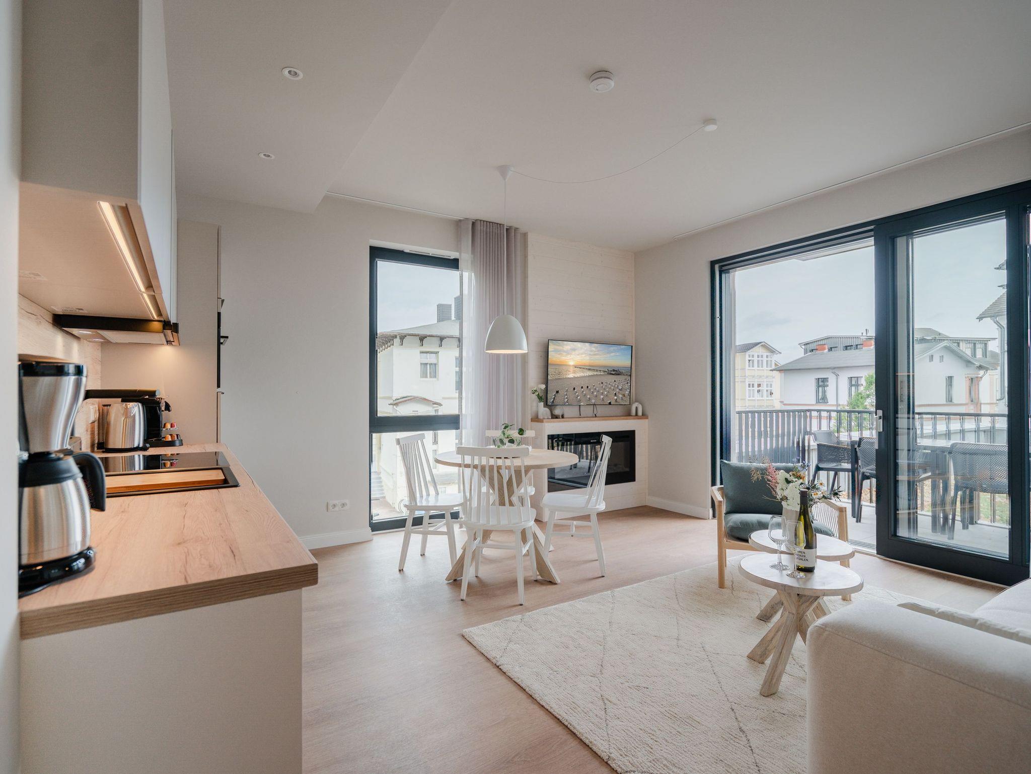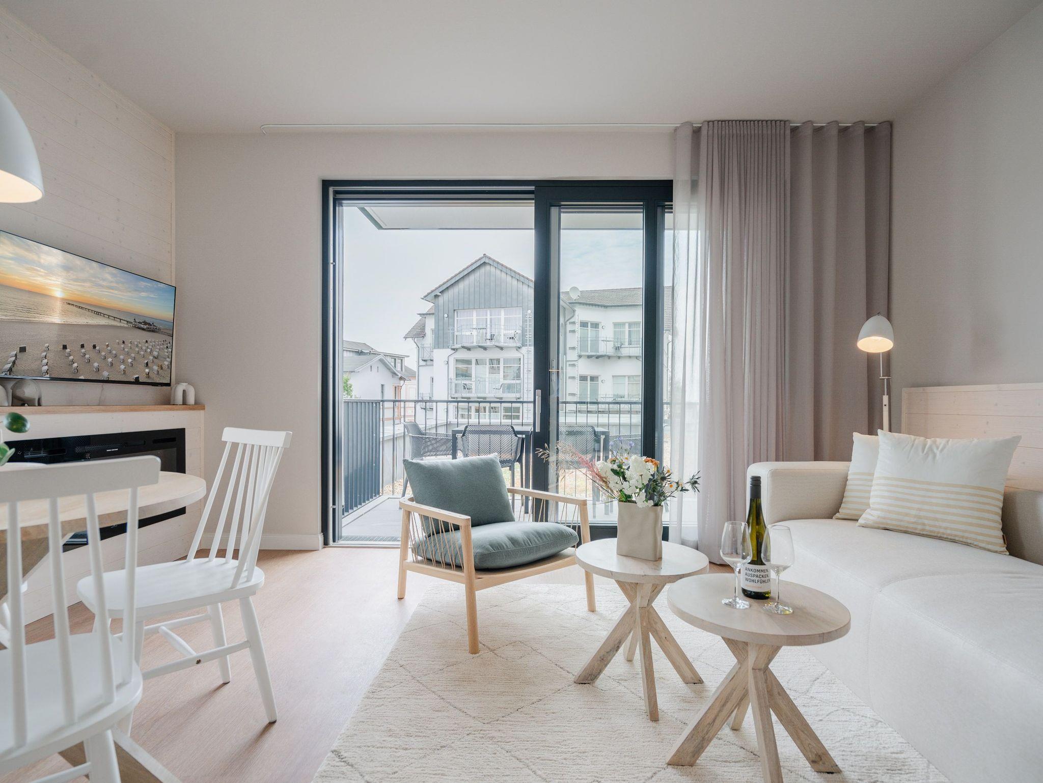Wer nordisches Design mag, wird sich auf Anhieb in dieses stilvolle Urlaubszuhause für bis zu 4 Personen verlieben. Die 62 Quadratmeter des 3-Raum-Appartements B 1.8 im Haus B der Strandterrasse sind ein absoluter Wohntraum. Hier werden Sie sich von der ersten Sekunde an wohlfühlen. Das mit viel Liebe eingerichtete Feriendomizil wartet mit einem geräumigen Wohn-Esszimmer auf. Eine Relaxarea mit Geschmack und viel Komfort. Warme Farben sorgen für viel Gemütlichkeit. Das Sofa nebst superschönem und vor allem bequemem Sessel eignet sich wunderbar zum Entspannen und für Filmabende auf dem Flat-TV (43 Zoll). Eine romantische Atmosphäre verströmt der Elektrokamin (ohne Wärmeabgabe). Die zum Wohnzimmer hin offene Küche ist mit modernen Elektrogeräten ausgestattet. Dazu gehören ein Backofen, ein 4-Platten-Induktionsherd, ein Geschirrspüler, ein Toaster, eine Kaffeemaschine und einer Nespresso-Kapselmaschine. Genießen Sie das Essen gemeinsam am Esstisch, der auch ausreichend Platz für Spieleabende bietet. Was jedoch wäre ein Ostseeurlaub ohne Ostsee? Vom Wohnzimmer aus können Sie auf einen Nord-Ost-Balkon hinaustreten, von dem aus Sie seitlich aufs Meer hinausschauen können. Atmen Sie die frische Luft tief ein. Essen unter freiem Himmel wird am Balkontisch mit vier Stühlen möglich ? wenn nicht gerade der Strand ruft. Da Meeresluft bekanntlich müde macht, werden Sie in den komfortablen Boxspringdoppelbetten (2,00m x 2,00m und 1,80m x2,00m) in den beiden Schlafzimmern ganz sicher wunderbar schlafen können. Jedes Schlafzimmer verfügt zudem über einen großen Kleiderschrank und einen Flat-TV (43 Zoll). Zwei moderne Duschbäder mit Waschtisch und WC bieten Ihnen allen Komfort und Privatsphäre. Parken Sie bequem auf dem zu Ihrer Wohnung gehörenden PKW-Stellplatz. Mehr braucht es für einen erholsamen Urlaub am Meer nicht. Wir wünschen Ihnen ein schönes Ankommen, Auspacken und Wohlfühlen.