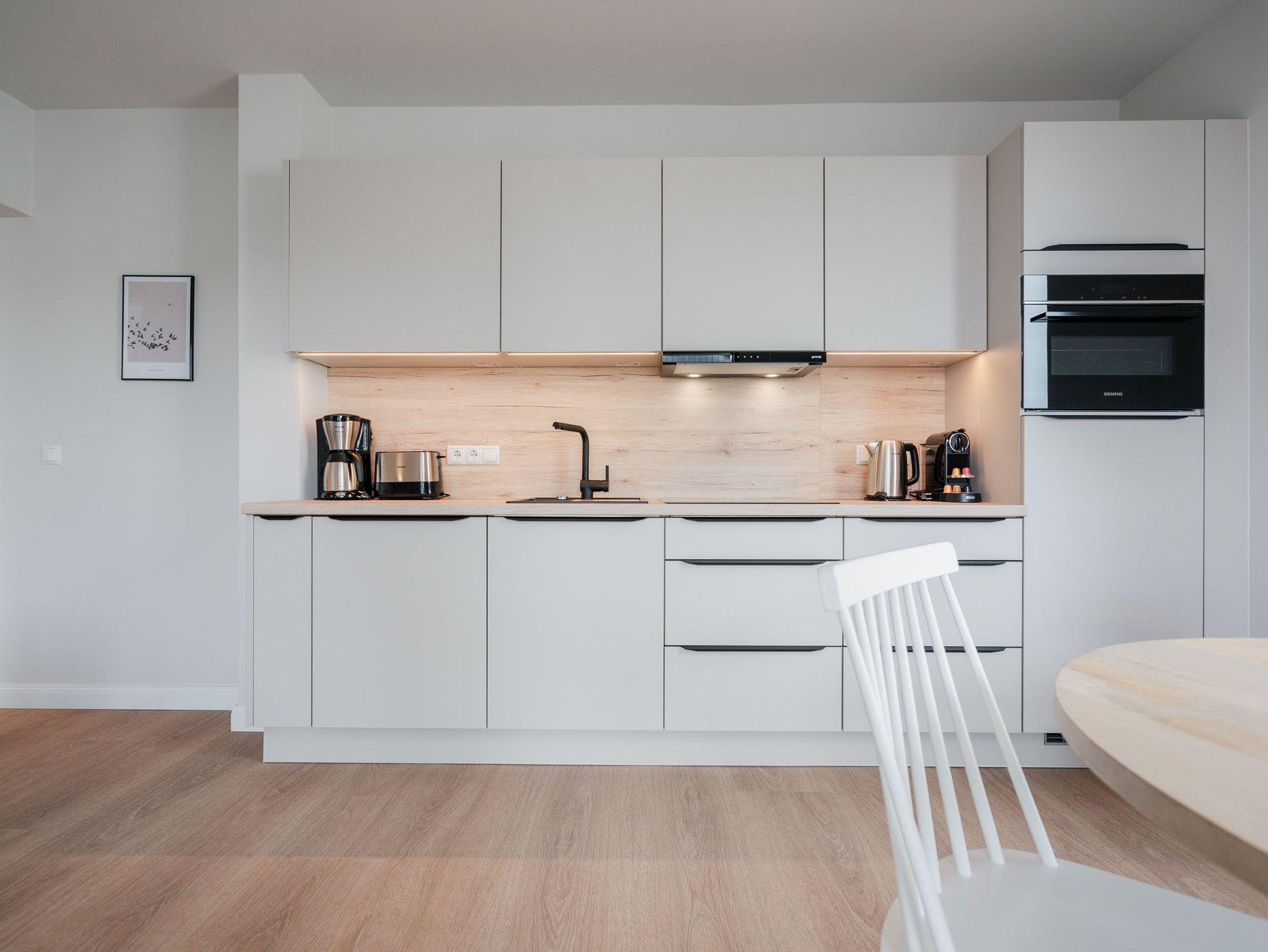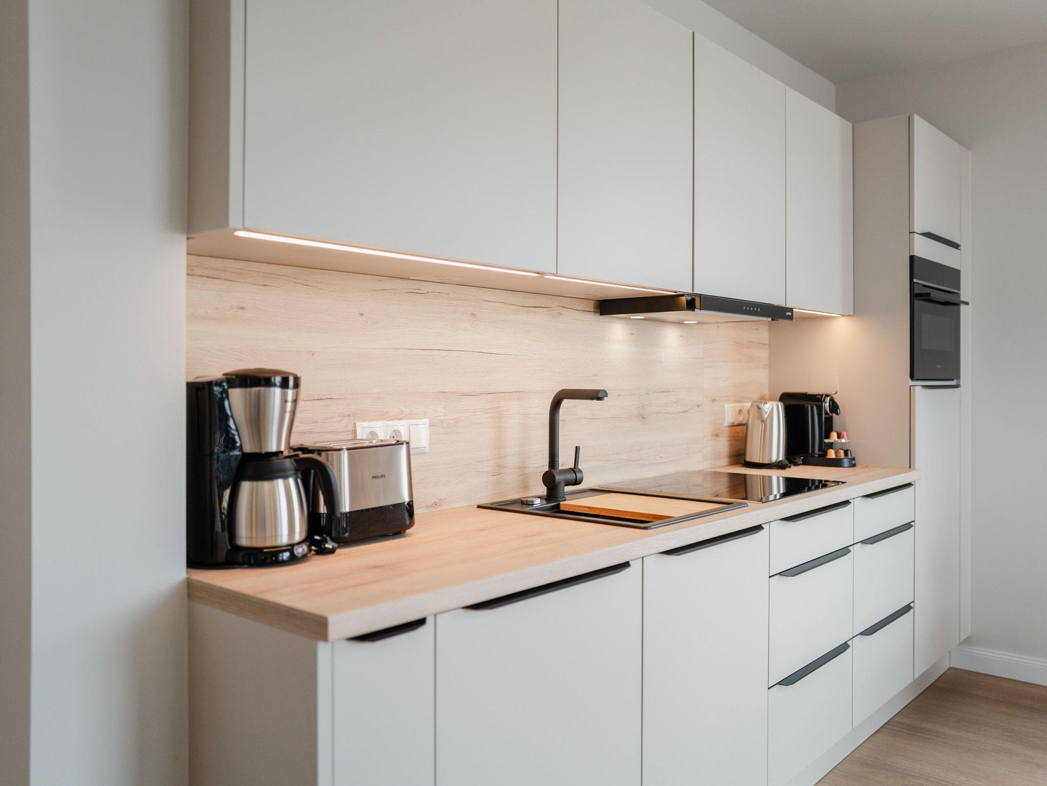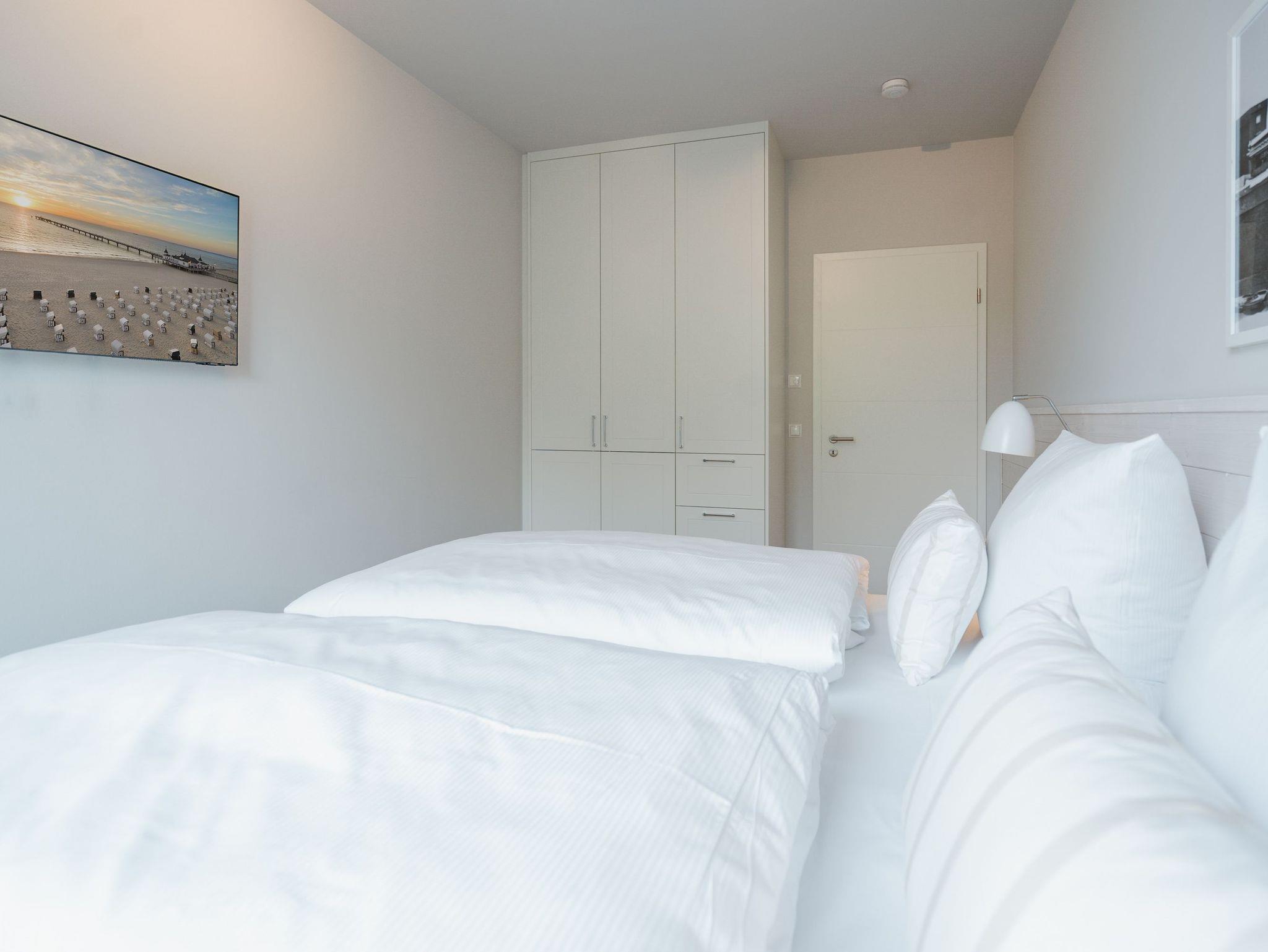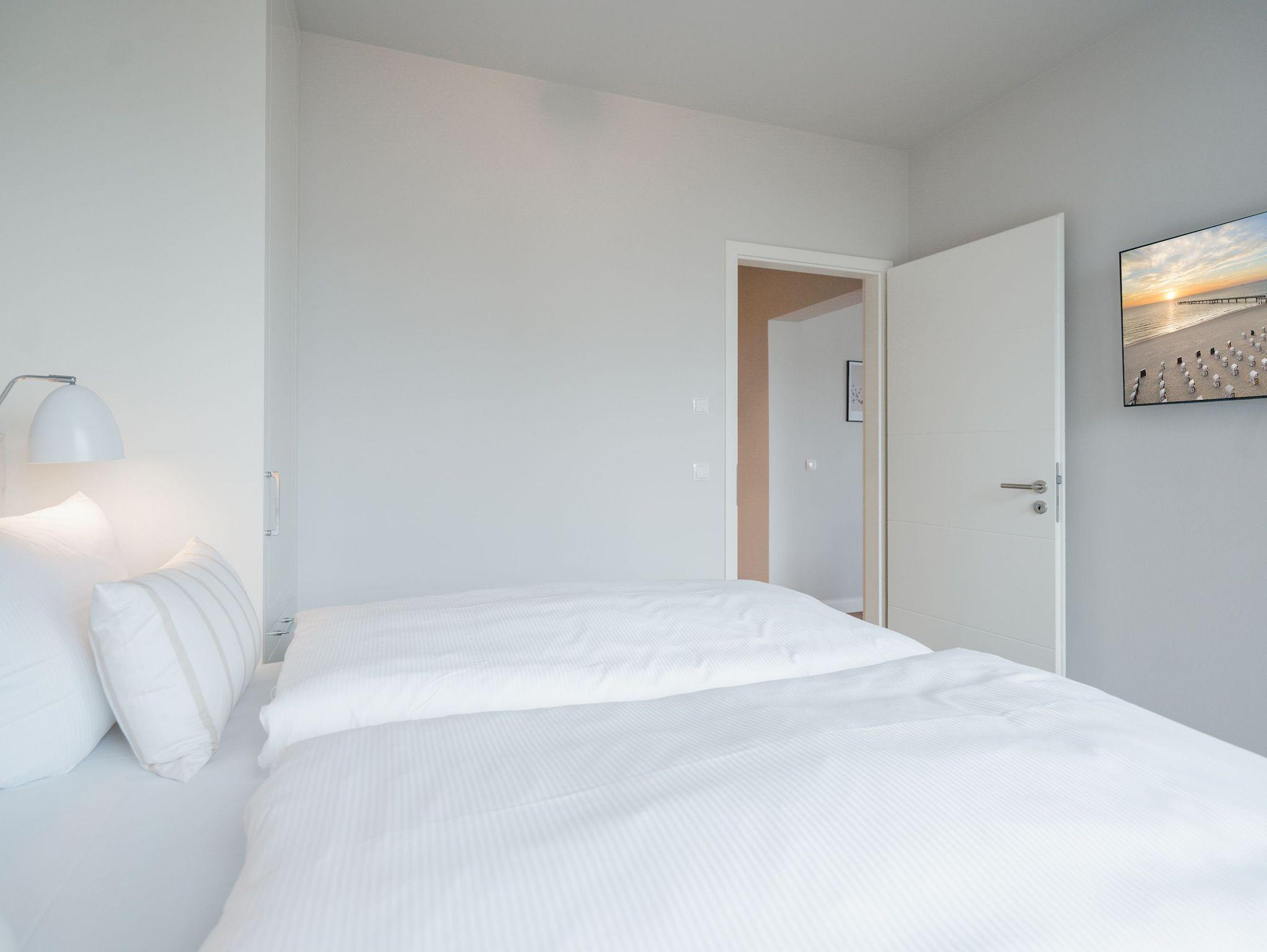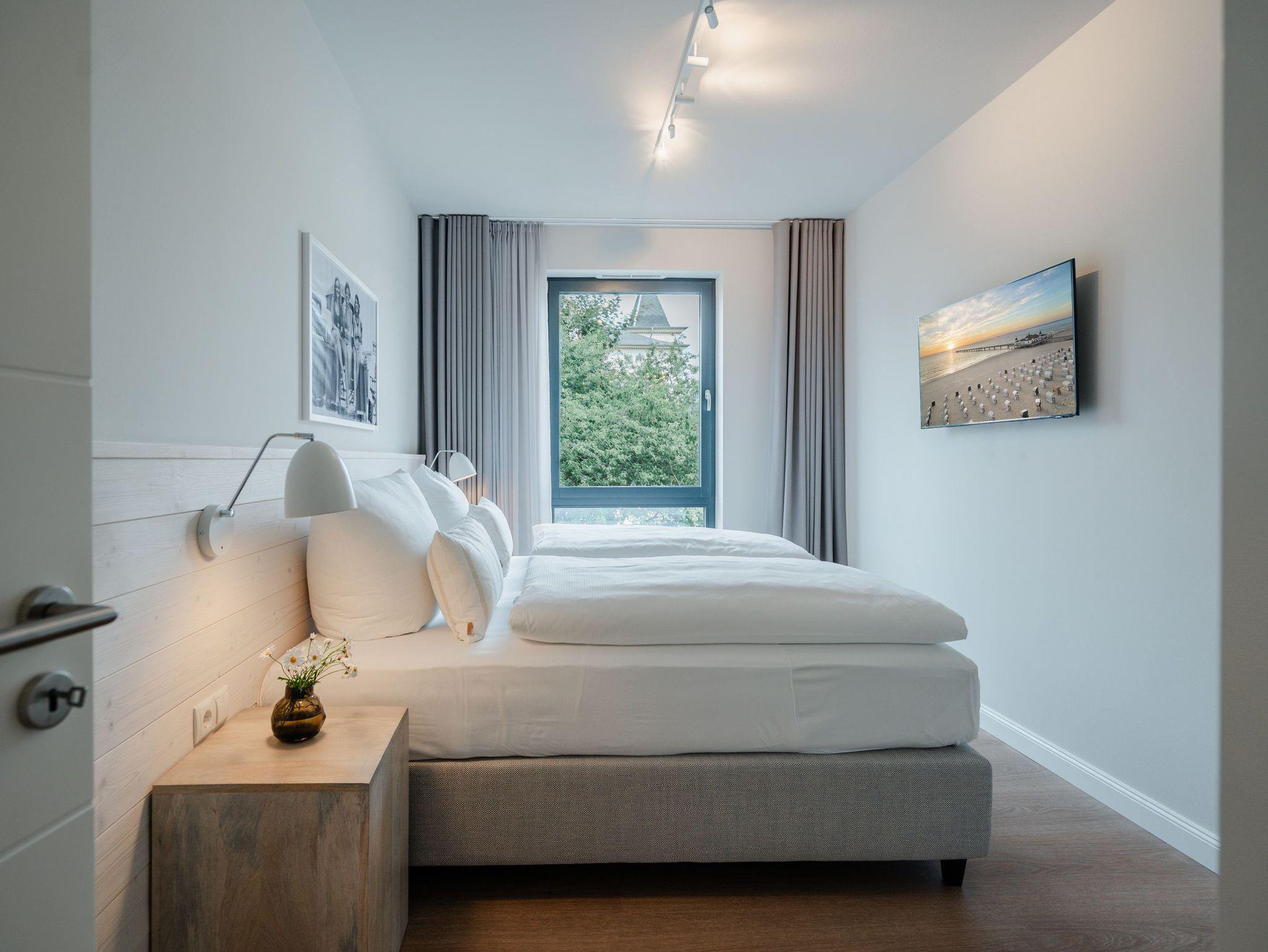 Wer nordisches Design mag, wird sich auf Anhieb in dieses stilvolle Urlaubszuhause für bis zu 4 Personen verlieben. Die 62 Quadratmeter des 3-Raum-Appartements B 1.8 im Haus B der Strandterrasse sind ein absoluter Wohntraum. Hier werden Sie sich von der ersten Sekunde an wohlfühlen. Das mit viel Liebe eingerichtete Feriendomizil wartet mit einem geräumigen Wohn-Esszimmer auf. Eine Relaxarea mit Geschmack und viel Komfort. Warme Farben sorgen für viel Gemütlichkeit. Das Sofa nebst superschönem und vor allem bequemem Sessel eignet sich wunderbar zum Entspannen und für Filmabende auf dem Flat-TV (43 Zoll). Eine romantische Atmosphäre verströmt der Elektrokamin (ohne Wärmeabgabe). Die zum Wohnzimmer hin offene Küche ist mit modernen Elektrogeräten ausgestattet. Dazu gehören ein Backofen, ein 4-Platten-Induktionsherd, ein Geschirrspüler, ein Toaster, eine Kaffeemaschine und einer Nespresso-Kapselmaschine. Genießen Sie das Essen gemeinsam am Esstisch, der auch ausreichend Platz für Spieleabende bietet. Was jedoch wäre ein Ostseeurlaub ohne Ostsee? Vom Wohnzimmer aus können Sie auf einen Nord-Ost-Balkon hinaustreten, von dem aus Sie seitlich aufs Meer hinausschauen können. Atmen Sie die frische Luft tief ein. Essen unter freiem Himmel wird am Balkontisch mit vier Stühlen möglich ? wenn nicht gerade der Strand ruft. Da Meeresluft bekanntlich müde macht, werden Sie in den komfortablen Boxspringdoppelbetten (2,00m x 2,00m und 1,80m x2,00m) in den beiden Schlafzimmern ganz sicher wunderbar schlafen können. Jedes Schlafzimmer verfügt zudem über einen großen Kleiderschrank und einen Flat-TV (43 Zoll). Zwei moderne Duschbäder mit Waschtisch und WC bieten Ihnen allen Komfort und Privatsphäre. Parken Sie bequem auf dem zu Ihrer Wohnung gehörenden PKW-Stellplatz. Mehr braucht es für einen erholsamen Urlaub am Meer nicht. Wir wünschen Ihnen ein schönes Ankommen, Auspacken und Wohlfühlen.