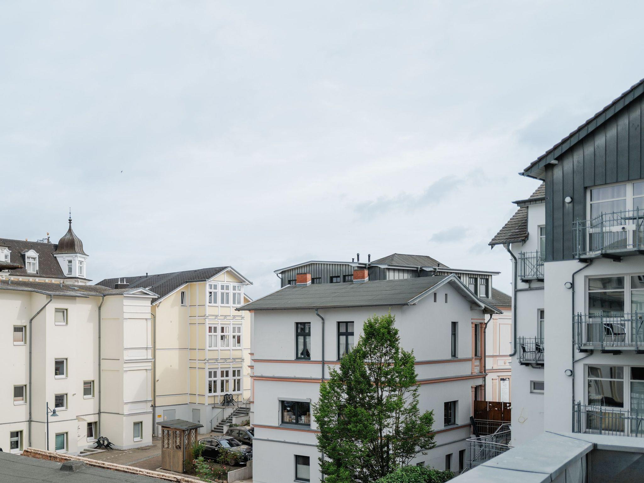 Die 2024 fertig gestellte Strandterrasse liegt direkt an der belebten Strandpromenade und bietet einen einzigartigen Ausblick auf die Grand Dame der historischen Seebrücken sowie die historische Konzertmuschel, einem beliebten Treffpunkt für Kunst und Kultur. Dahinter liegt die Ostsee ? ein Panorama, das zu den schönsten in den Kaiserbädern gehört. Es ist wie das Abtauchen in eine andere Zeit. In eine Zeit, in der man mit Stock, Sonnenschirm und Hut fürs ?Sehen und gesehen werden? über die Promenade schlenderte; aber auch in eine Zeit, in der ? damals wie heute ? Zeit einmal für eine kurze Weile keine Rolle spielt. Weil man angekommen ist im Loslassen, Entspannen und Genießen. Es ist dieser besondere Geruch nach Meeresluft und Freiheit, der in Erinnerung bleibt. Dazu die Bilder, die man mitnimmt. Von langen Strandspaziergängen, vom Lachen in fröhlich schäumenden Ostseewellen, von der Zeit in einem wunderschönen Urlaubsdomizil. Denn genau das ist die Strandterrasse mit ihren 56 modernen und exklusiven Ferienappartements direkt gegenüber der Ahlbecker Seebrücke. Die Ein-, Zwei- oder Dreizimmerwohnungen ? zwischen 40 und 70 Quadratmeter groß ? sind von einer Innenarchitektin gemeinsam mit unserem Erfahrungsschatz an Gästewünschen mit viel Liebe zum Detail und ganz individuell konzipiert worden. Entspannung und Wohlfühlen stehen an erster Stelle. Alles ist aufeinander abgestimmt und sorgt für eine gemütliche Atmosphäre. Wählen Sie zwischen einem Domizil in einem hellen, sandfarbenen Designkonzept oder einem Appartement mit anthrazitfarbenen Farbakzenten. Alle Appartements verfügen gleichermaßen über eine stilvolle und komfortable Einrichtung, die passgenau angefertigt worden ist, sowie über moderne Küchen und Bäder. Jedem Schlafzimmer ist ein eigenes Bad mit Dusche zugeordnet (außer App. B4.5). Die Appartements besitzen fast alle einen Balkon ? viele schauen sogar zur Ostsee hinaus. Die meisten Feriendomizile haben einen Elektrokamin und Infrarotsaunen. Im Erdgeschoss befindet sich ein separater Gemeinschaftsraum für Fahrräder. Außerdem besteht die Möglichkeit, im Gemeinschaftswaschraum 2 Waschmaschinen [&] Trockner zu nutzen. Ergänzt wird das Angebot durch eine Gemeinschaftssauna, die täglich von 11:00 bis 22:00 Uhr nutzbar ist. In der Tiefgarage (Einfahrtshöhe 2,03 Meter) steht für jede Wohnung 1 Pkw-Stellplatz zur Verfügung. Ist alles zur Zufriedenheit untergebracht? Dann kann der Urlaub ja beginnen. Und beim Blick vom Balkon über die Ostsee treffen sich zum Sonnenaufgang das Heute und das Damals. Gelassenheit legt sich beim Gang hinunter an den Strand auf die Seele. Jetzt darf die Zeit stehenbleiben.