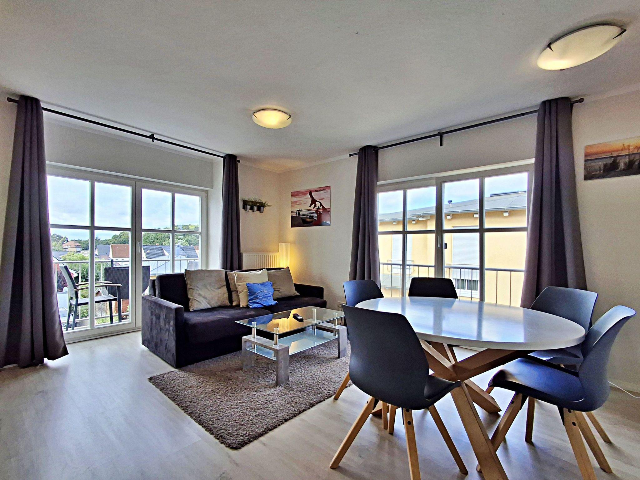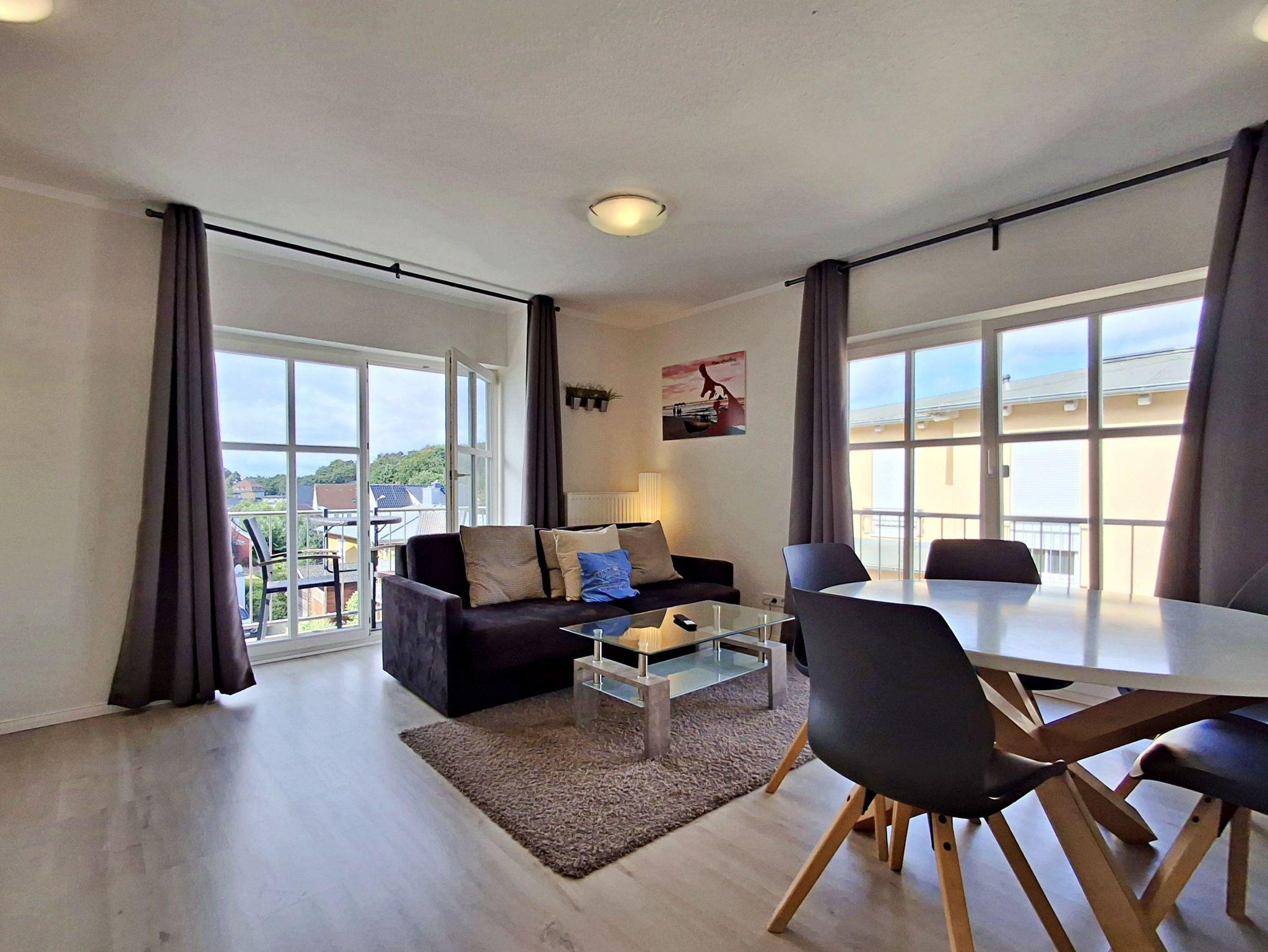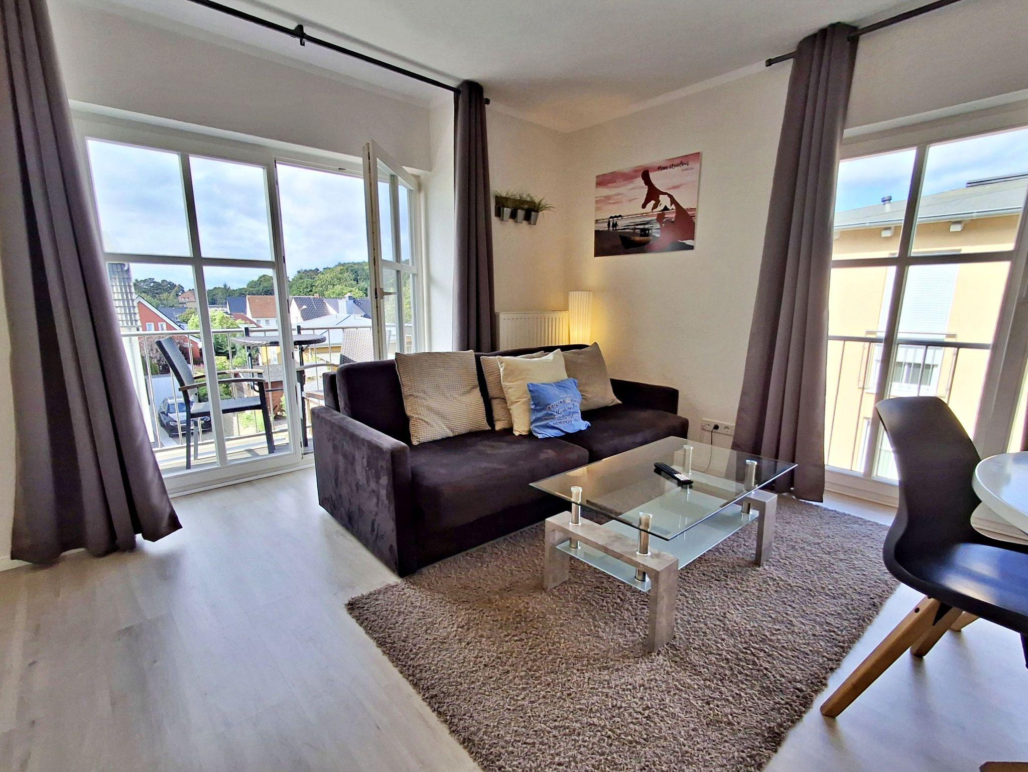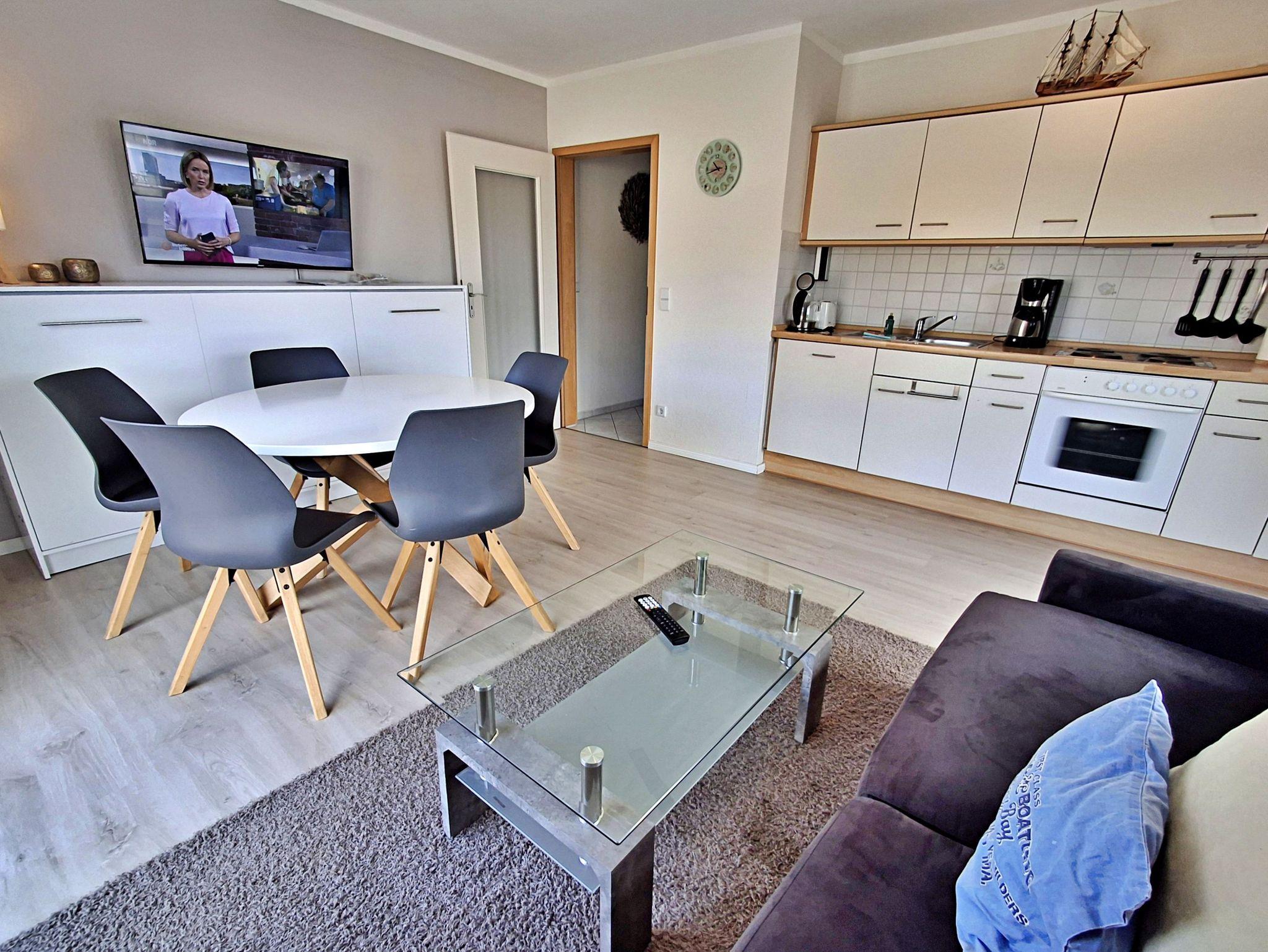 Herzlich willkommen in der hellen und freundlichen Ferienwohnung in der zweiten Etage des Feriendomizils Goethestraße! Auf 48 qm bietet diese schöne Wohnung Platz für bis zu 4 Personen, damit Sie einen erholsamen und entspannten Urlaub genießen können. Die stilvoll eingerichtete Wohnung verfügt über ein einladendes Wohn- und Esszimmer, das mit einer bequemen Couch ausgestattet ist, die auch Platz für 2 weitere Personen bietet. Hier finden Sie auch einen Flachbild-TV und einen Esstisch mit 4 Stühlen. In der vollwertigen Küche stehen Ihnen ein 4-Platten-Herd, Backofen, Spülmaschine, Wasserkocher und Kaffeemaschine zur Verfügung - alles, was Sie für die Zubereitung Ihrer Lieblingsgerichte benötigen! Das separate Schlafzimmer ist mit einem gemütlichen Doppelbett, einem großzügigen Kleiderschrank und einem zusätzlichen Flachbild-TV ausgestattet, sodass Sie sich auch hier wohlfühlen können. Das Tageslicht-Bad bietet Ihnen eine Dusche und WC für Ihren Komfort. Genießen Sie die frische Ostseeluft auf unserem kleinen Balkon, der mit zwei Sitzmöglichkeiten ausgestattet ist - perfekt, um sich zu jeder Tageszeit zu entspannen. Zudem stehen Ihnen W-LAN und ein Parkplatz direkt hinter dem Haus kostenfrei zur Verfügung.