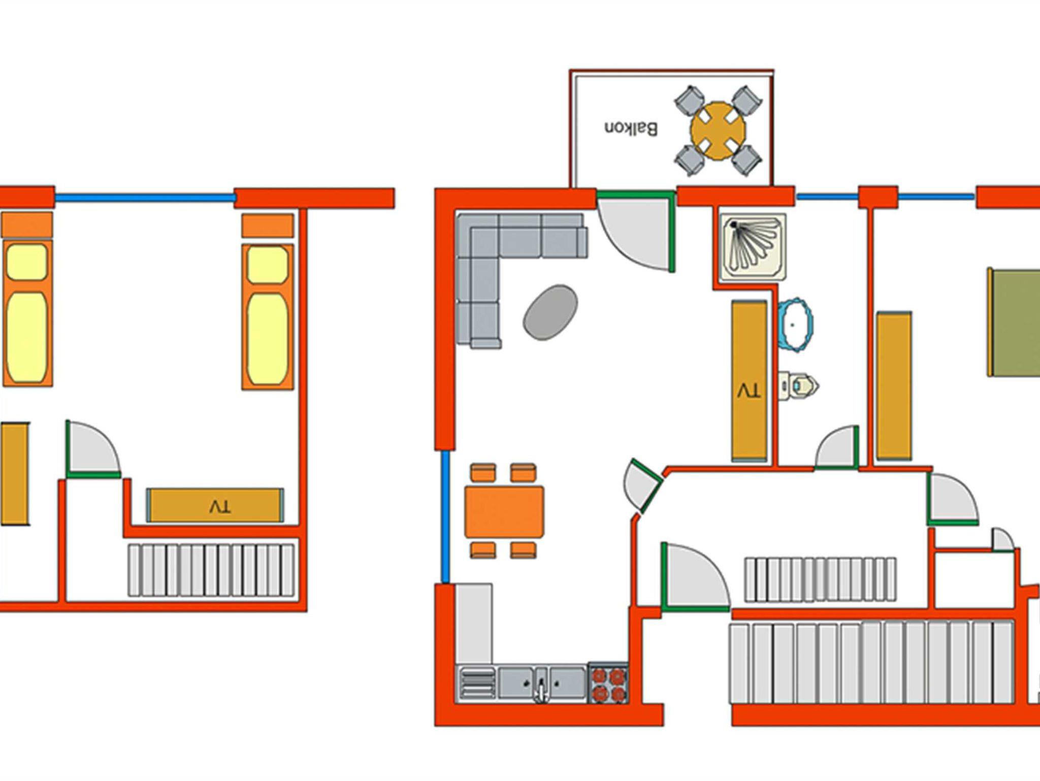 Im Wohnbereich ist eine Schlafcouch als Aufbettung (Schlafbreite: 1,60m) für die 5. und 6. Person vorhanden, in beiden Schlafzimmern befindet sich jeweils ein Doppelbett.