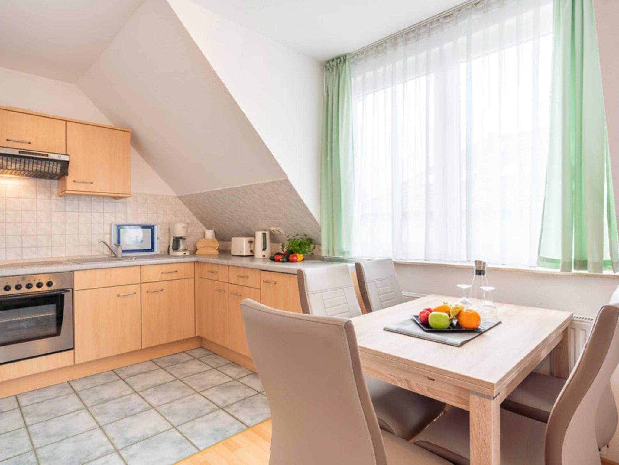 Die Wohnung Maritim erstreckt sich auf zwei Etagen und befindet sich im Ober- und Dachgeschoss des Hauses. Sie besteht aus Diele, Dusche/WC, zusätzlichem WC, kombiniertem Wohnzimmer mit Küche und zwei Schlafzimmern.