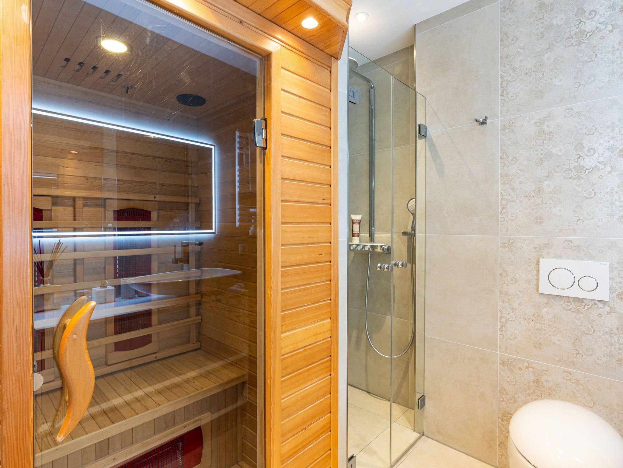 Das exklusive Badezimmer lässt keine Wünsche offen: Neben einer Echtglas-Regendusche und hochwertiger Naturstein-Ausführung erwartet Sie eine Infrarot-Saunakabine für pure Entspannung. WC und Haartrockner runden das Wohlfühlpaket ab. Tipp: Brennstoff für den Bioethanol-Kamin können Sie bequem im Rahmen Ihrer Buchung hinzubuchen.