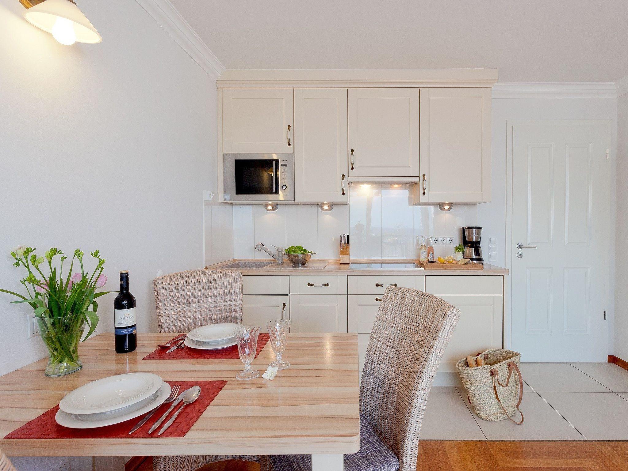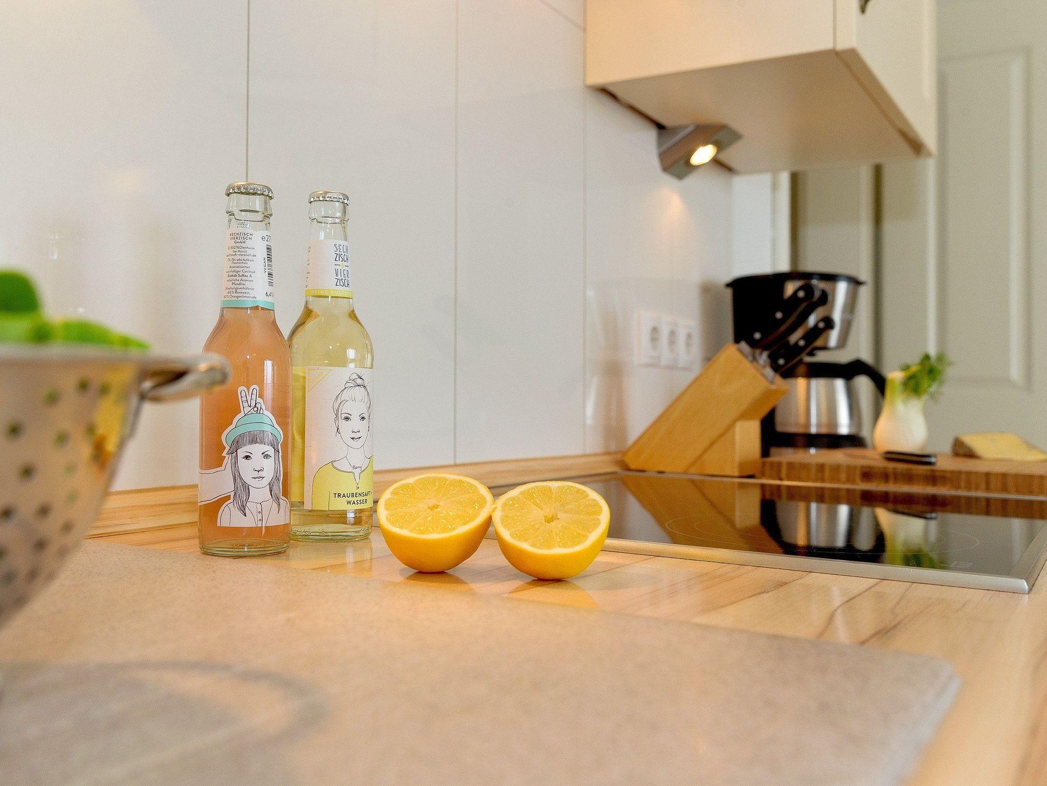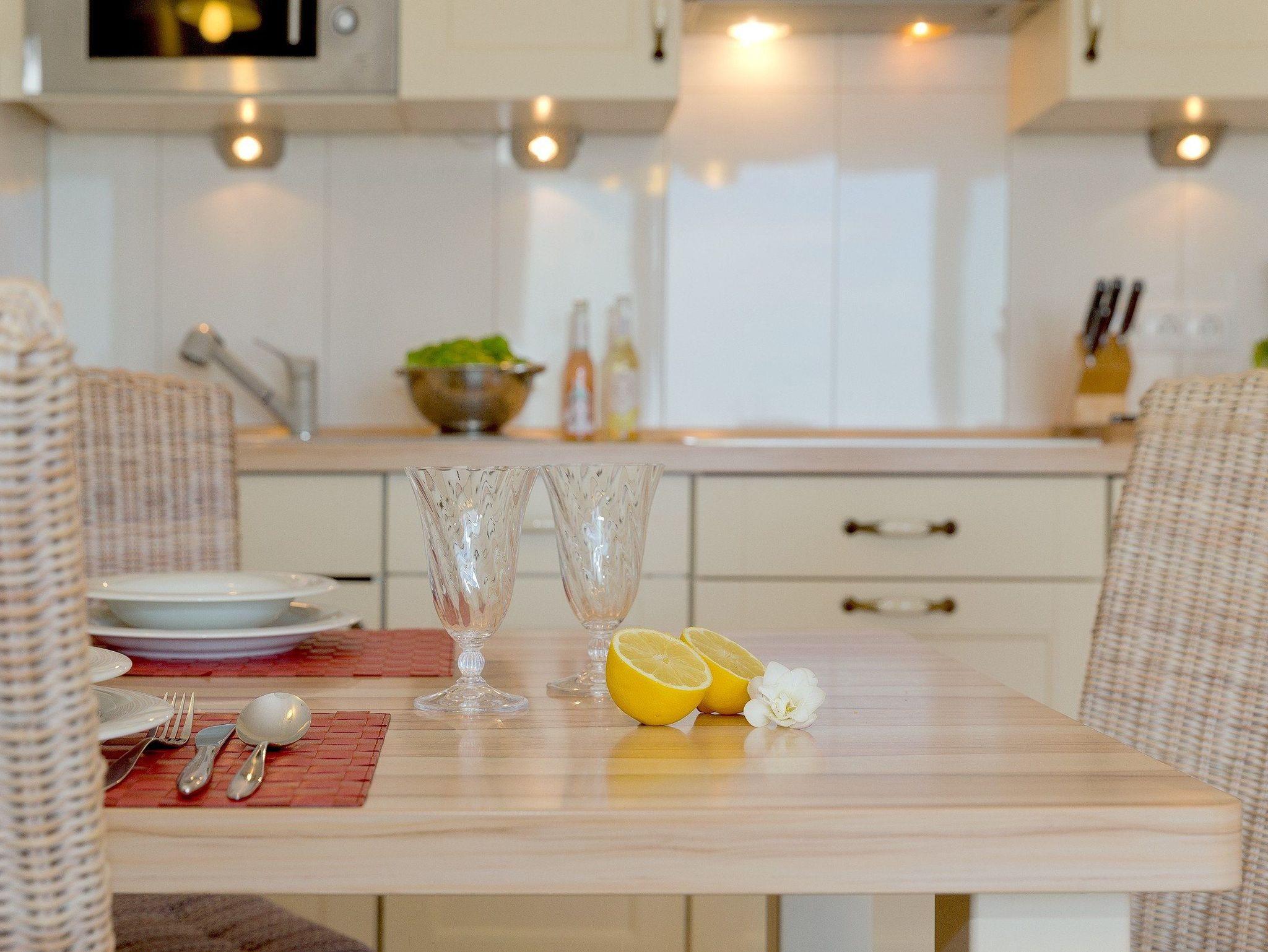 Der offene Wohn-, Koch- und Essbereich ist modern und stilvoll eingerichtet. Die voll ausgestattete Küche bietet alles, was Sie brauchen: Ceranfeld, Geschirrspüler, Kühlschrank mit Gefrierfach, Kaffeemaschine, Wasserkocher, Toaster und Mikrowelle. Vor dem Bioethanol-Kamin können Sie es sich in der gemütlichen Sitzecke bequem machen und entspannte Stunden genießen.