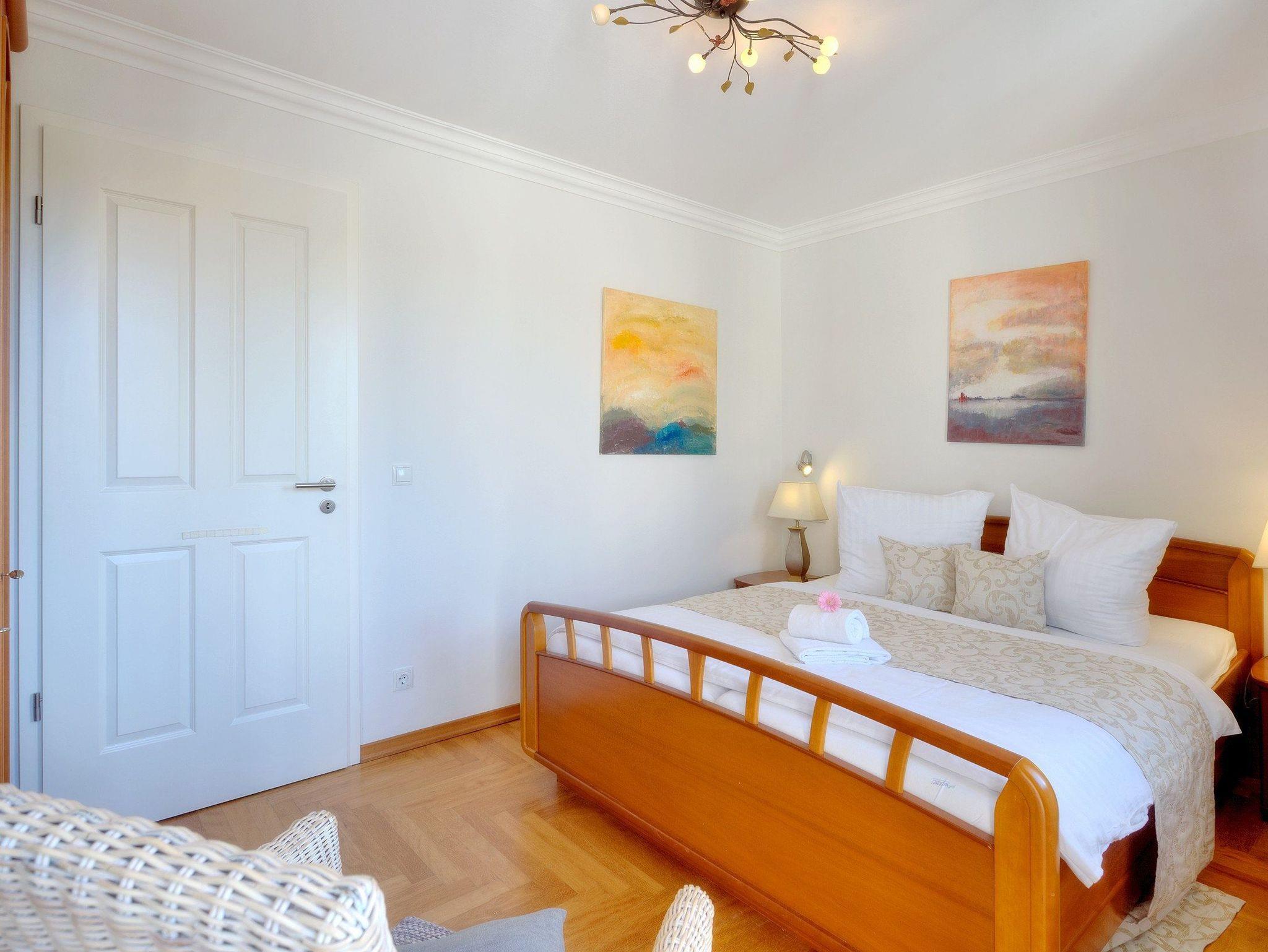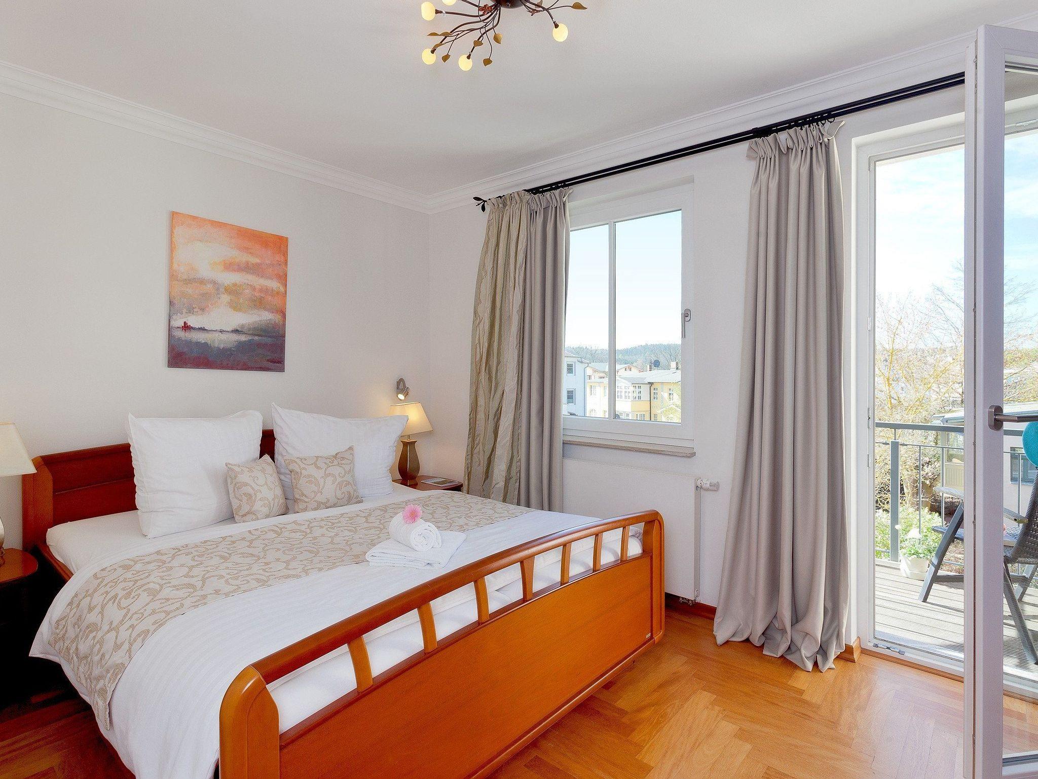 Das Schlafzimmer bietet ein komfortables Doppelbett (160 x 200 cm, zwei getrennte Matratzen) und einen Flachbildfernseher. Vom Schlafzimmer aus gelangen Sie auf den zweiten Balkon mit Südseite ? perfekt zum Sonnenbaden.