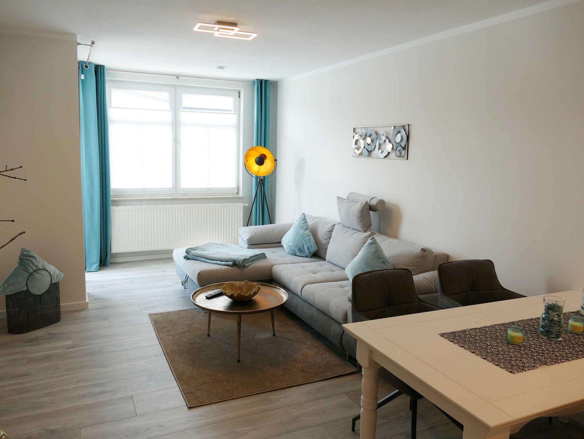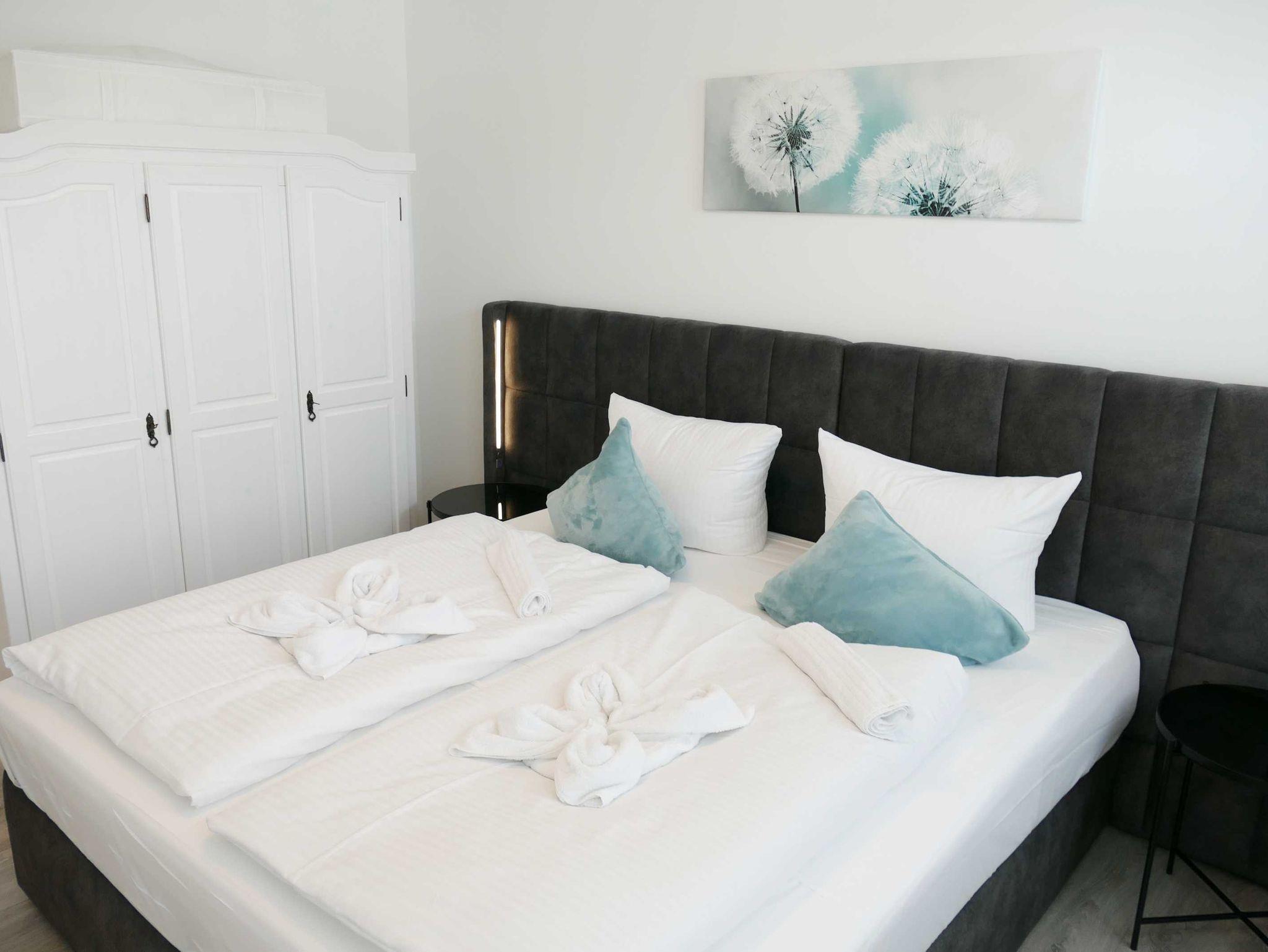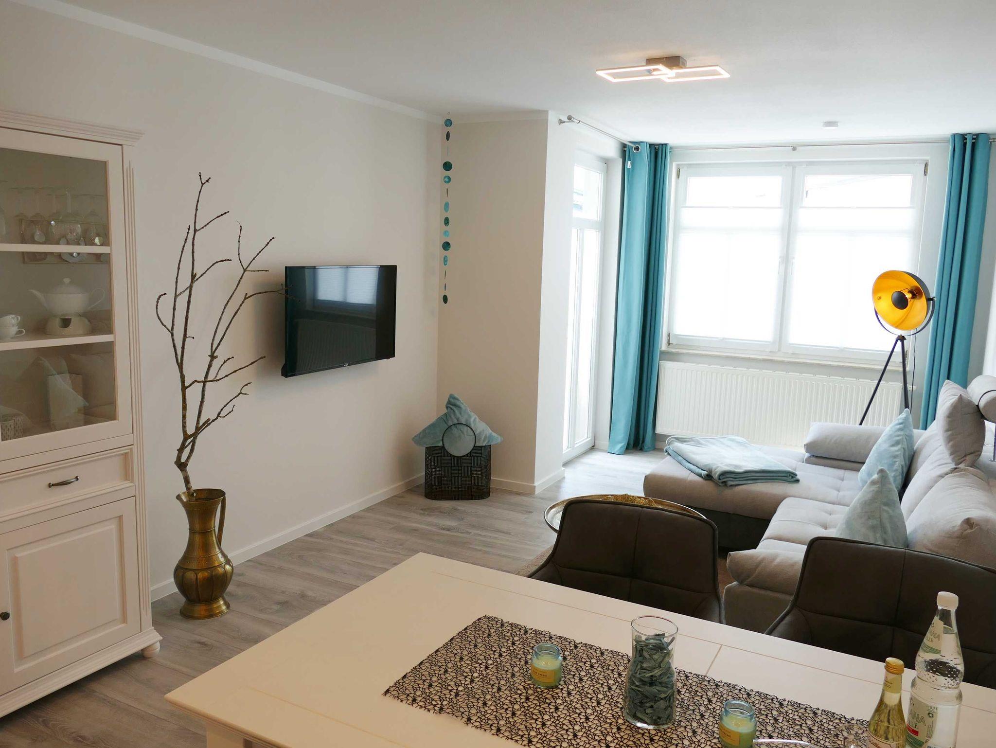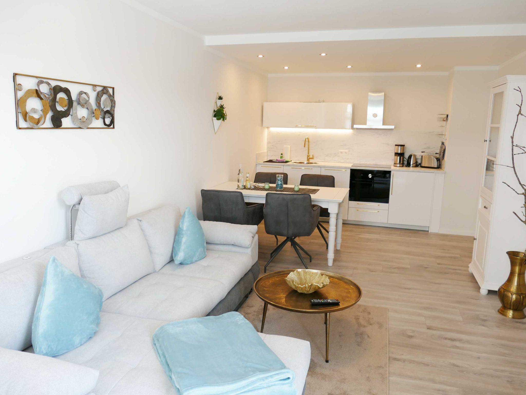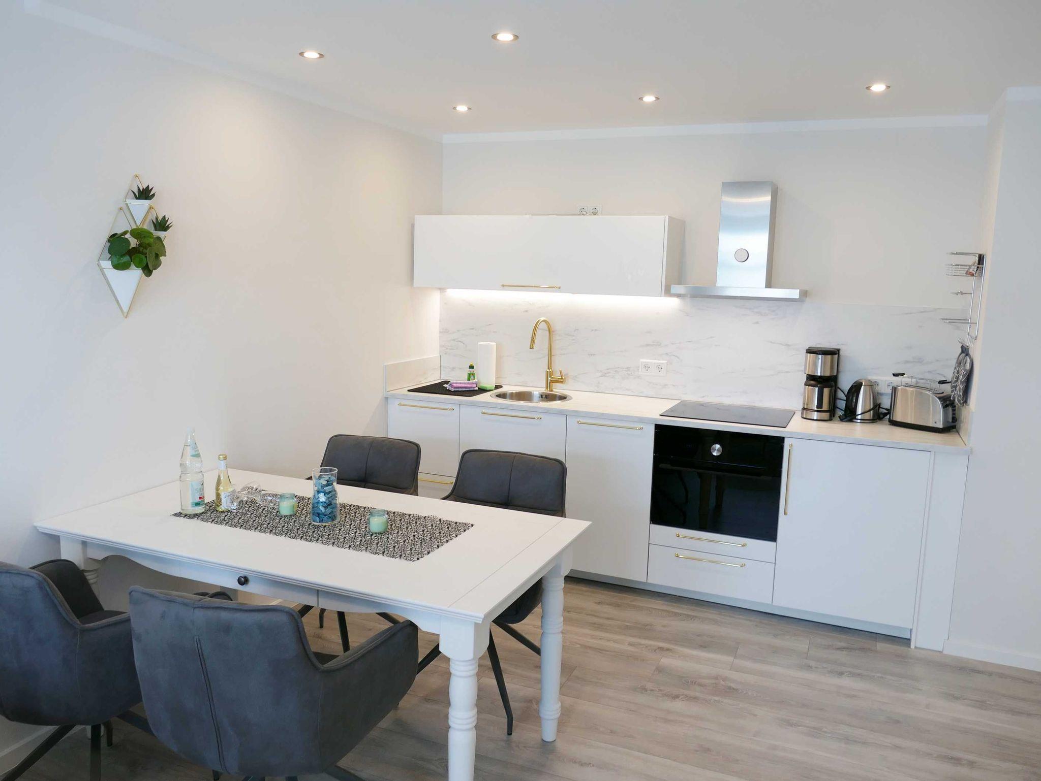 Die ca 50 qm große Ferienwohnung ist modern und gehoben ausgestattet und bietet Platz für bis zu drei Personen. Sie ist ausgestattet mit einem Wohnzimmer (Aufbettungsmöglichkeit für eine Person), einer offenen, modernen und komplett ausgestatteten Küchenzeile, einem Schlafzimmer mit Doppelbett (Boxspringbett), Bad mit Badewanne und WC. Ein Balkon schließt sich an das helle Wohnzimmer an.