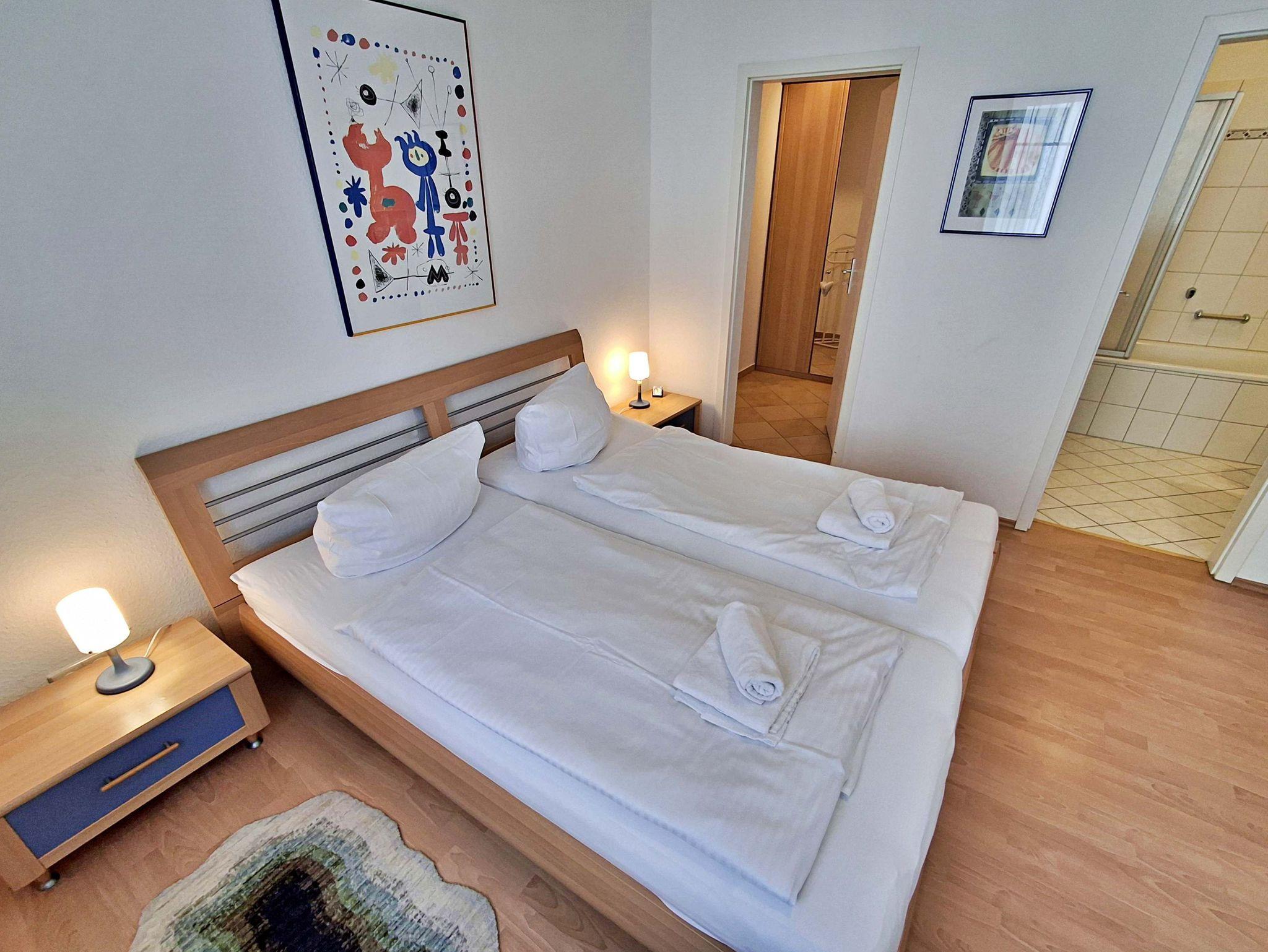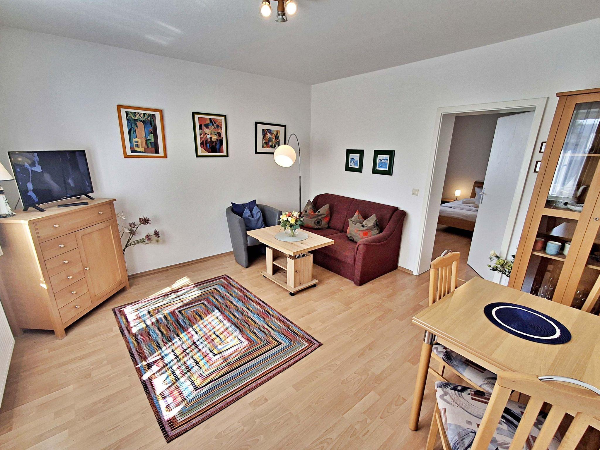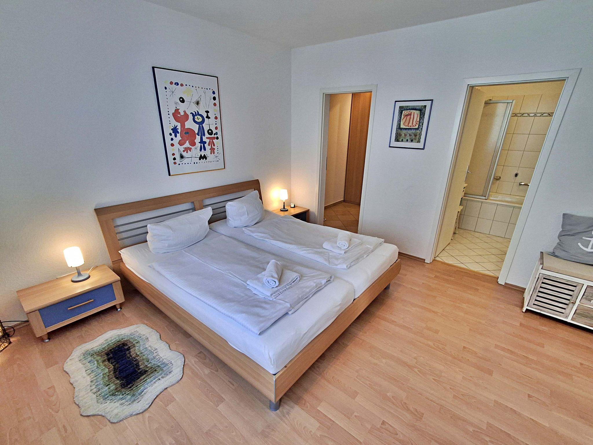 Auf 49 qm im Erdgeschoss bietet Ihnen diese charmante und freundliche Ferienwohnung eine helle und gemütliche Atmosphäre, die zum Entspannen einlädt. Das geräumige Wohnzimmer ist der perfekte Ort, um sich zu entspannen. Hier finden Sie eine bequeme Couch, Flachbild-TV, Radio und CD-Player sowie eine einladende Essecke. In der separaten Küche können Sie Ihre Kochkünste entfalten. Sie ist mit einem Elektro-Herd, Backofen, Spülmaschine, Mikrowelle, Kühlschrank, Kaffeemaschine, Wasserkocher, Toaster und vielen weiteren Annehmlichkeiten ausgestattet. Das Schlafzimmer verfügt über ein komfortables Doppelbett und einen TV, sodass Sie sich nach einem erlebnisreichen Tag zurückziehen können. Direkt nebenan steht Ihnen ein separates Zimmer mit einem Kleiderschrank zur Verfügung, ideal für Ihre Kleidung und Ihr Gepäck. Das Badezimmer ist mit einer Badewanne ausgestattet, die auch eine Duschfunktion bietet, sowie einem WC.