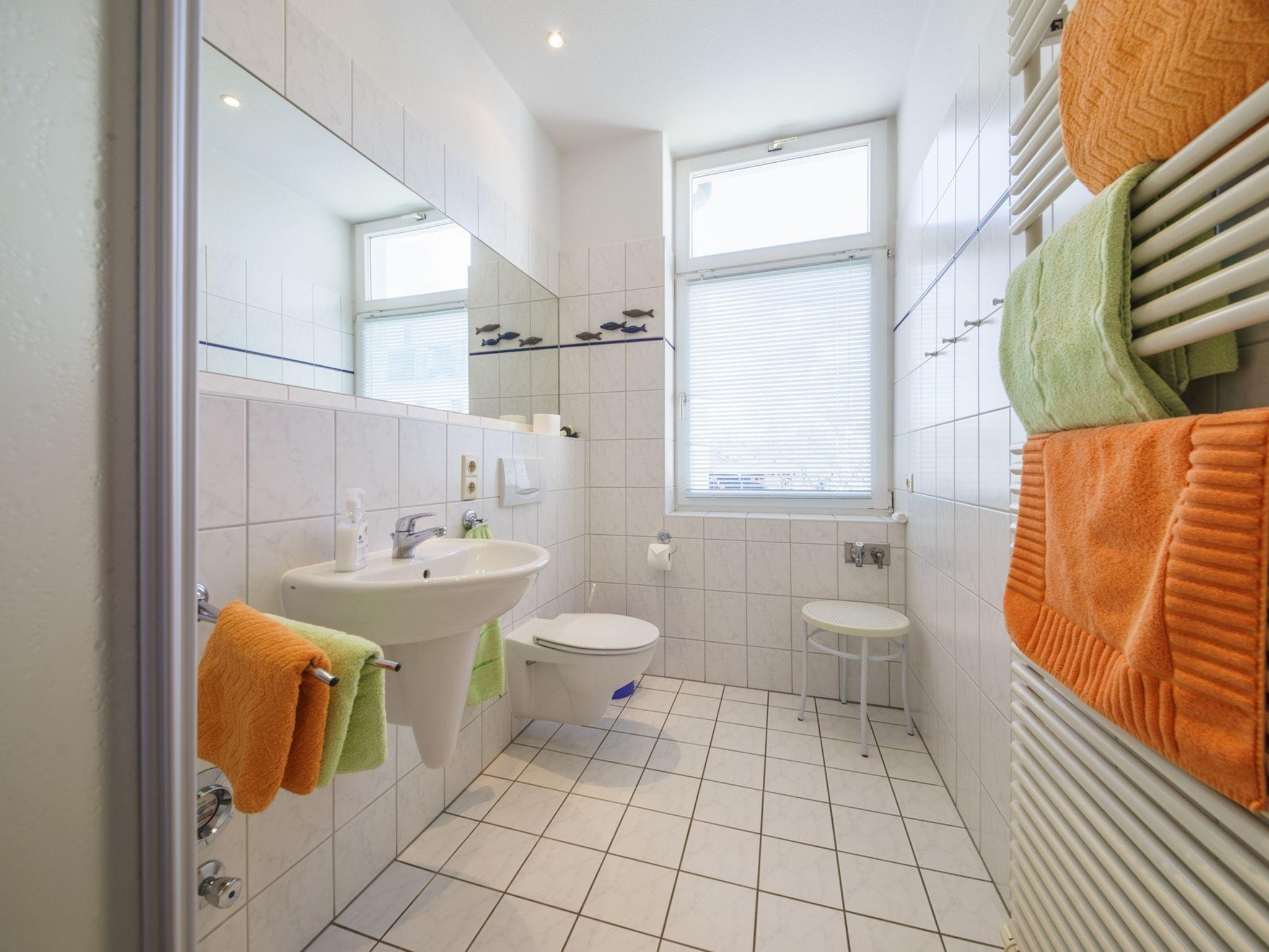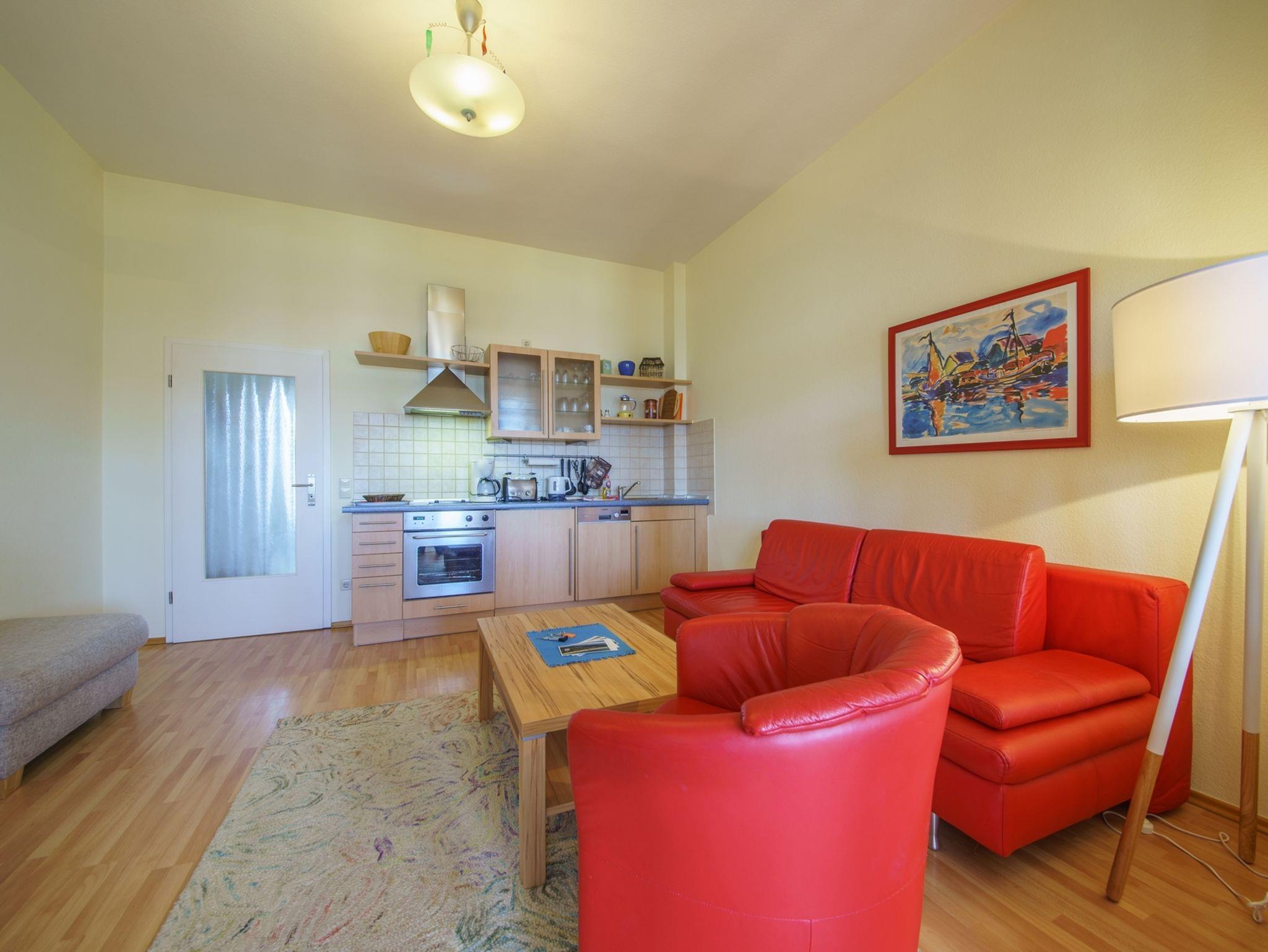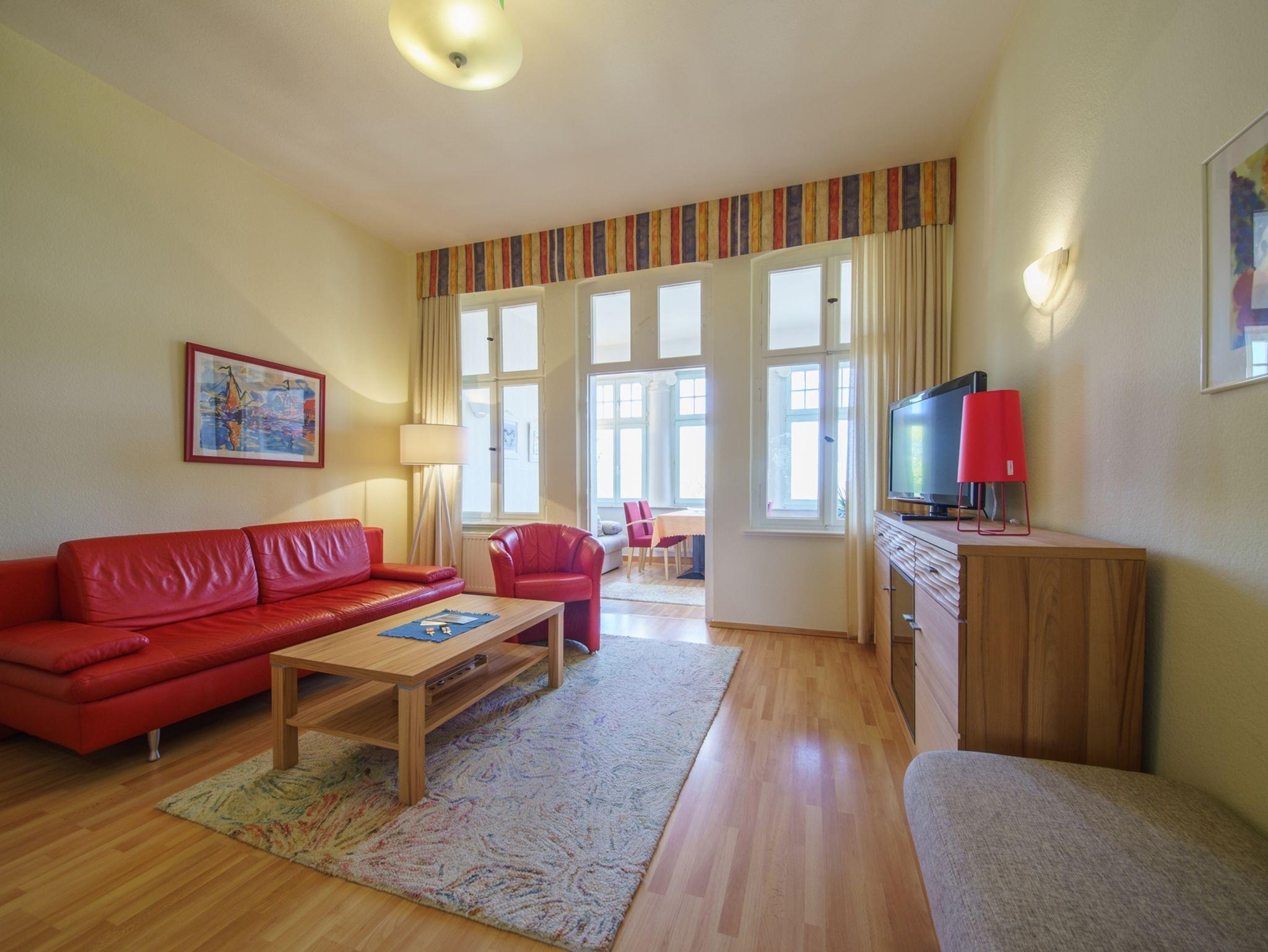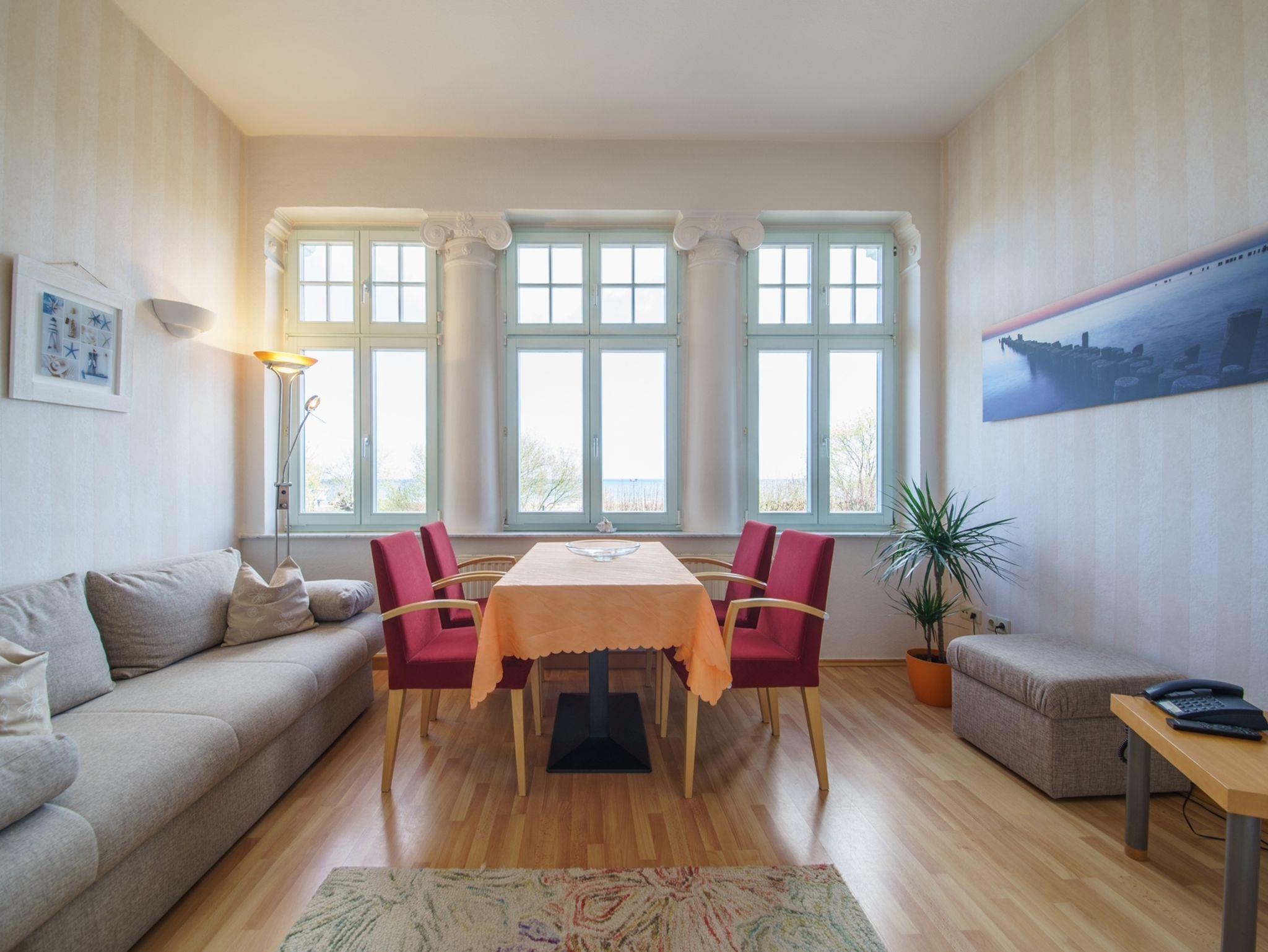 Die komfortable 2-Raum-Ferienwohnung mit 55 qm befindet sich in der ersten Etage der Villa Henriette und verfügt über eine Veranda mit herrlichem Meerblickund Essplatz. Die Wohnung ist weiterhin mit einem Schlafraum mit Doppelbett, einem kombinierten Wohn- und Schlafraum mit Doppelbettschlafcouch und einer komplette Küchenzeile mit Geschirrspüler, Herd, Backofen, Kaffeemaschine, Geschirr etc. ausgestattet. Bad mit Dusche und WC sowie Haarfön. Zur weiteren Ausstattung gehören TV, Radio + CD-Player, Telefon und Schranktresor.
