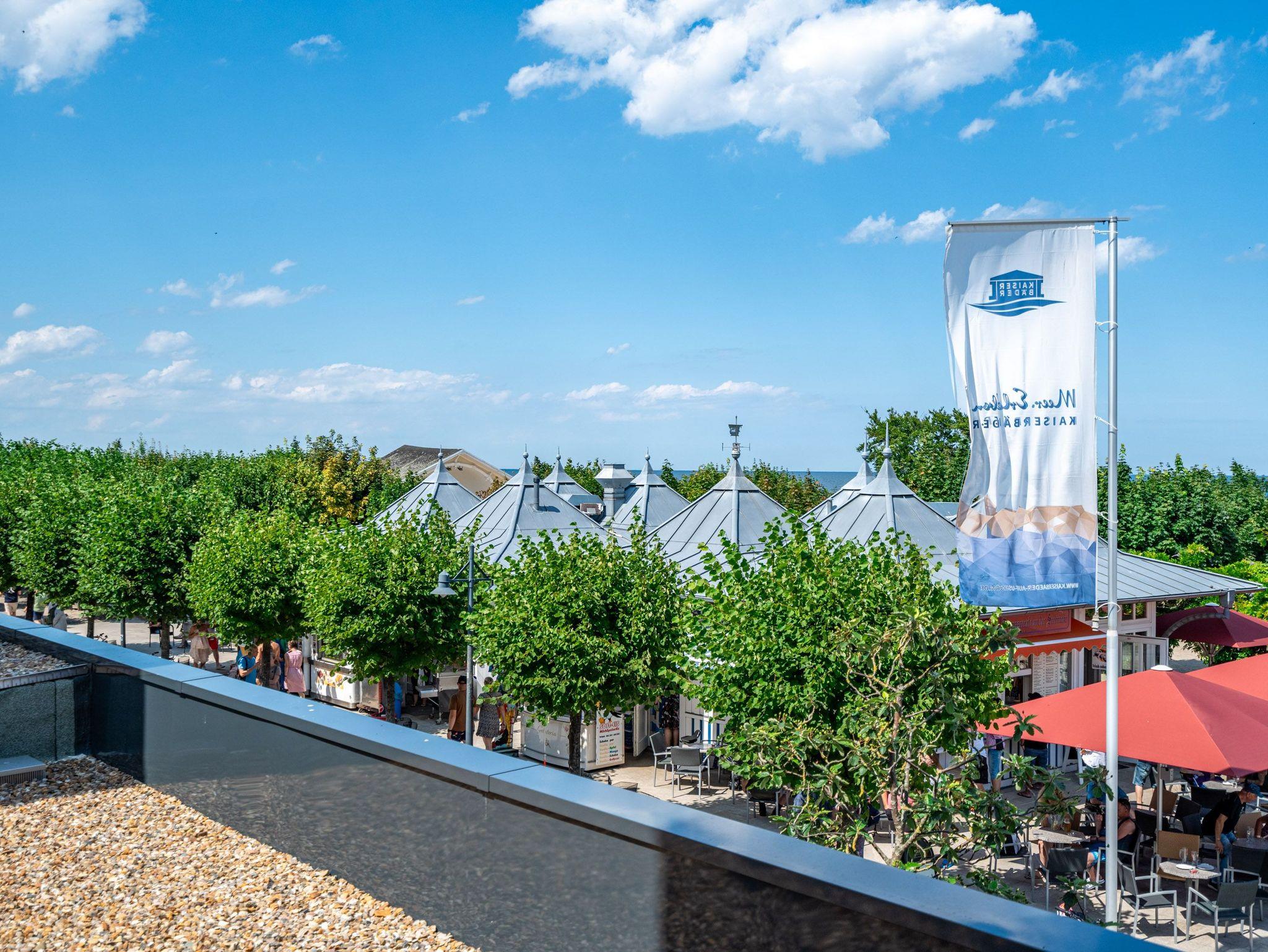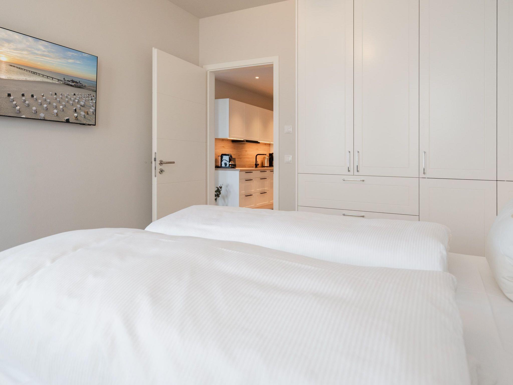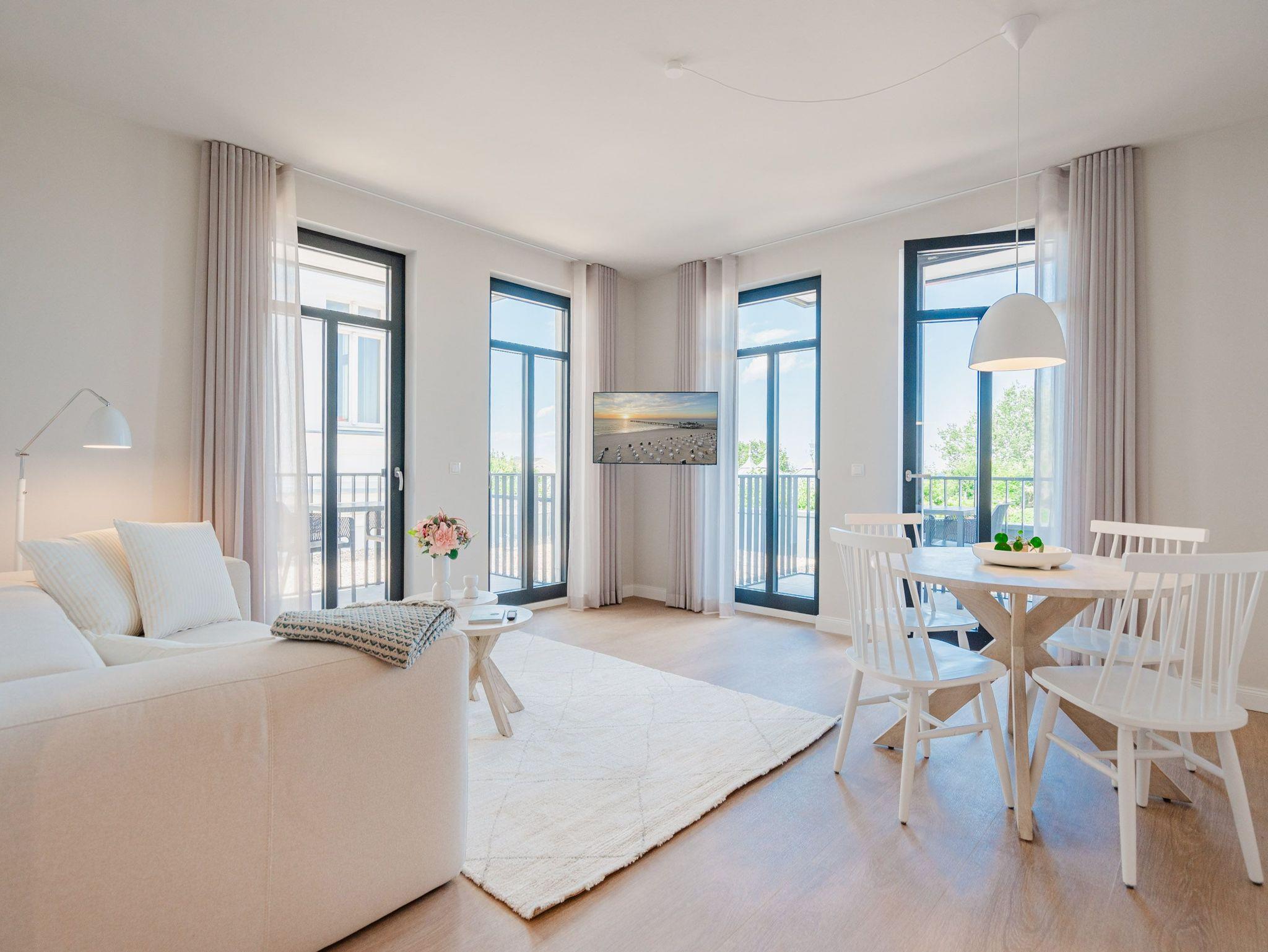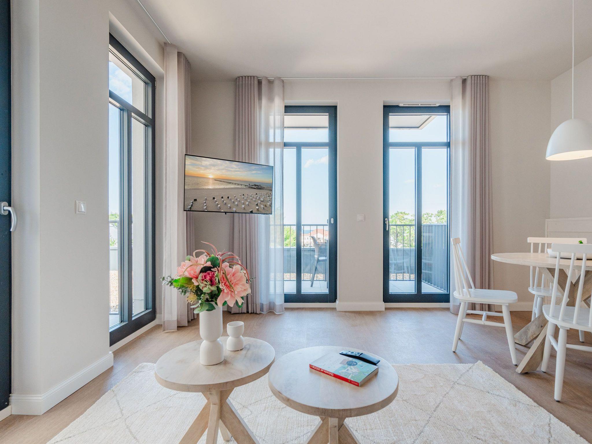 Modern, offen, lichtdurchflutet ? dieses 57 Quadratmeter große 2-Raum-Appartement im 1. Obergeschoss macht aus Ihrem Urlaub eine exklusive Ostsee-Auszeit. Das stylishe Domizil mit Blick auf die Ahlbecker Promenade ist für 2 Personen eine ideale Unterkunft zum Meeresluft schnuppern und neue Energie tanken. Und immer im Blick die blaue Weite der Ostsee. Schicken Sie Ihre Gedanken auf Reisen bis an den Horizont und kommen Sie runter in diesem gemütlichen Domizil, in dem alles stimmig und behaglich ist. Zwei Balkone (mit Ausrichtung Nord und Nord-West) geben eine Weitsicht über die Ostsee, dass Sie aus dem Schwärmen gar nicht wieder rauskommen. Allein dieser Anblick legt sich beruhigend auf jedes stressgeplagte Gemüt. Der großzügige Wohn- und Essbereich der Unterkunft ist zu Seeseite hin ausgerichtet. Sie haben also das Meer sowohl vom gemütlichen Sofa aus als auch vom Esstisch aus immer im Blick. Ein 43-Zoll-Flachbildfernseher sorgt für das Home-Entertainment. Die offene Küchenzeile ist mit hochwertigen Siemens-Elektrogeräten ausgestattet. Der Genuss mit allen Sinnen steht in diesem Appartement im Vordergrund. Da fügen sich die hellen Sandfarben und das helle Holz der Einrichtung wunderbar ins Gesamtbild ein. Etwas, was man sich vor allem im Urlaub sehnlichst wünscht, ist ein erholsamer Schlaf. In dem bequemen Boxspringdoppelbett (1,80 m x 2,00 m) im Schlafzimmer wird dieser Traum Realität. Hier finden Sie auch einen großen Kleiderschrank und einem zusätzlichen 43-Zoll-Flachbildfernseher. Das innenliegende Bad ist mit einer Dusche, einem WC, einem Waschtisch und einer Infrarotsauna ausgestattet, die Ihnen nach einem Tag voller Aktivitäten am Strand oder in der Umgebung wohlige Entspannung bietet. Den zum Appartement gehörenden PKW-Stellplatz in der Tiefgarage können Sie bequem über den Fahrstuhl erreichen. Kommen Sie also einfach nur an und lassen alles los, was Energie raubt. Wir freuen uns darauf, Sie bald bei uns begrüßen zu dürfen!