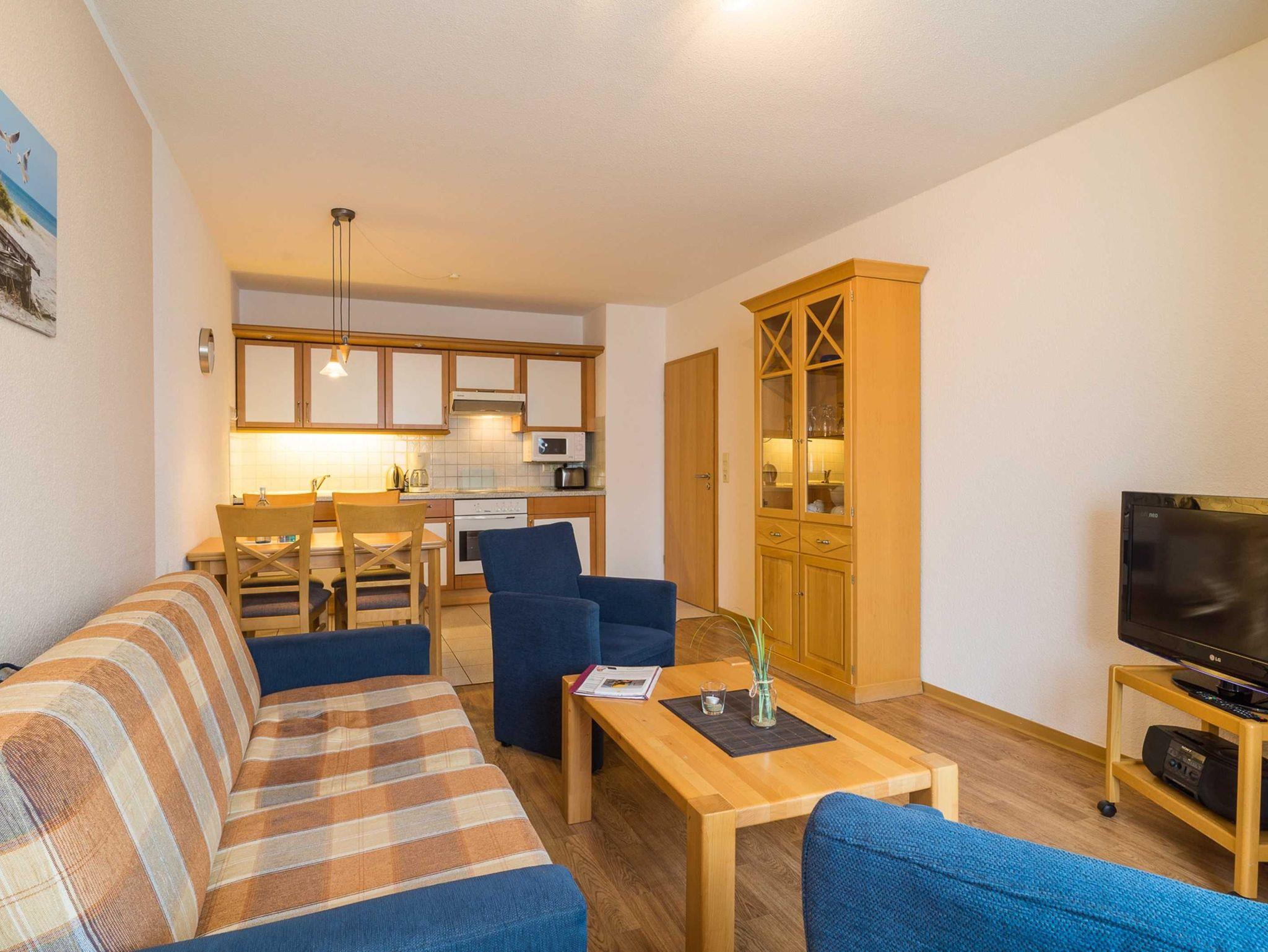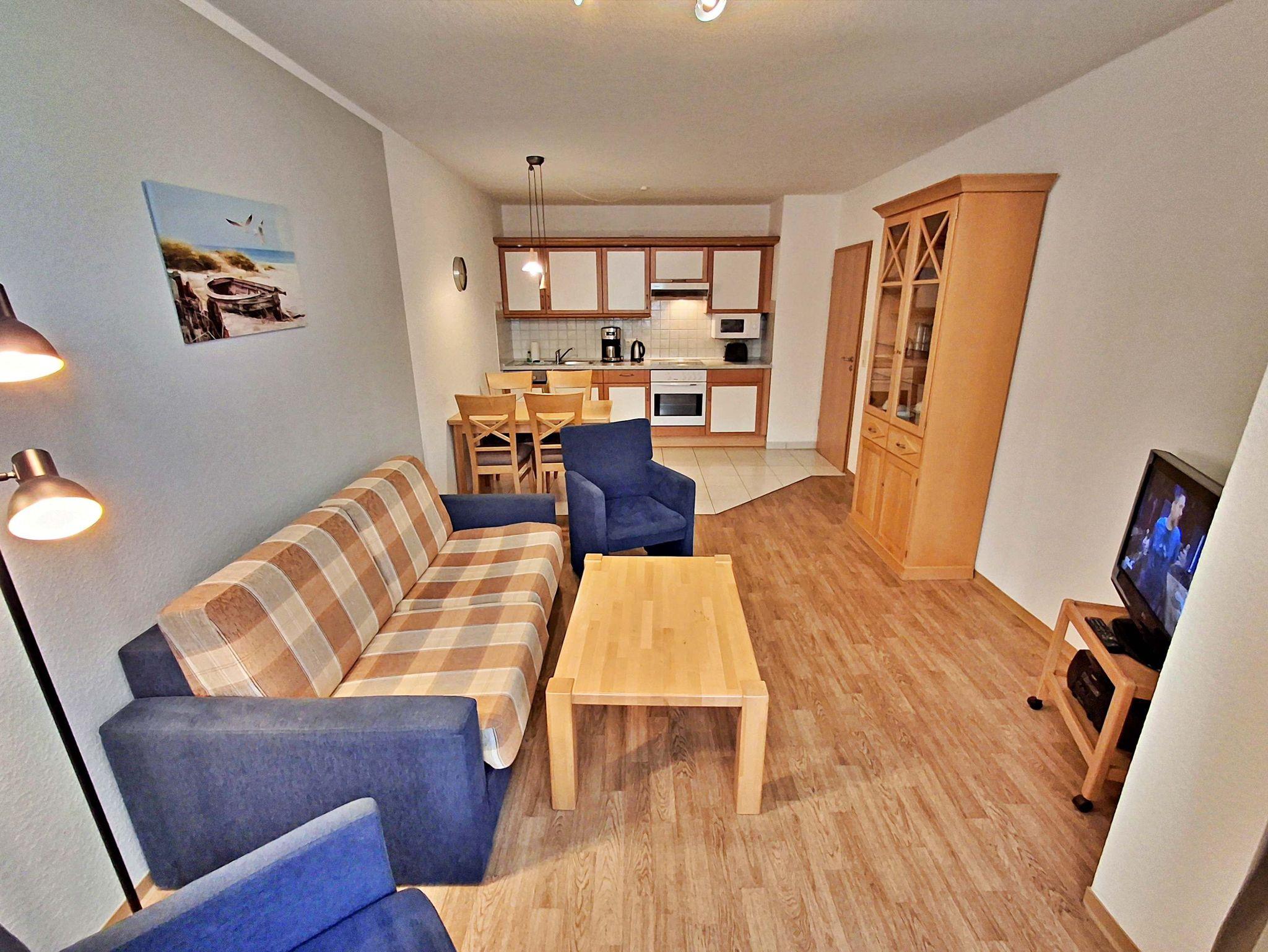 Der helle Wohnbereich ist mit einer gemütlichen Couch (Aufbettungsmöglichkeit für 1 Person), zwei Sesseln sowie einem Esstisch mit 4 Stühlen ausgestattet. Von hier aus gelangen Sie direkt auf die Terrasse zur ruhigen Hofseite - perfekt für ein Frühstück im Freien oder ein Glas Wein am Abend.