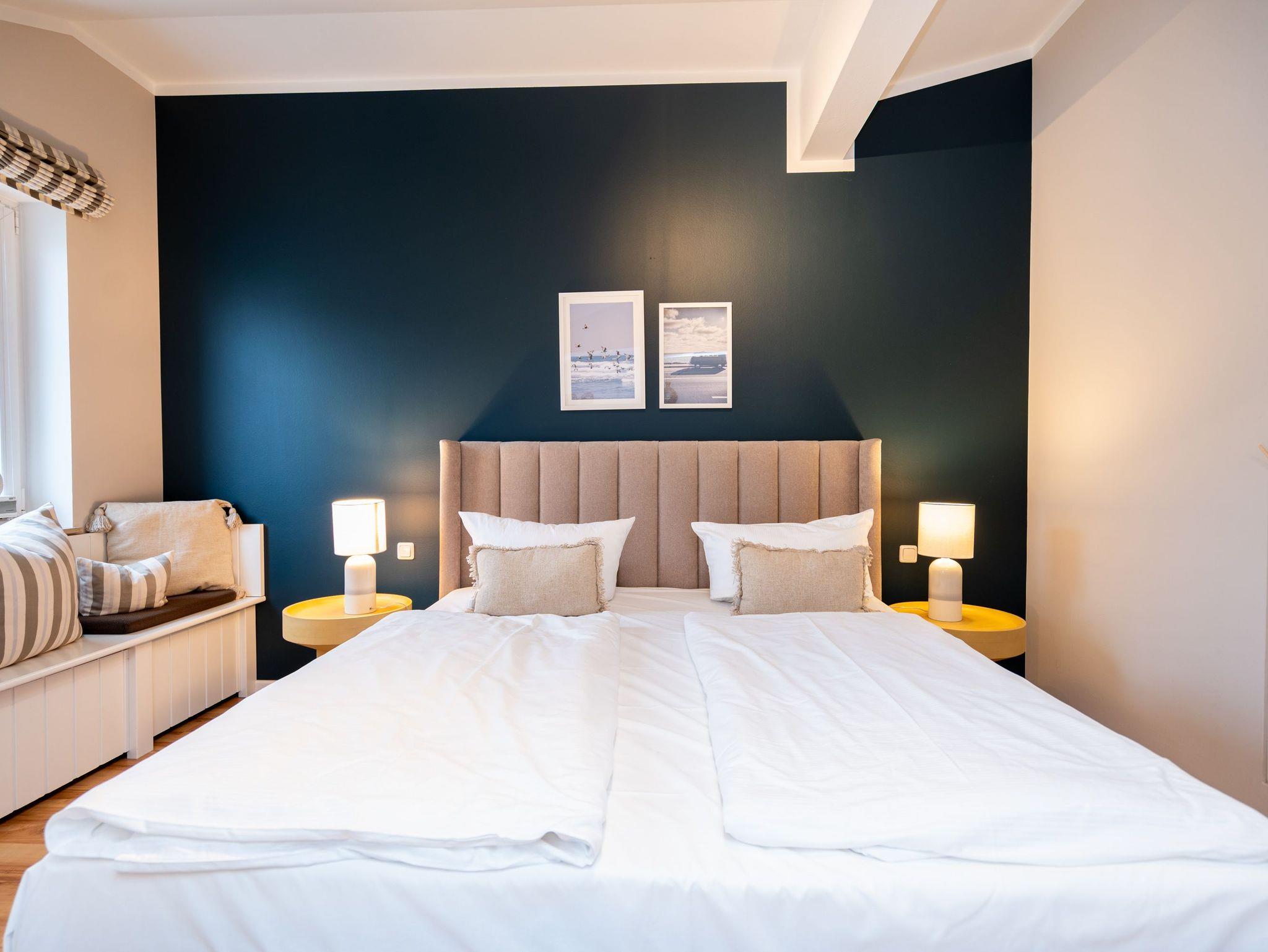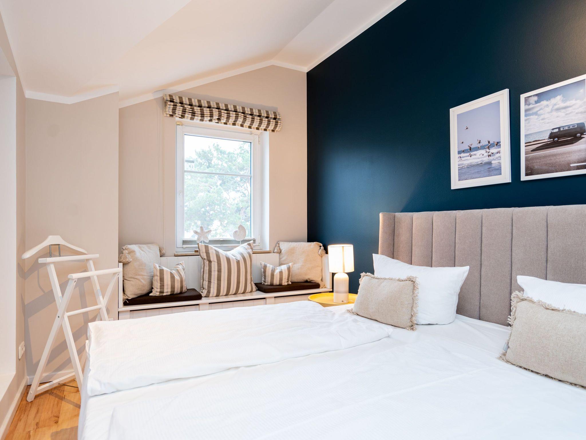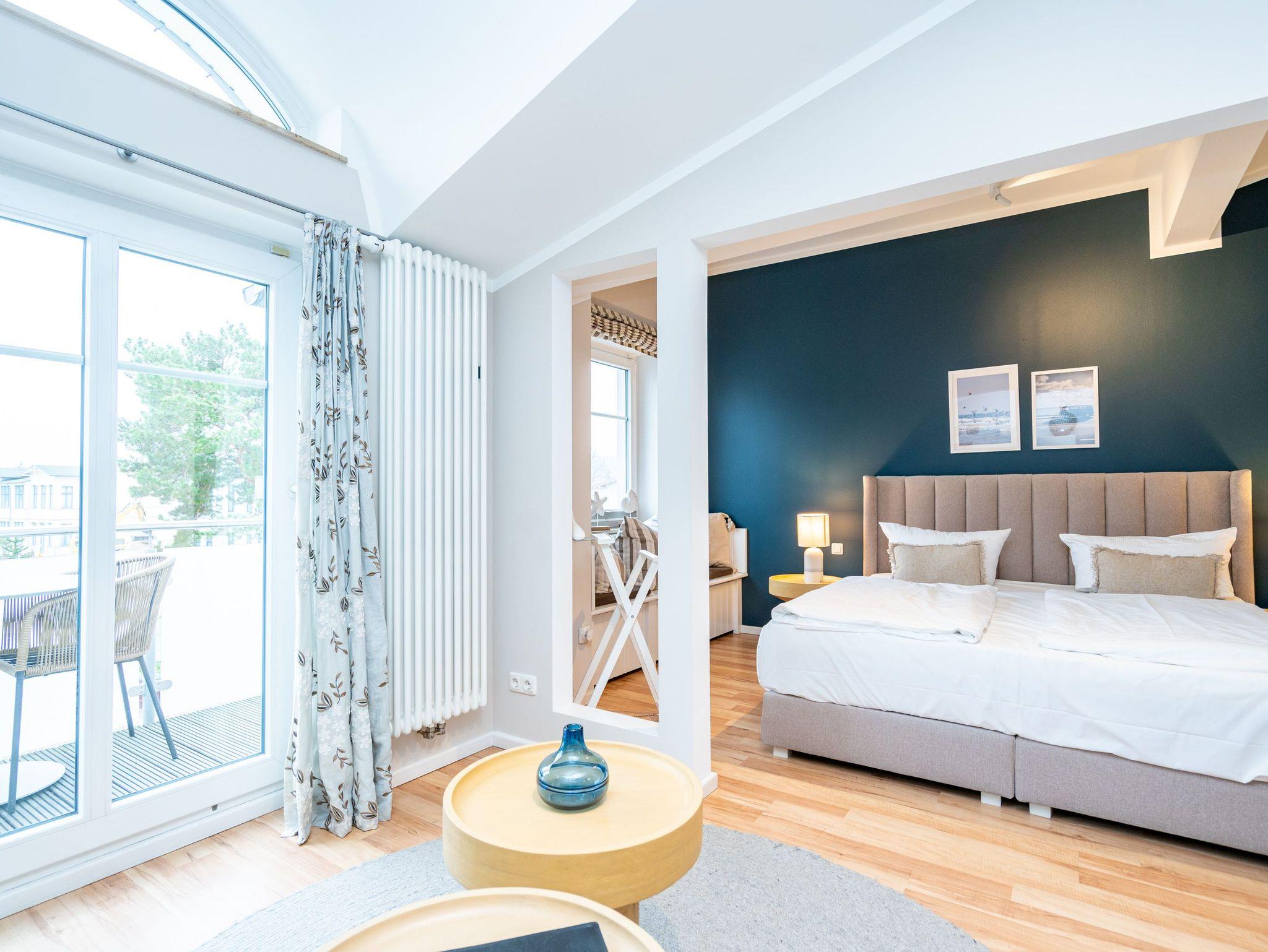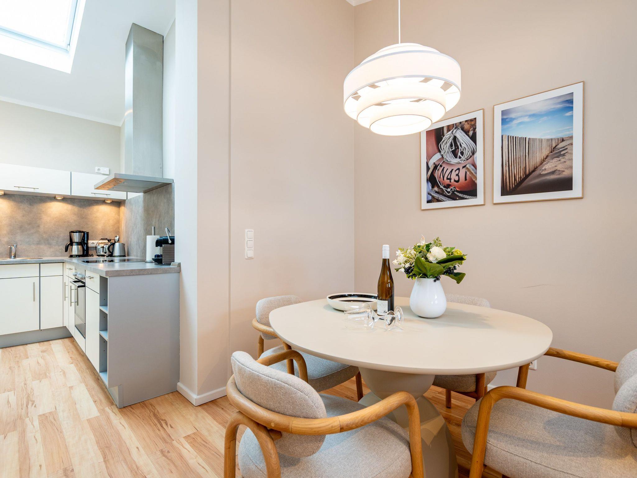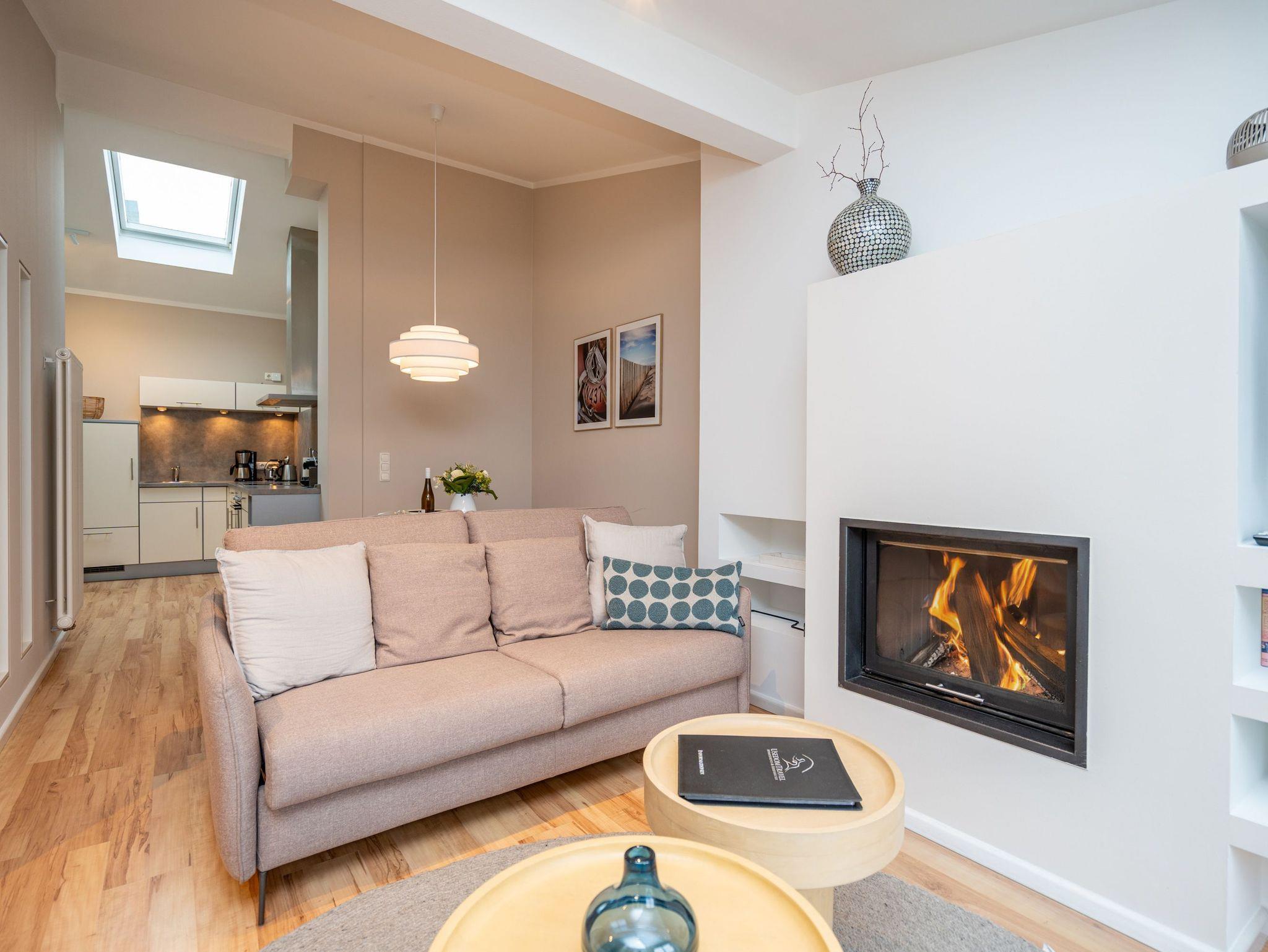 Bezaubernde Ferienwohnung mit lauschigem Suite-Charakter für 2 Personen! Im Dachgeschoss des Hauses heißt Sie dieses charmante 2-Raum-Appartement willkommen und lädt ein zu kuschligen Stunden am Kamin. Lümmeln Sie dabei nach Herzenslaune auf dem Sofa oder im Bett ? das offene Schlafzimmer bietet Blick auf TV und Kamin. Die Möblierung des Appartements: leicht, luftig mit warmen Sandtönen und überaus liebevoll und komplett ausgestattet, mit technischen Feinheiten (Flat-TV, DVD, Minianlage). Die voll ausgestattete, offene Küche und ein großzügiges Bad mit Dusche und WC ergänzen die Räumlichkeiten. Ein kleiner, möblierter Balkon bietet sogar Ausblick auf die Ostsee. Für den Tag am Meer steht Ihnen als besonderes Bonbon von Mitte Mai bis Ende September (je nach Witterung) ein Strandkorb am Strand kostenlos zur Verfügung. Das WLAN-Netz im Haus kann kostenfrei genutzt werden. Zur Wohnung gehört der wohnungseigene Tiefgaragenstellplatz Nr. 11 ? reserviert und bequem erreichbar. Ankommen und Wohlfühlen!