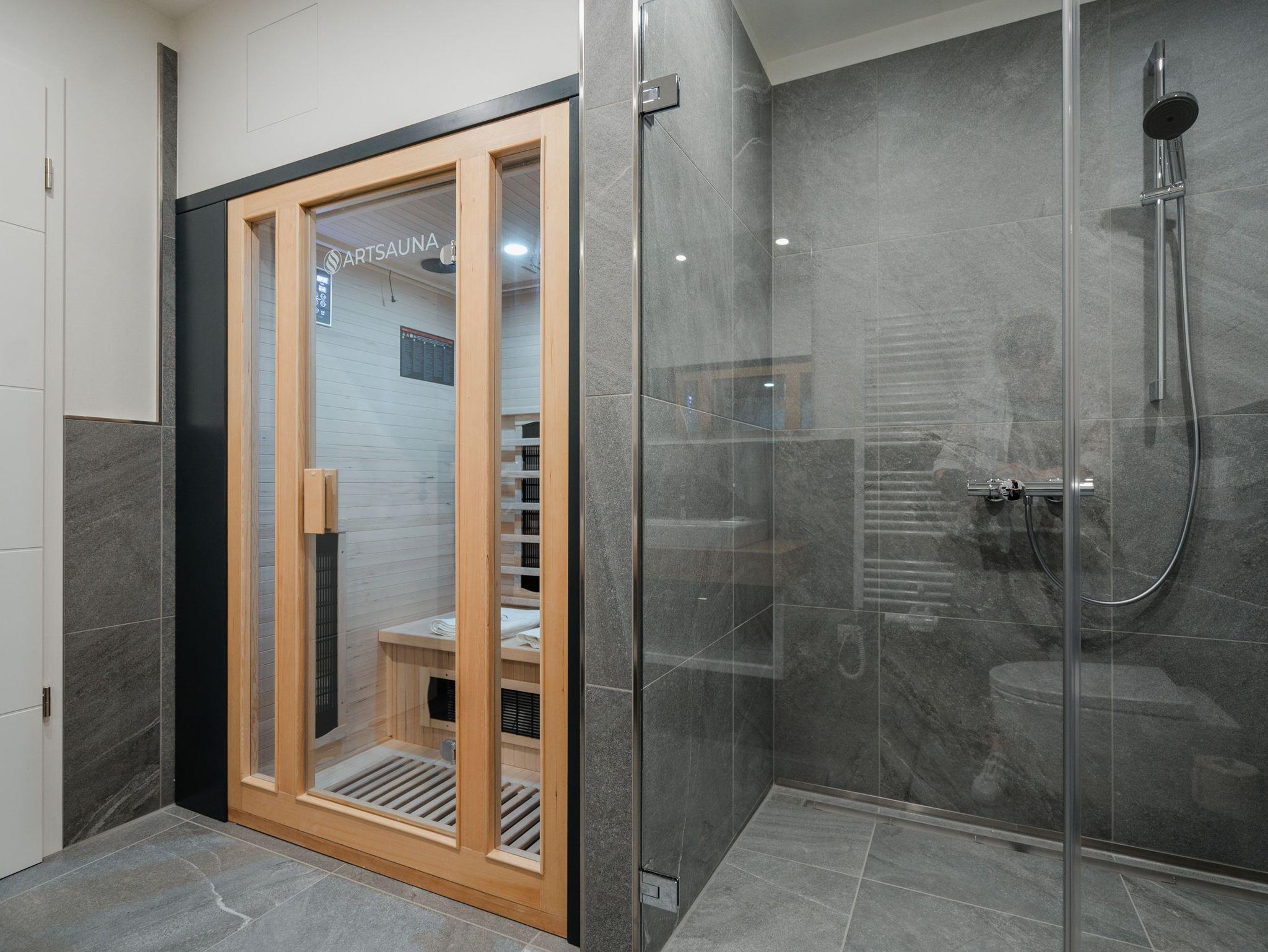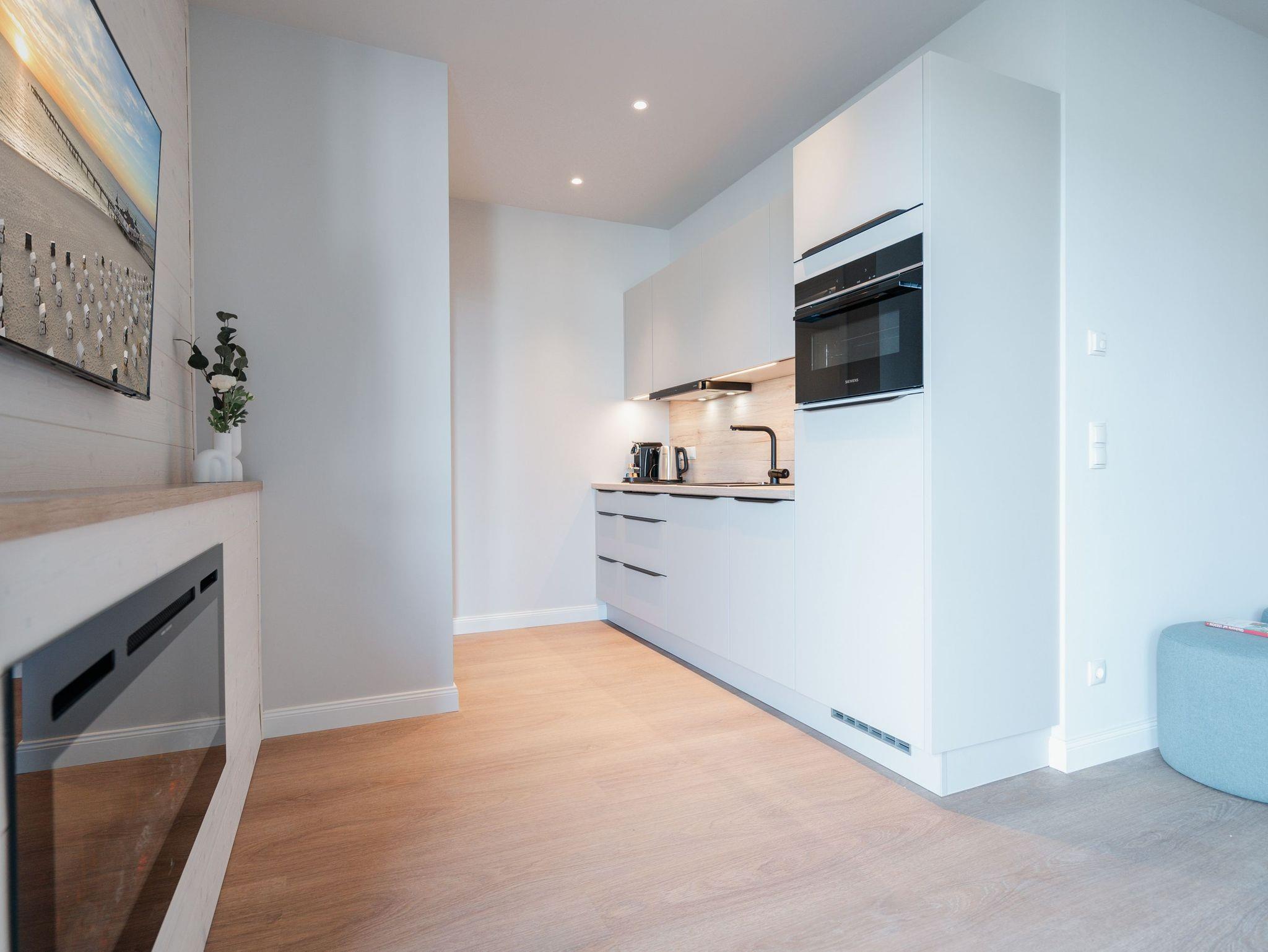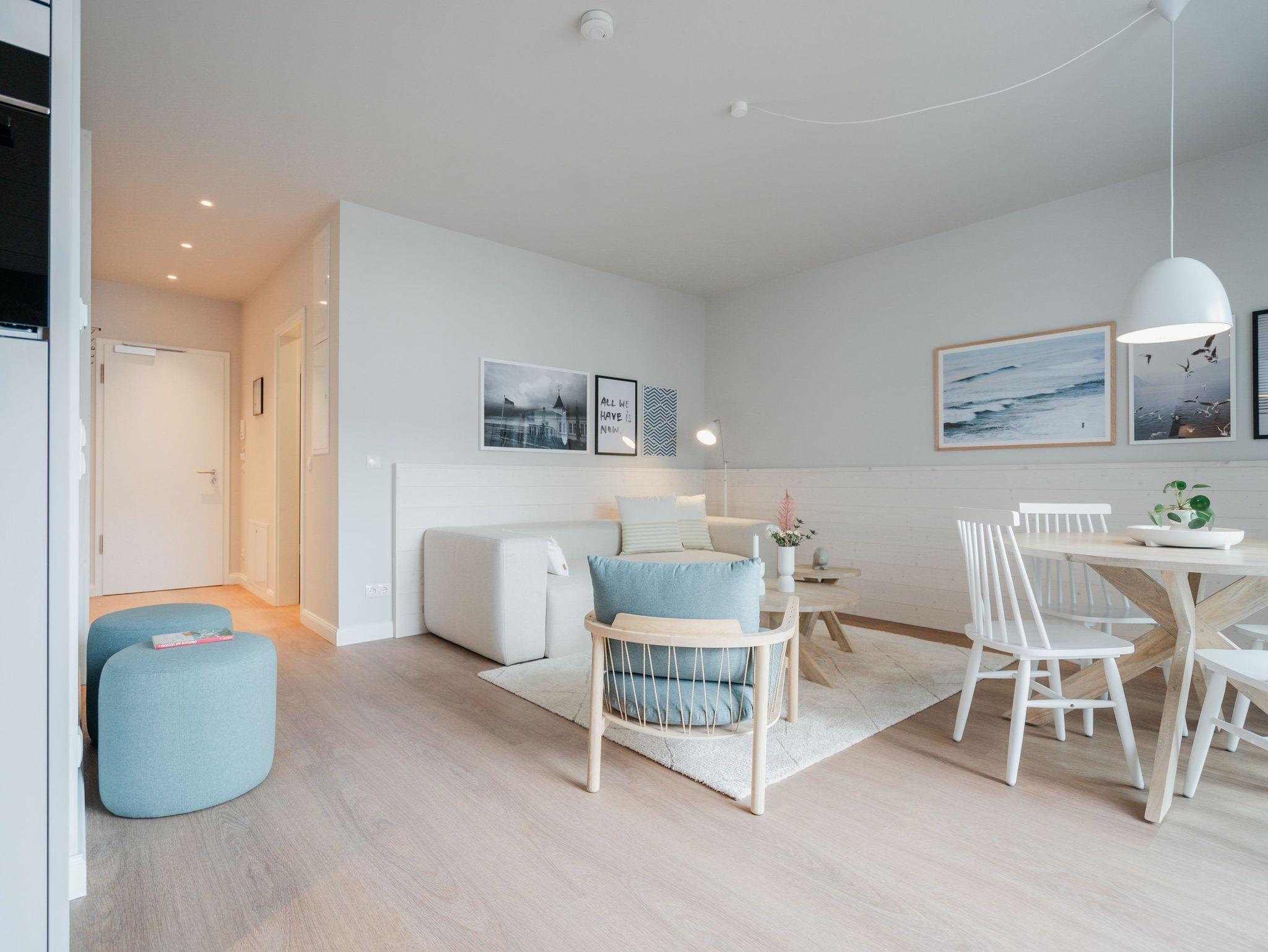 Hell und einladend ist das 60 Quadratmeter große 2-Raum-Appartement B 1.9 im Haus B der Strandterrasse. Es ist ein kuscheliges Urlaubsparadies für bis zu 2 Personen und 1 Kind bis 5 Jahre in der 1. Etage. Ein harmonisches Wohnkonzept empfängt Sie schon beim Ankommen. Alles zielt auf Ihr Wohlfühlen ab und ist mit einem Händchen für stylisches Interieur eingerichtet. Mit seinen großen Fenstern öffnet sich das Appartement vom Wohnzimmer und vom Schlafzimmer aus auf einen Nord-Balkon mit Balkonmöbeln. Hier an einem lauen Sommermorgen unter freiem Himmel zu frühstücken oder abends mit einem kühlen Getränk den Tag bei Meeresrauschen ausklingen zu lassen, ist ein Traum. Im Inneren der Wohnung sorgt eine gemütliche Atmosphäre für das entspannende Urlaubsgefühl. Ein offenes Wohn-Esszimmer ist der ideale Ort zum Runterkommen und Auftanken. Entspannen Sie auf dem gemütlichen Sofa vor dem großer Flat-TV (50 Zoll). Erfreuen Sie sich am Flackern des Elektrokamins (ohne Wärmeabgabe) und kommen Sie zur Ruhe. Die in den Wohnraum integrierte Küche ist mit allen Annehmlichkeiten wie einem Backofen, einem 3-Platten-Induktionsherd, einem Geschirrspüler und einer Nespresso-Kapselmaschine ausgestattet. Ein gemütlicher Essplatz lädt zum Genießen ein. Im Schlafzimmer wartet ein bequemes Boxspringdoppelbett (1,80m x 2,00m) sowie ein Kindertagesbett (0,80m x 1,40m) nur darauf, Ihnen einen erholsamen Schlaf und süße Träume zu schenken. Ein Kleiderschrank und ein Flat-TV (43 Zoll) gehören ebenfalls zur Ausstattung. Im modernen Bad sorgt die Fußbodenheizung dafür, dass Sie morgens nach dem Aufstehen garantiert keine kalten Füßen bekommen. Eine Dusche, ein Waschtisch und ein WC komplettieren die Einrichtung. Damit Sie so richtig abschalten und neue Energie tanken können, verfügt das Badezimmer zudem über eine Infrarotsaunakabine. Stellen Sie Ihr Auto einfach auf Ihrem Stellplatz in der Tiefgarage ab und schon kann die unvergesslich schöne Auszeit am Meer beginnen.