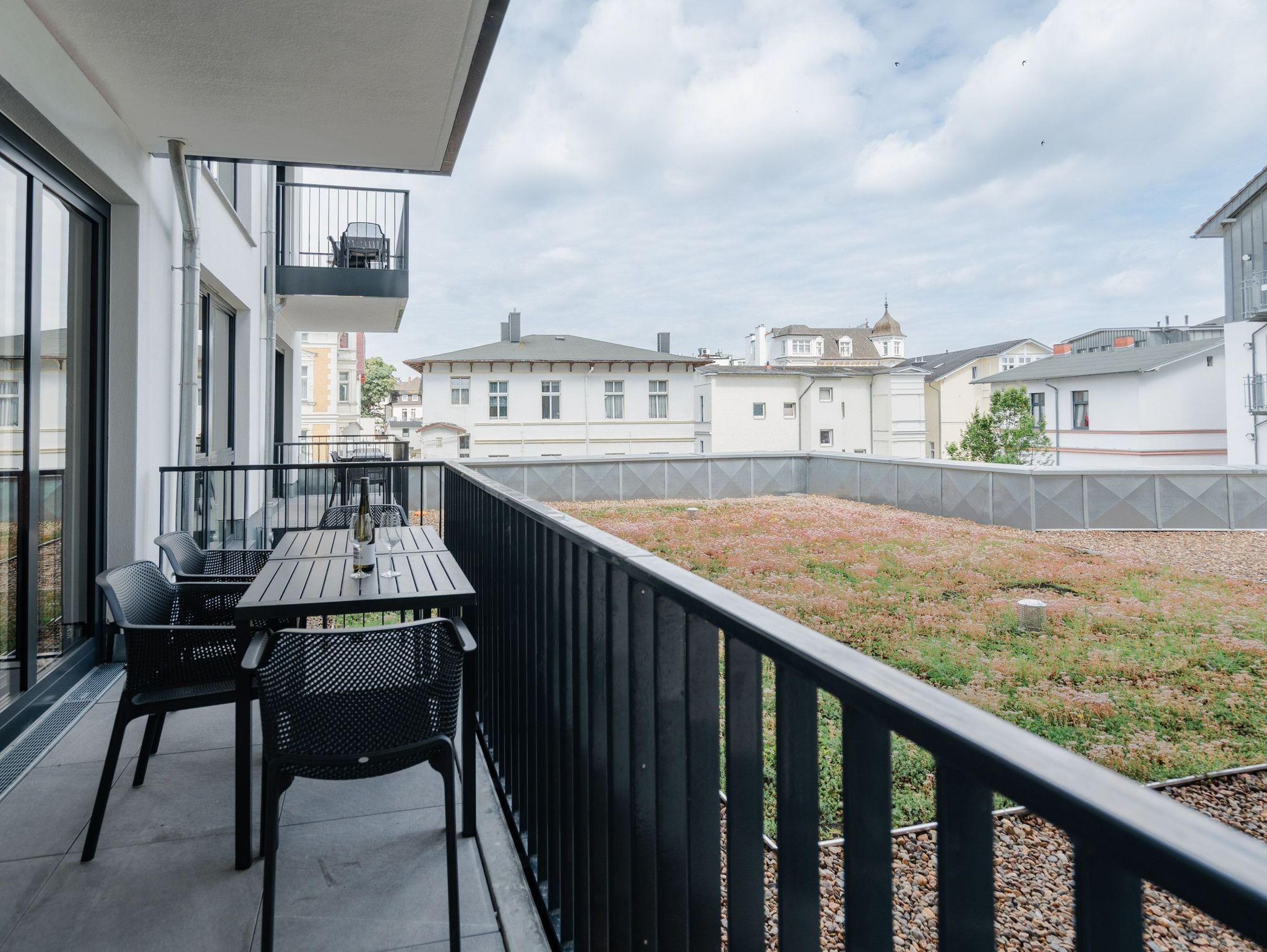 Die 2024 fertig gestellte Strandterrasse liegt direkt an der belebten Strandpromenade und bietet einen einzigartigen Ausblick auf die Grand Dame der historischen Seebrücken sowie die historische Konzertmuschel, einem beliebten Treffpunkt für Kunst und Kultur. Dahinter liegt die Ostsee ? ein Panorama, das zu den schönsten in den Kaiserbädern gehört. Es ist wie das Abtauchen in eine andere Zeit. In eine Zeit, in der man mit Stock, Sonnenschirm und Hut fürs ?Sehen und gesehen werden? über die Promenade schlenderte; aber auch in eine Zeit, in der ? damals wie heute ? Zeit einmal für eine kurze Weile keine Rolle spielt. Weil man angekommen ist im Loslassen, Entspannen und Genießen. Es ist dieser besondere Geruch nach Meeresluft und Freiheit, der in Erinnerung bleibt. Dazu die Bilder, die man mitnimmt. Von langen Strandspaziergängen, vom Lachen in fröhlich schäumenden Ostseewellen, von der Zeit in einem wunderschönen Urlaubsdomizil. Denn genau das ist die Strandterrasse mit ihren 56 modernen und exklusiven Ferienappartements direkt gegenüber der Ahlbecker Seebrücke. Die Ein-, Zwei- oder Dreizimmerwohnungen ? zwischen 40 und 70 Quadratmeter groß ? sind von einer Innenarchitektin gemeinsam mit unserem Erfahrungsschatz an Gästewünschen mit viel Liebe zum Detail und ganz individuell konzipiert worden. Entspannung und Wohlfühlen stehen an erster Stelle. Alles ist aufeinander abgestimmt und sorgt für eine gemütliche Atmosphäre. Wählen Sie zwischen einem Domizil in einem hellen, sandfarbenen Designkonzept oder einem Appartement mit anthrazitfarbenen Farbakzenten. Alle Appartements verfügen gleichermaßen über eine stilvolle und komfortable Einrichtung, die passgenau angefertigt worden ist, sowie über moderne Küchen und Bäder. Jedem Schlafzimmer ist ein eigenes Bad mit Dusche zugeordnet (außer App. B4.5). Die Appartements besitzen fast alle einen Balkon ? viele schauen sogar zur Ostsee hinaus. Die meisten Feriendomizile haben einen Elektrokamin und Infrarotsaunen. Im Erdgeschoss befindet sich ein separater Gemeinschaftsraum für Fahrräder. Außerdem besteht die Möglichkeit, im Gemeinschaftswaschraum 2 Waschmaschinen [&] Trockner zu nutzen. Ergänzt wird das Angebot durch eine Gemeinschaftssauna, die täglich von 11:00 bis 22:00 Uhr nutzbar ist. In der Tiefgarage (Einfahrtshöhe 2,03 Meter) steht für jede Wohnung 1 Pkw-Stellplatz zur Verfügung. Ist alles zur Zufriedenheit untergebracht? Dann kann der Urlaub ja beginnen. Und beim Blick vom Balkon über die Ostsee treffen sich zum Sonnenaufgang das Heute und das Damals. Gelassenheit legt sich beim Gang hinunter an den Strand auf die Seele. Jetzt darf die Zeit stehenbleiben.