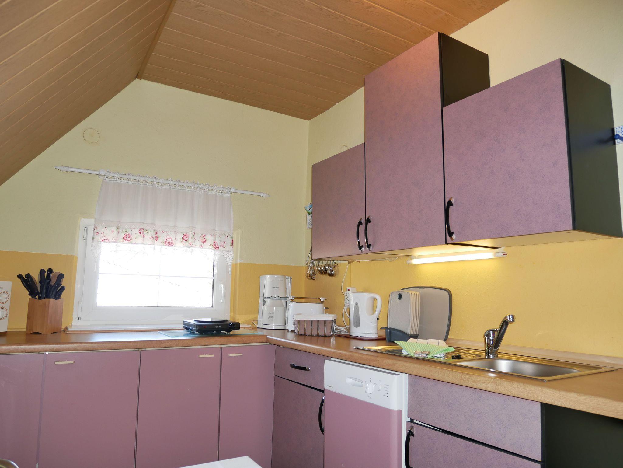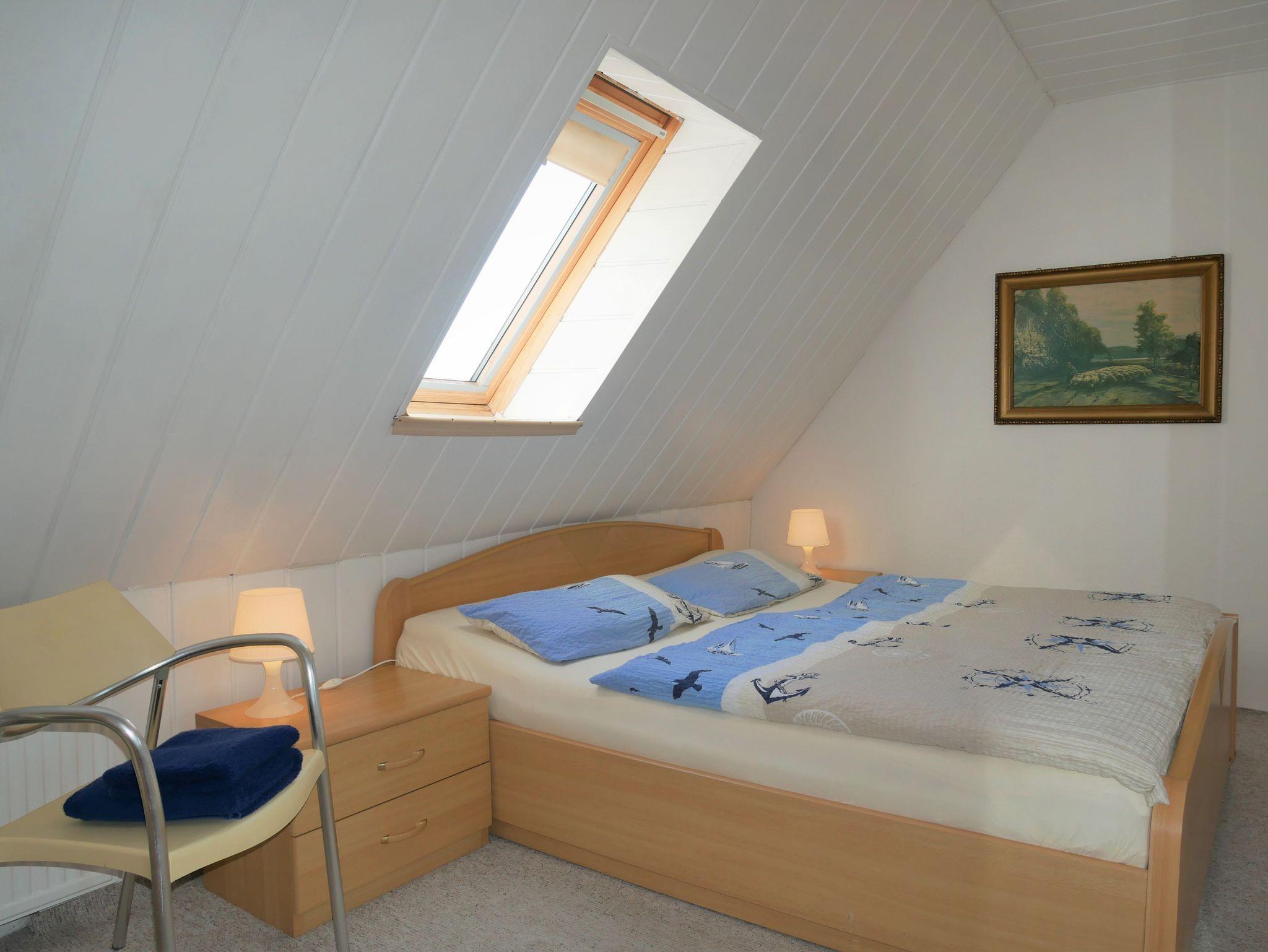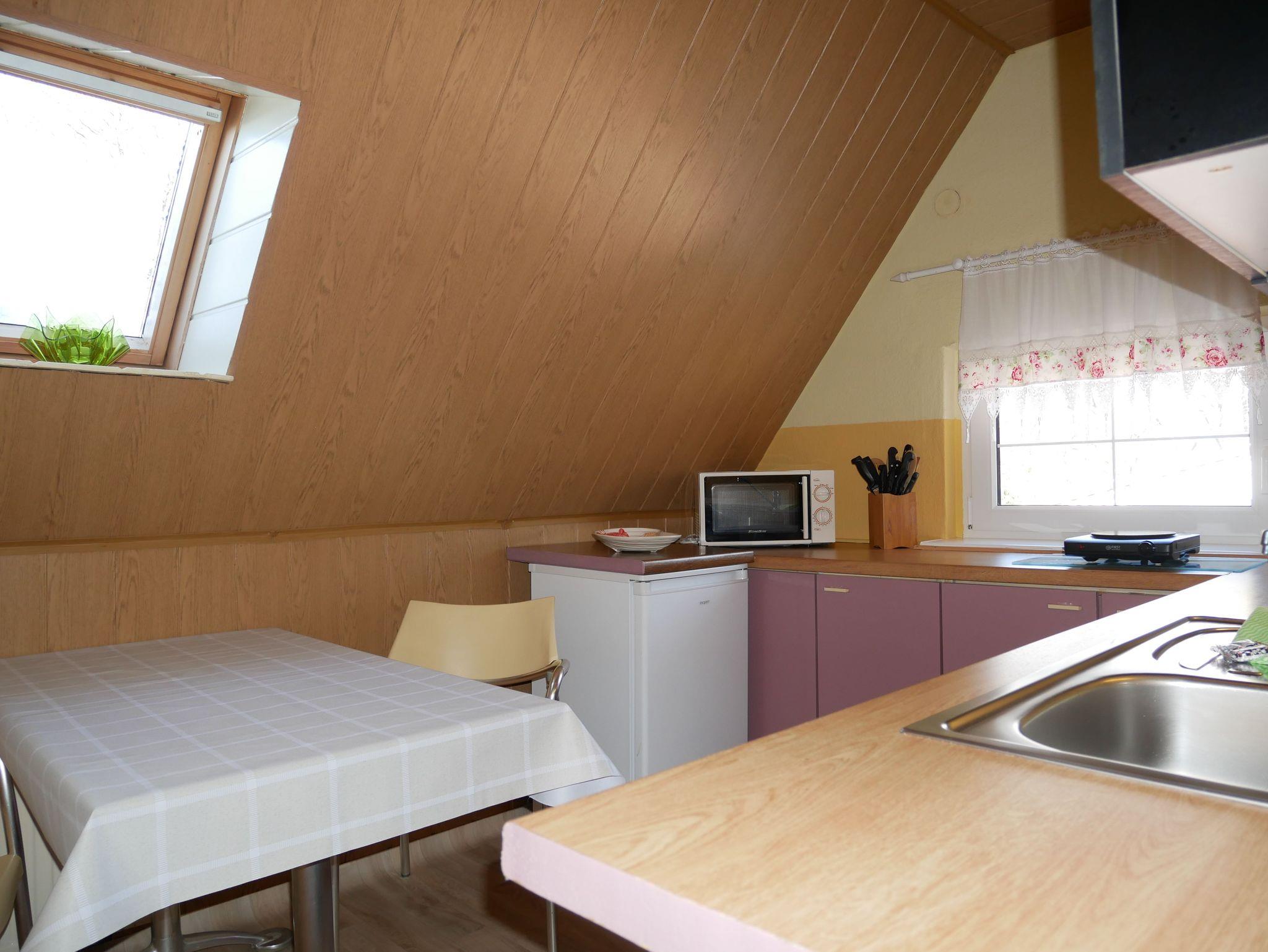 Die gemütliche 2-Zimmer-Ferienwohnung befindet sich im Dachgeschoss im Haus der Vermieter und ist ca. 55qm groß und für 2-3 Personen gut geeignet. Die Ferienwohnung verfügt über ein Wohnzimmer mit Flachbild-TV und Sofa (Schlafsofa) eine Küche mit Geschirrspüler, Mikrowelle, Doppelkochplatte, Kühlschrank mit Gefrierfach, Wasserkocher, Kaffeemaschine, Toaster und Esstisch. Das separate Schlafzimmer ist mit einem Doppelbett und Kleiderschrank ausgestattet. Das Badezimmer hat durch Dachschrägen bedingt eine niedrige Deckenhöhe und bietet eine Badewanne, WC und Haartrockner. Die Erstausstattung Bettwäsche und Handtücher ist bereits inklusive und WLAN steht Ihnen während des Aufenthaltes ebenfalls kostenfrei zur Verfügung.