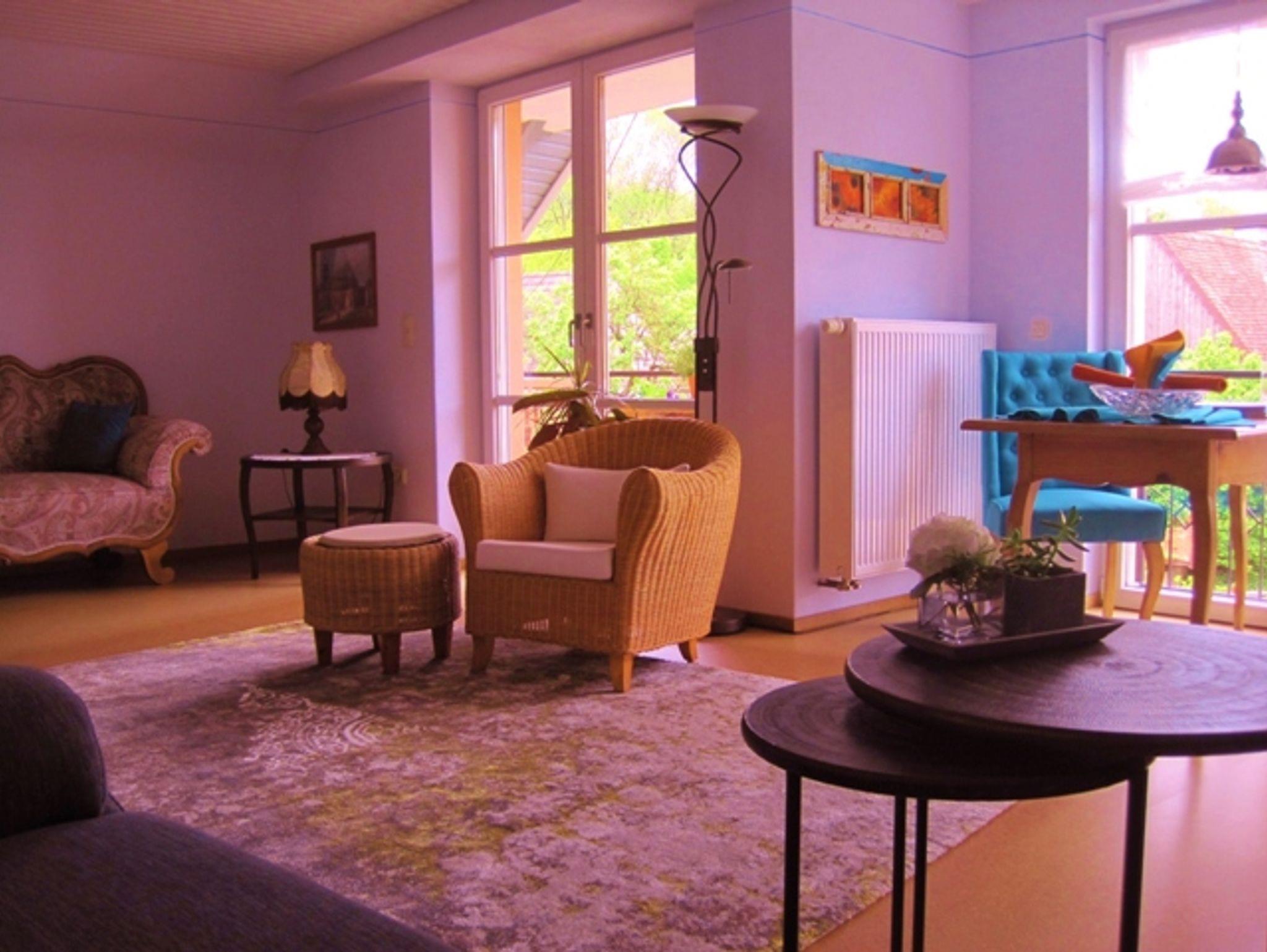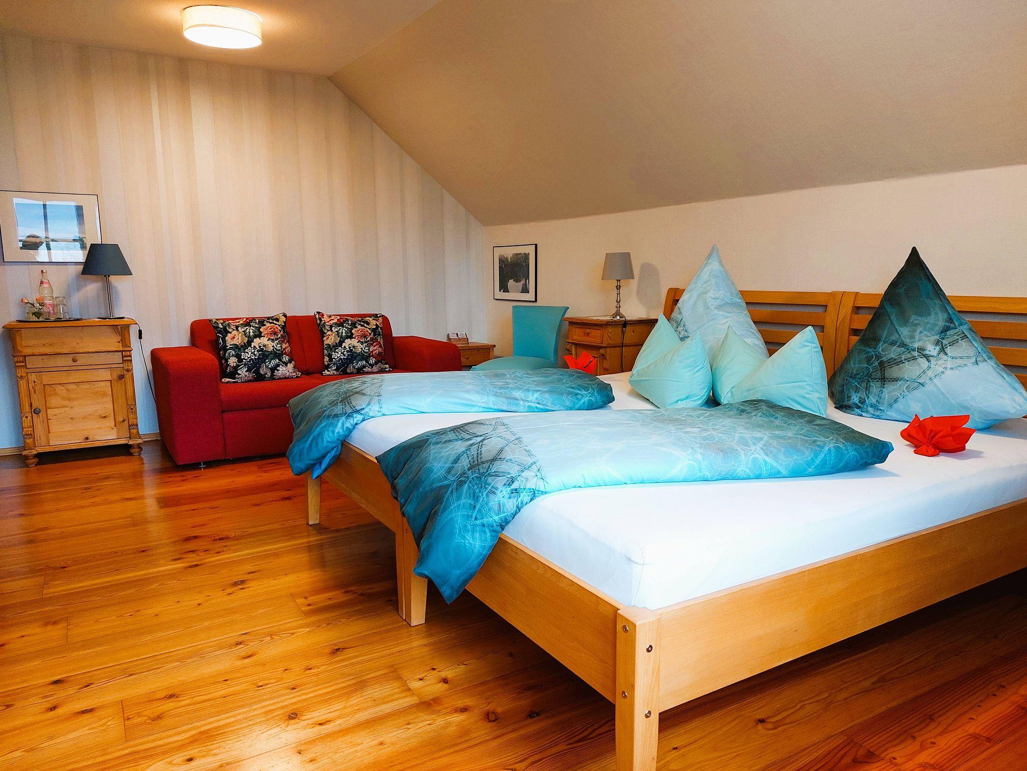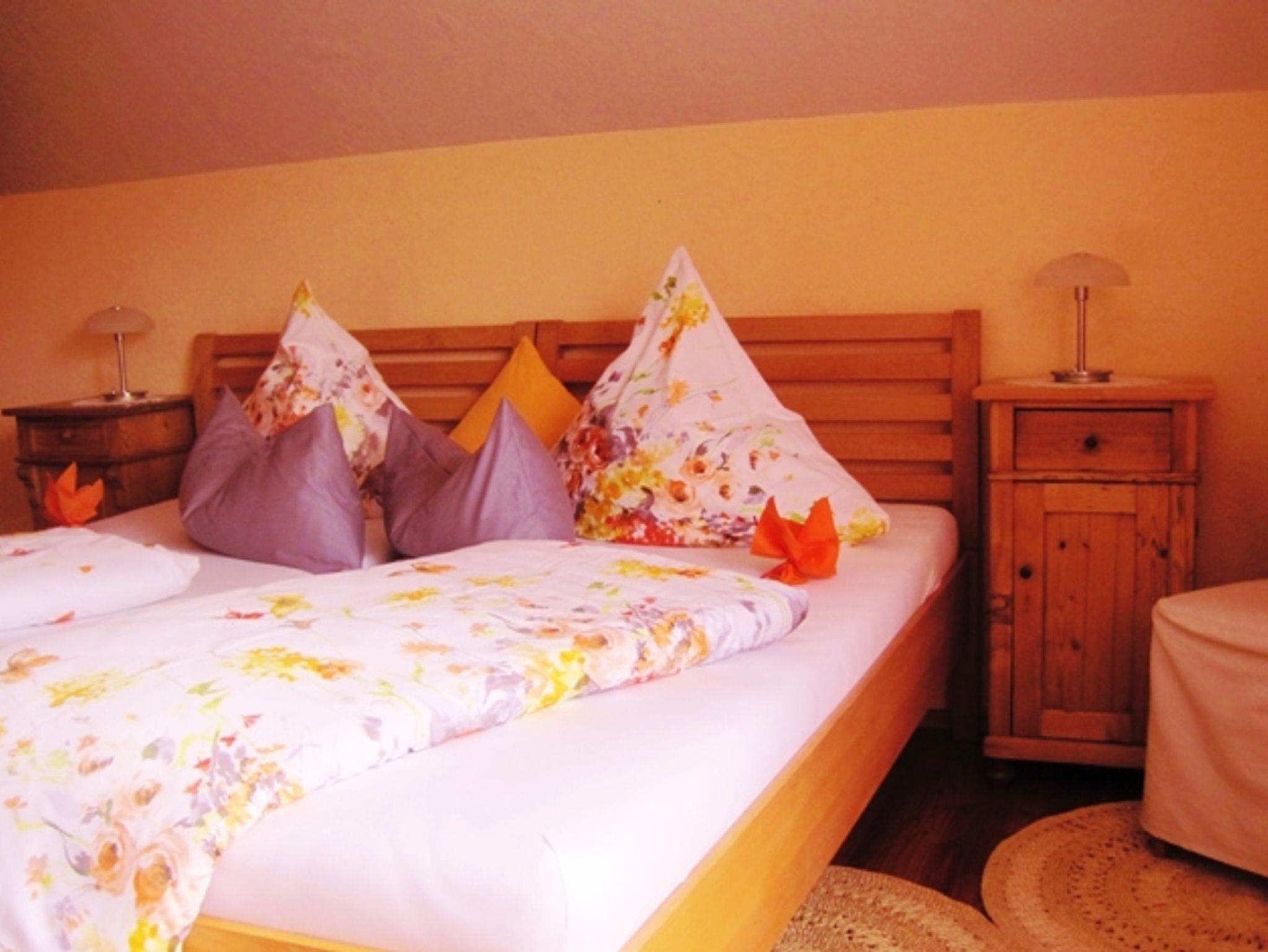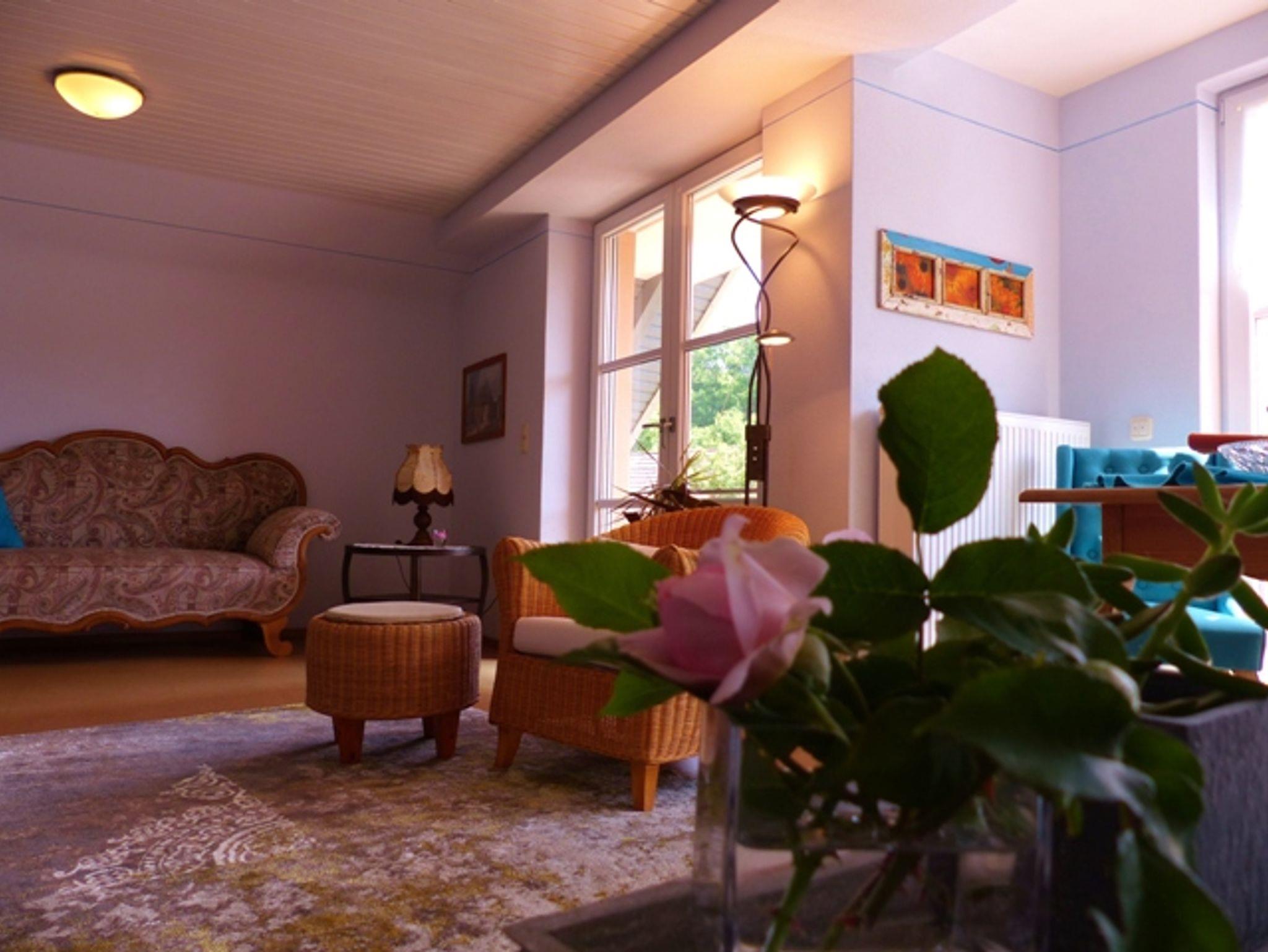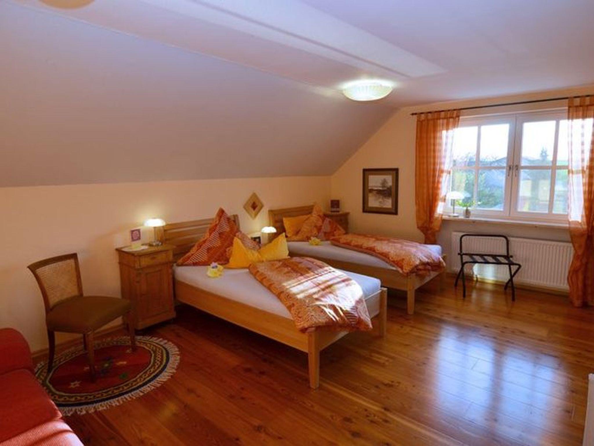 115qm große Wohnung im Obergeschoß des Hauses, großzügiger Gästegarten , 2 Schlafräume, 1 Wohnraum mit Schlafsofa, 1 Wohnküche, Balkon, Allergiker geeignet, W-lan, Telefon, 2 Fahrräder, Brötchen-Frühstücksservice auf Wunsch.