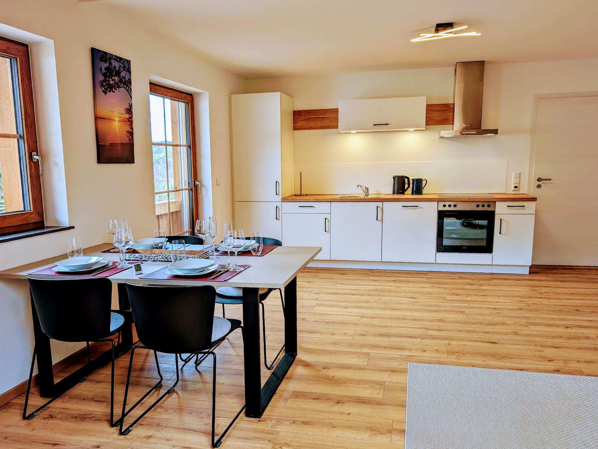 In der modernen Wohnküche finden Sie eine voll ausgestattete Küchenzeile sowie einen großen Esstisch für bis zu 5 Personen.