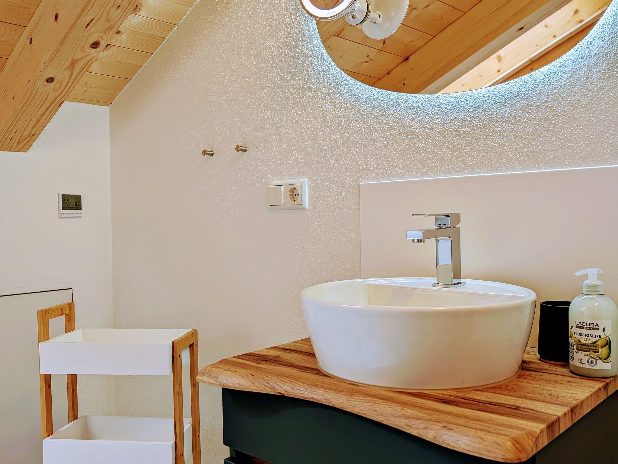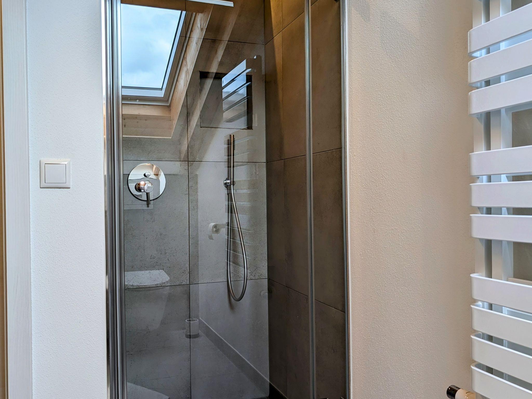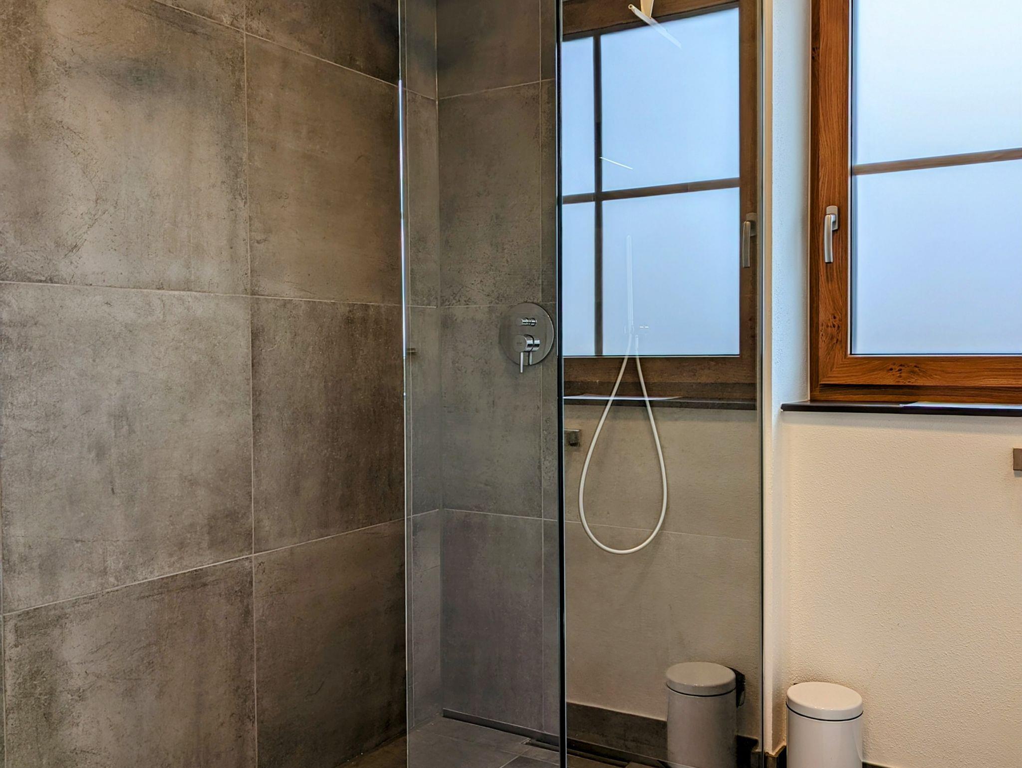 Das Badezimmer besitzt eine ebenerdig begehbare Regendusche, einen Waschtisch und ein WC.