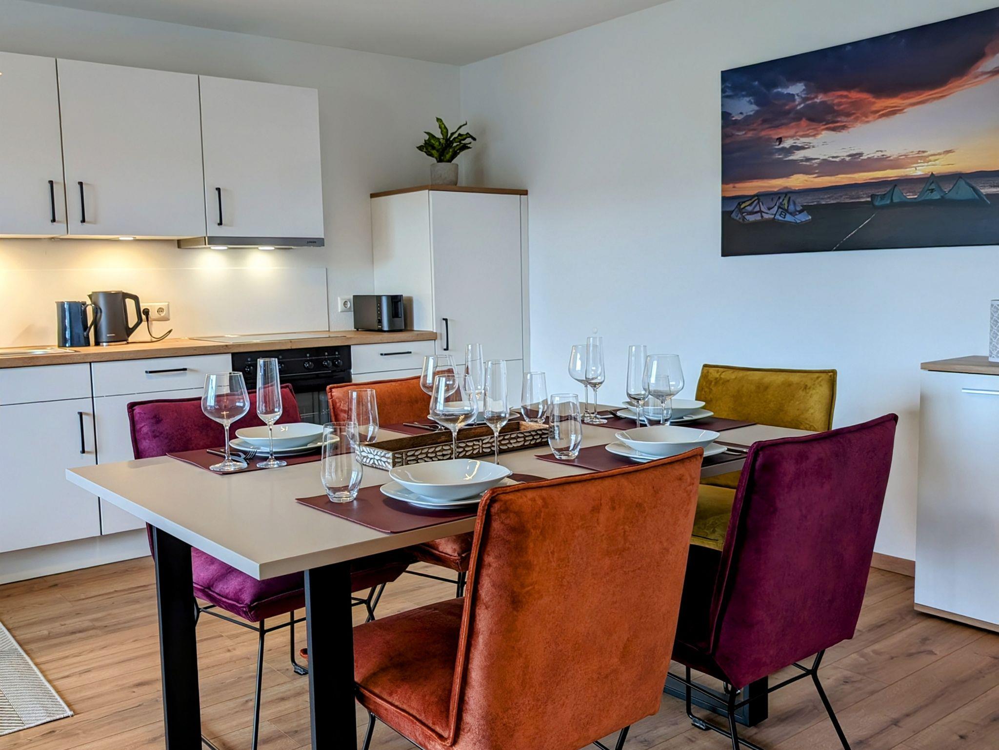 Die moderne Wohnküche lädt zum gemeinsamen Kochen und Essen ein. Eine voll ausgestattete Küchenzeile sowie ein großer Esstisch für bis zu 5 Personen stehen zur Verfügung. Eine großzügige 4-Sitzer-Schlafcouch mit einer integrierten 1,50 m Matratze bietet zusätzlichen Schlafplatz.
