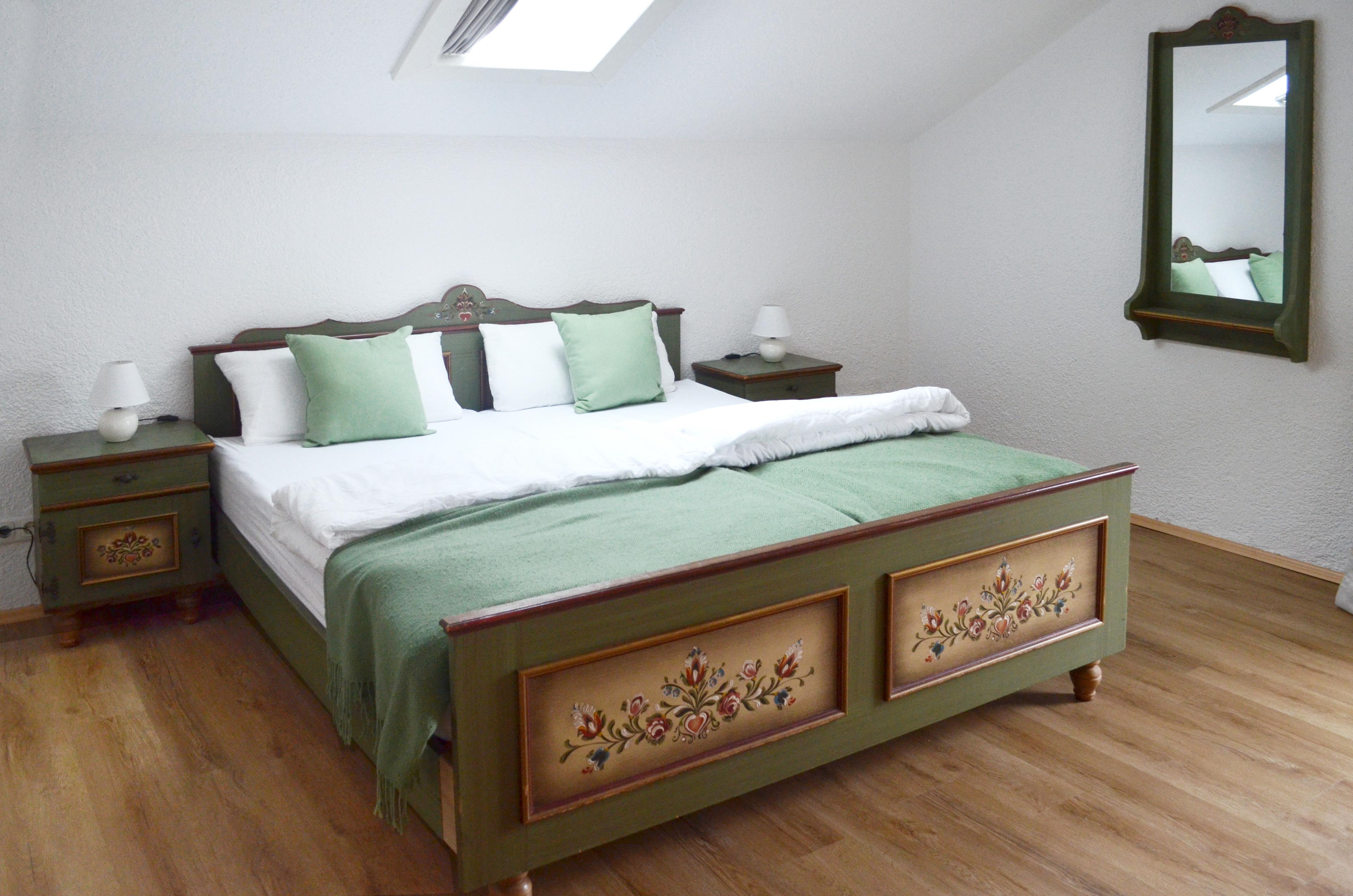 Schlafen: Das erste Schlafzimmer mit seinem liebevoll bemalten Doppelbett (1,85x2,00m) lädt zum Träumen ein. Die passenden Nachttische, der Spiegel und die Stühle machen das Ensemble komplett. Im großen Schrank ist ausreichend Platz. Das zweite Schlafzimmer bietet mit einem Doppelbett (1,45x2,00m) und einem Einzelbett (0,90x2,00m) Platz für 3 Personen. Die Sofas im Wohnzimmer und Obergeschoss können jeweils als weitere Schlafmöglichkeiten (je 1,40x2,00m) für 4 weitere Personen genutzt werden.