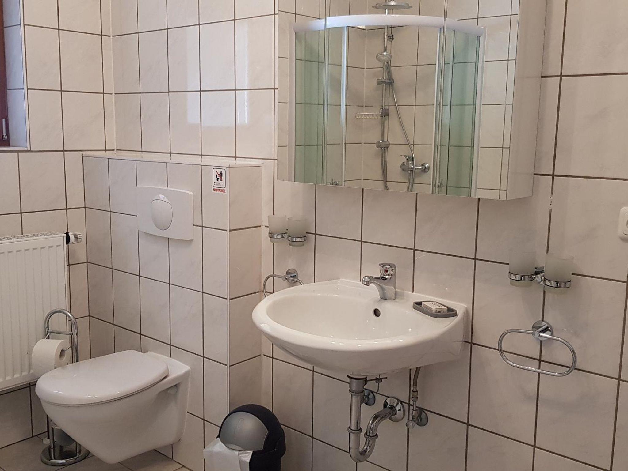 Ein sehr geräumiges Badezimmer mit WC und Dusche.