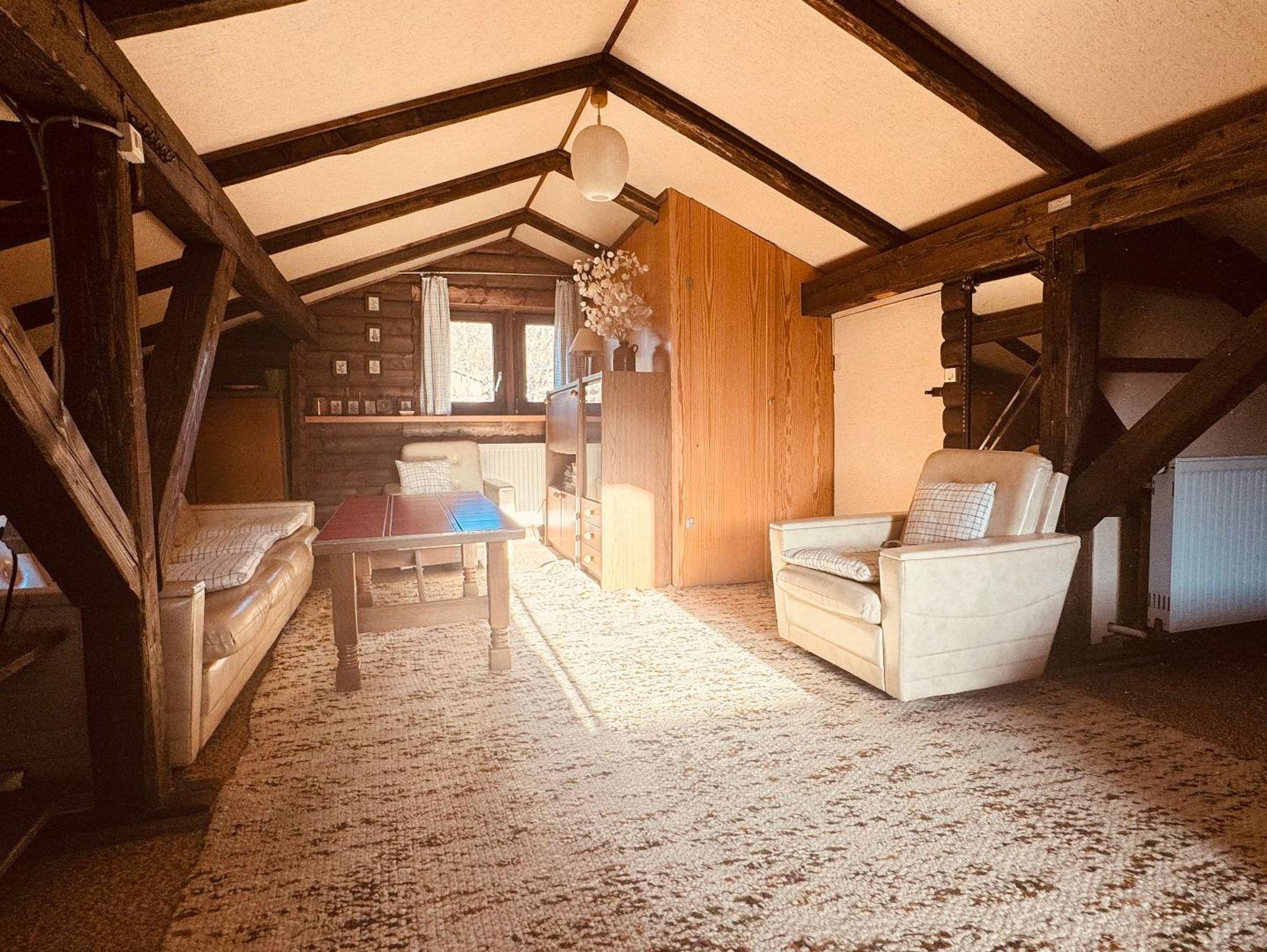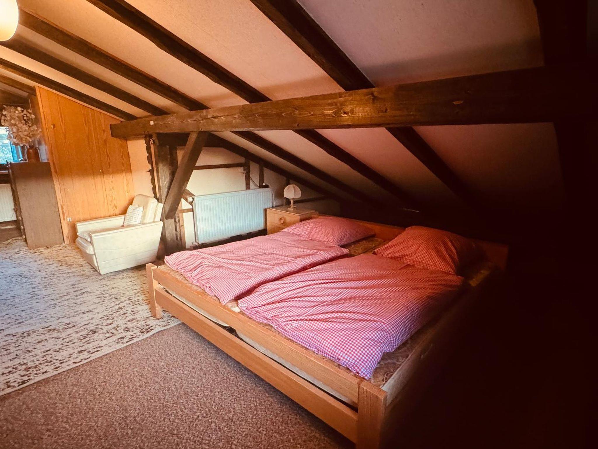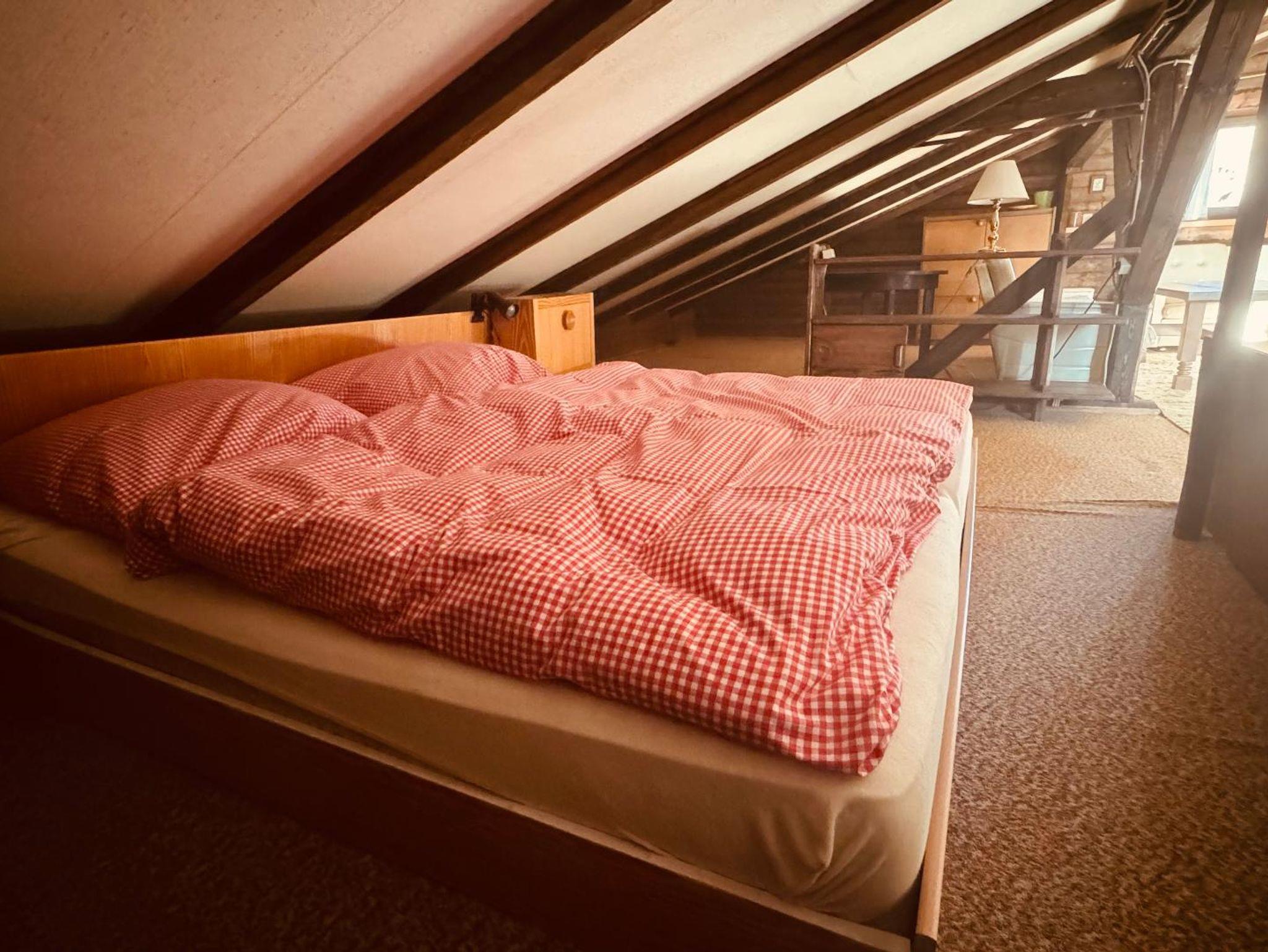 Im 1. OG befinden sich zwei Schlafzimmer (jeweils ein Doppelbett), ein Wohnzimmer, Küche und Bad (mit WC und Duschwanne), im Dachgeschoss befindet sich der dritte Schlaf- und Wohnraum mit zwei Doppelbetten, einem Sofa und einem extra WC.