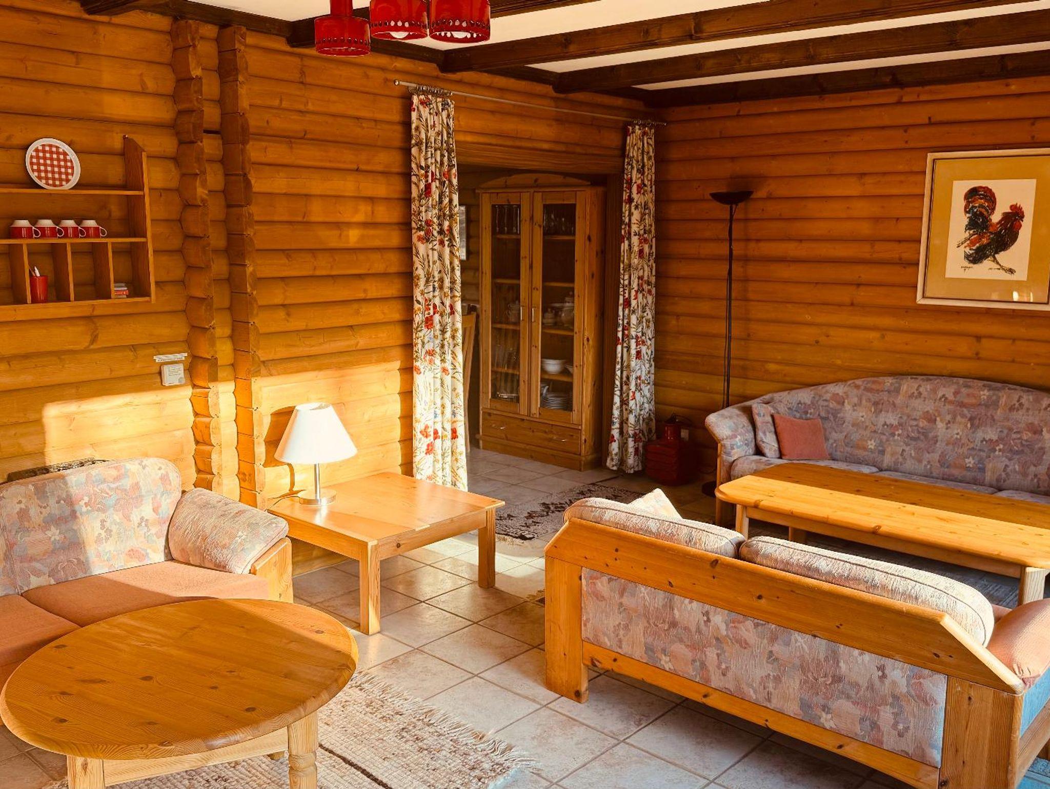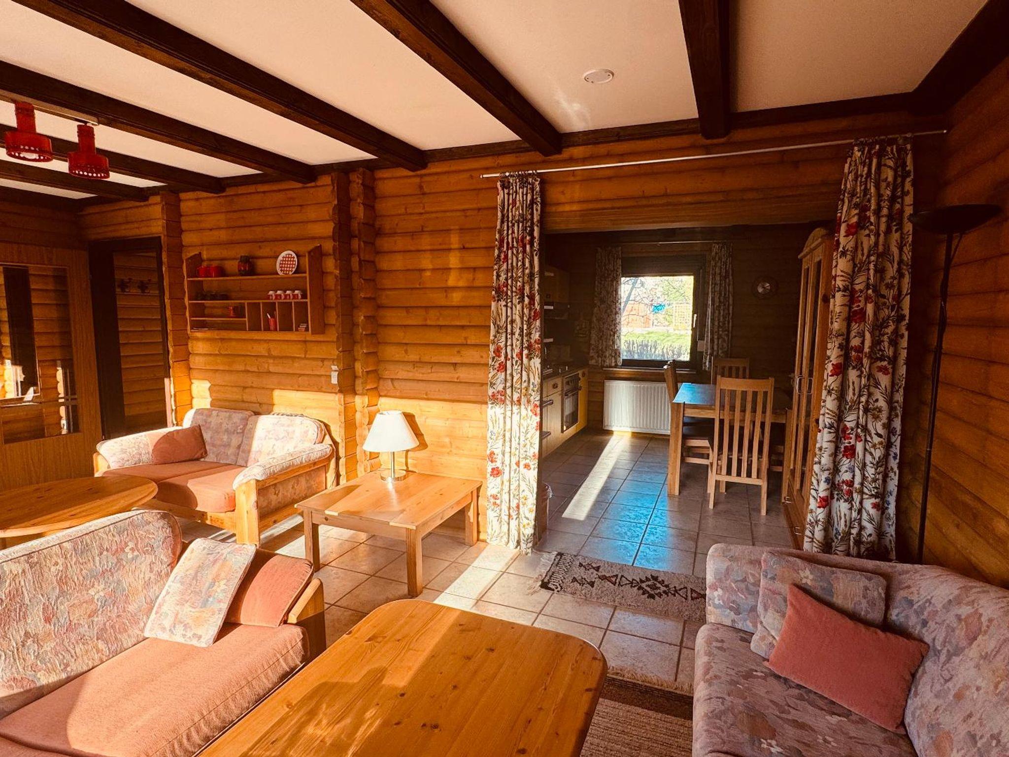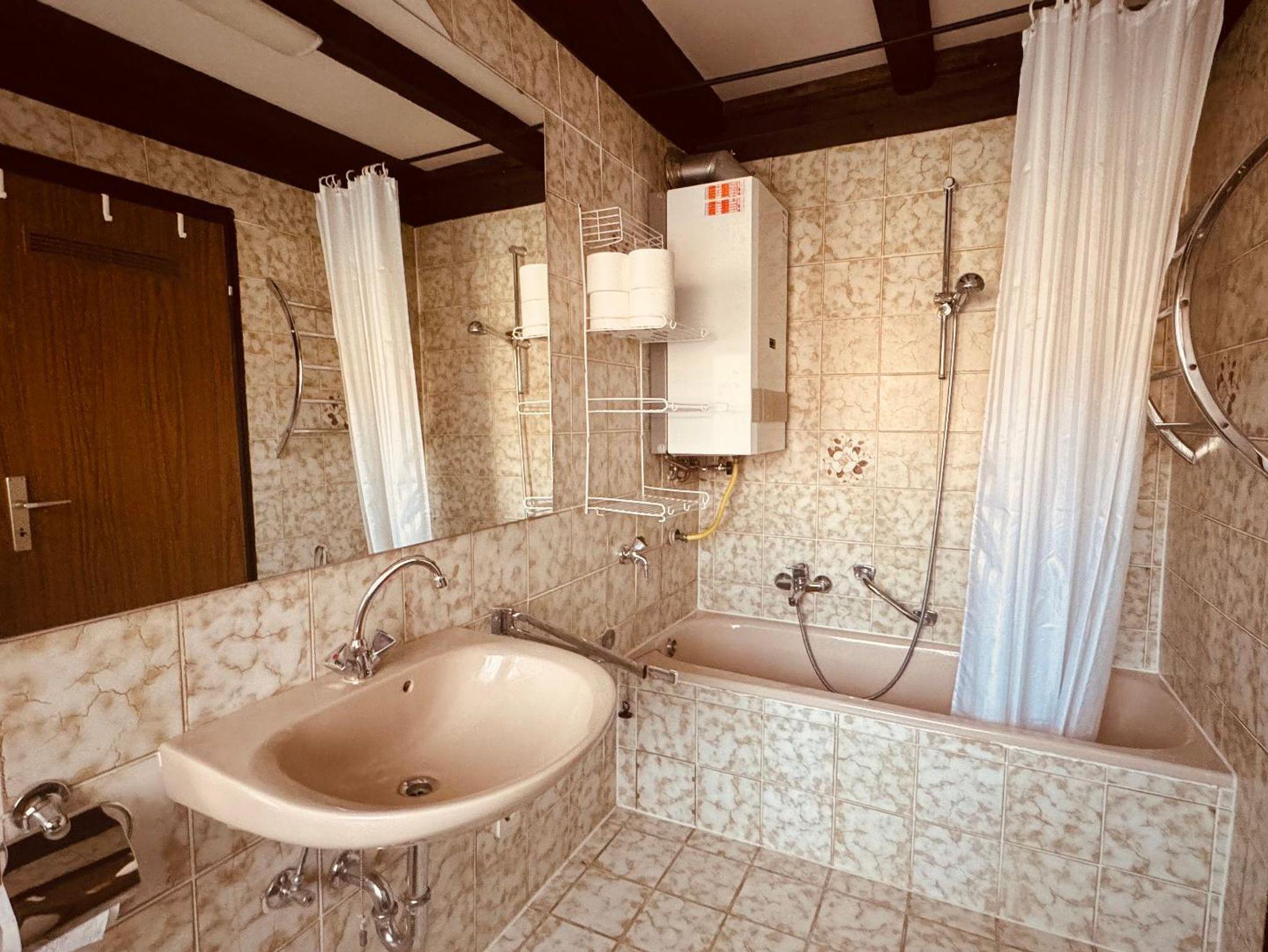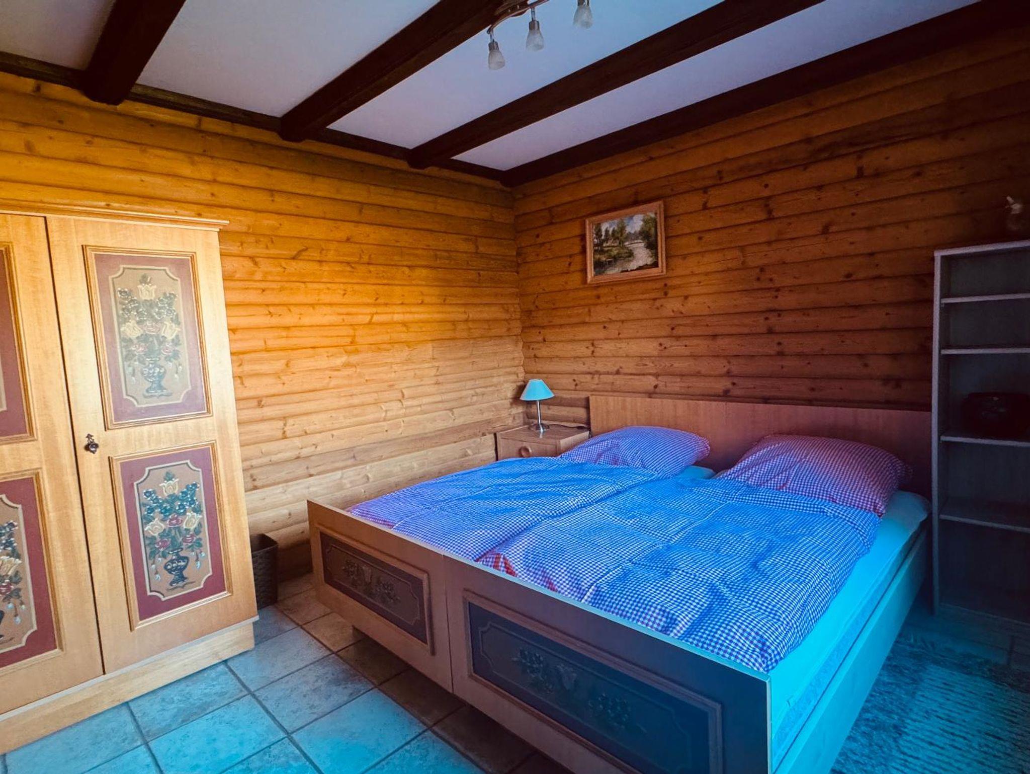 Im 1. OG befinden sich zwei Schlafzimmer (jeweils ein Doppelbett), ein Wohnzimmer, Küche und Bad (mit WC und Duschwanne), im Dachgeschoss befindet sich der dritte Schlaf- und Wohnraum mit zwei Doppelbetten, einem Sofa und einem extra WC.