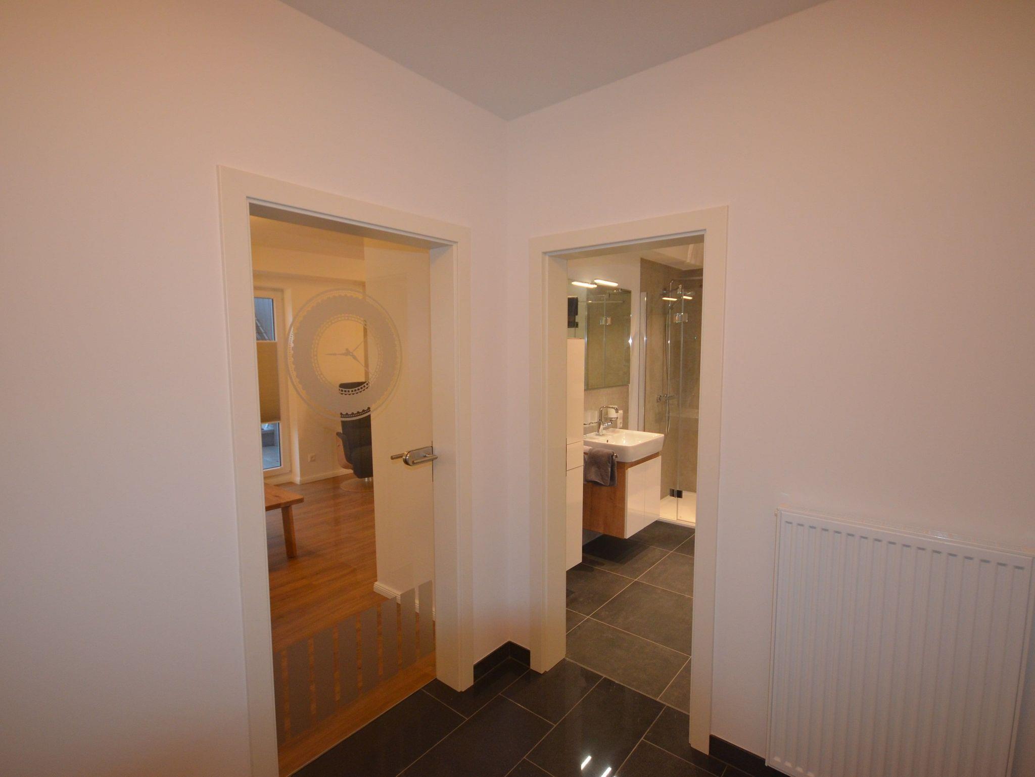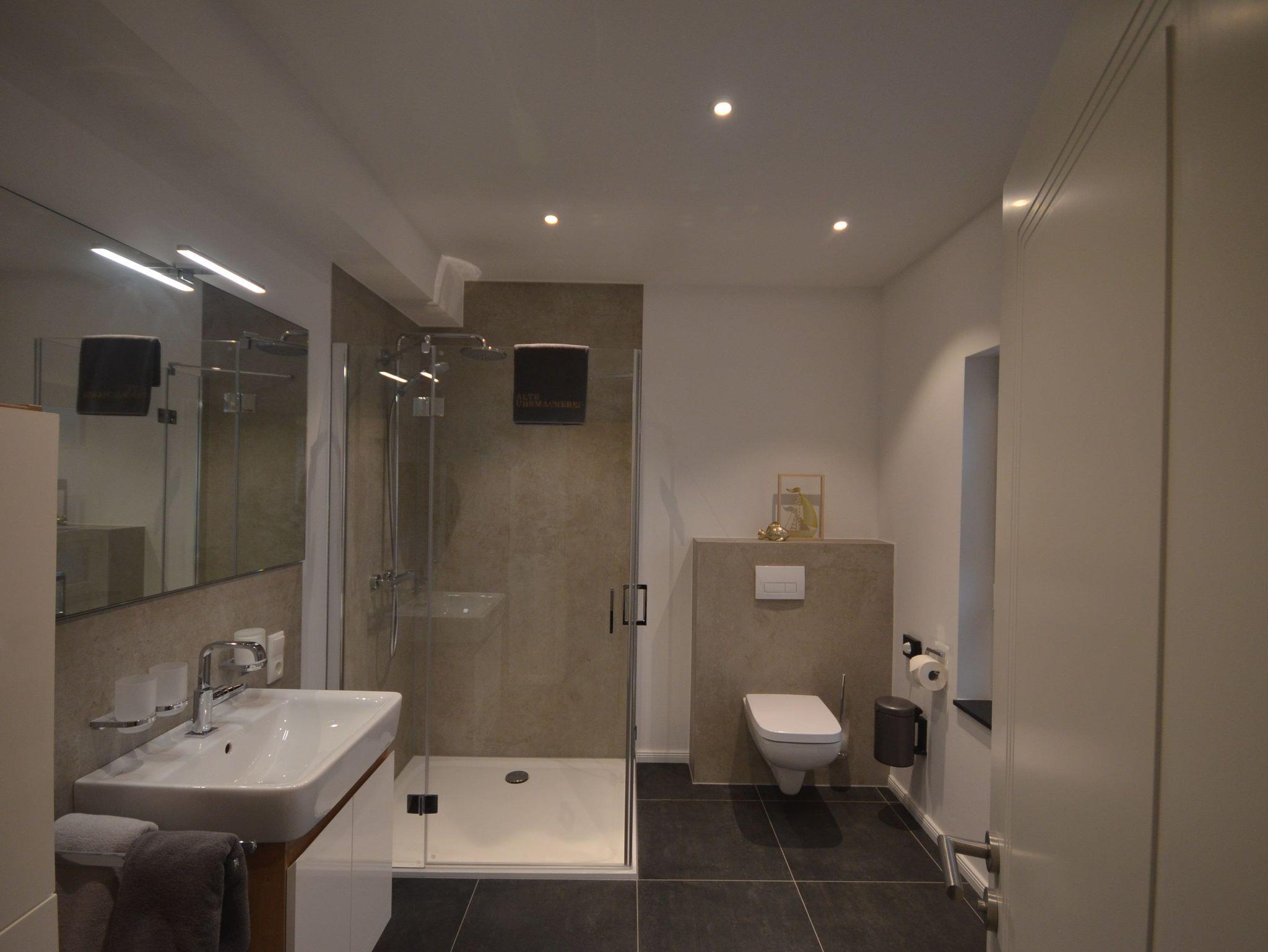 Das Tageslichtbad hat eine ebenerdige, verglaste Dusche (120 x 100 cm) mit Regendusche und Handbrause, einen Waschtisch, einen Handtuchheizkörper und ein WC, sowie ausreichende Ablageflächen und ein Einbauradio.