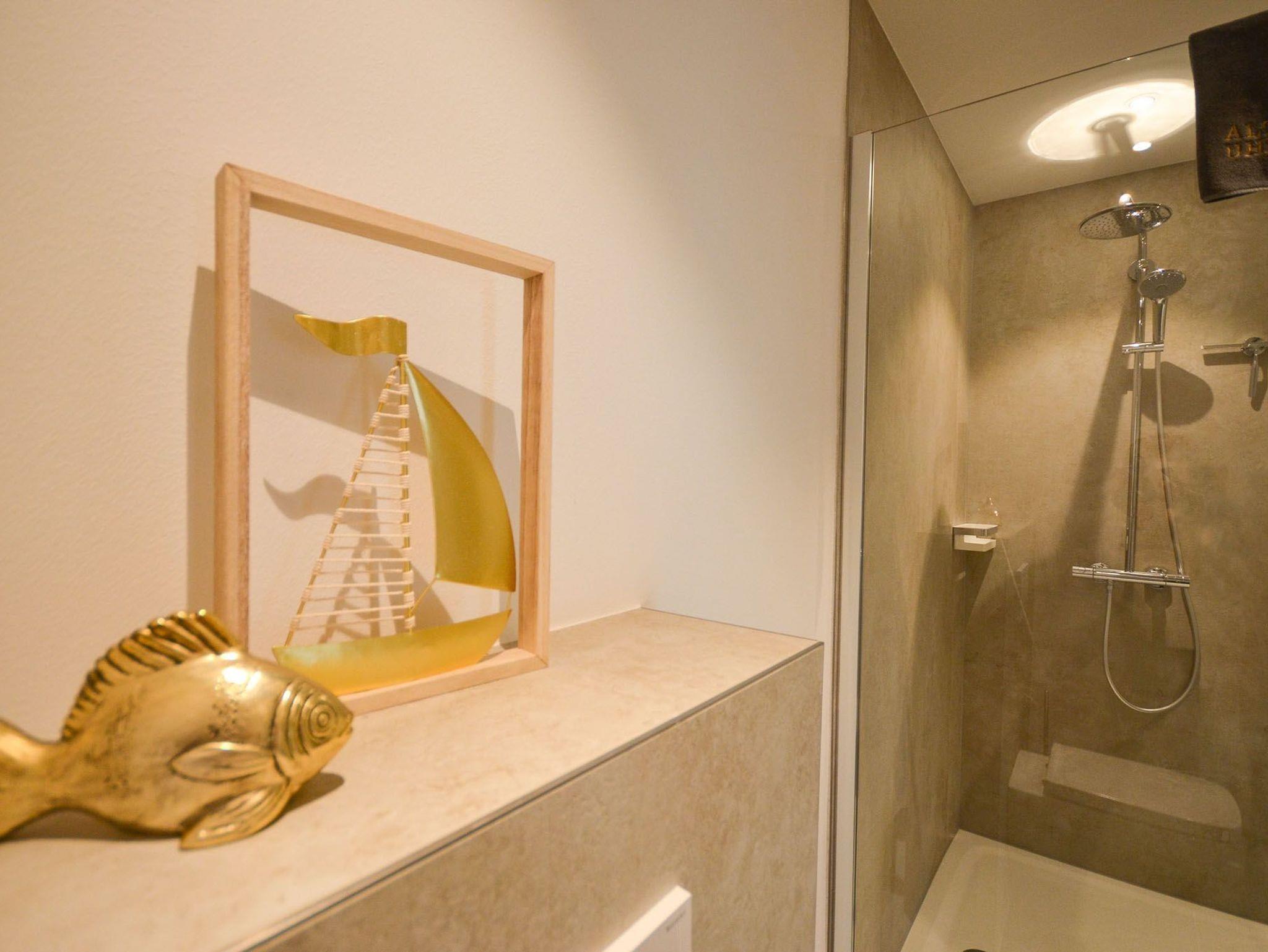 Das Bad hat eine ebenerdige, verglaste Dusche (140 x 100 cm) mit Regendusche und Handbrause, einen Waschtisch, einen Handtuchheizkörper und ein WC sowie ausreichende Ablageflächen und ein Einbauradio.