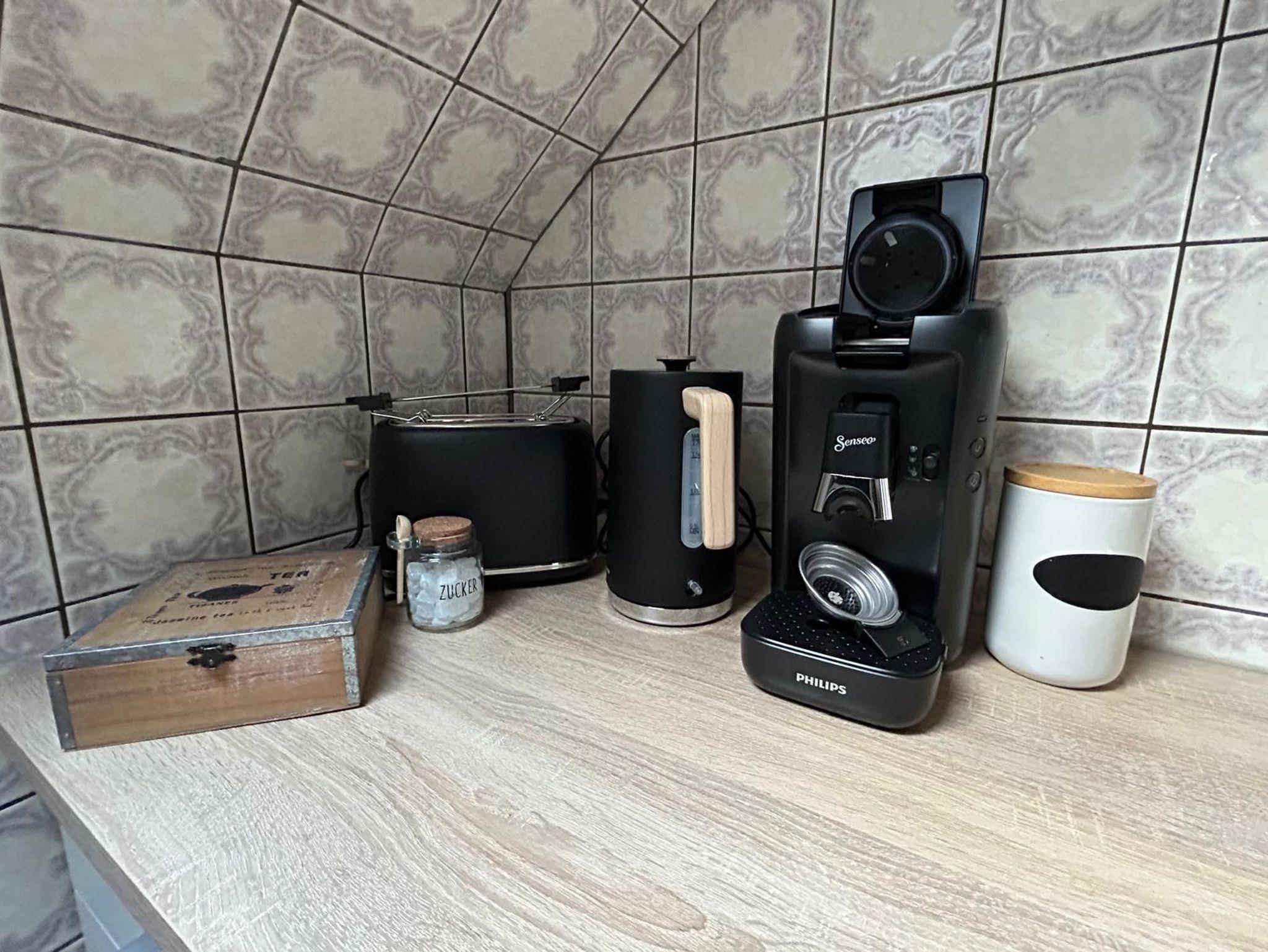 einen Backofen, eine Senseo-Kaffeemaschine und einen Kühlschrank. Eine