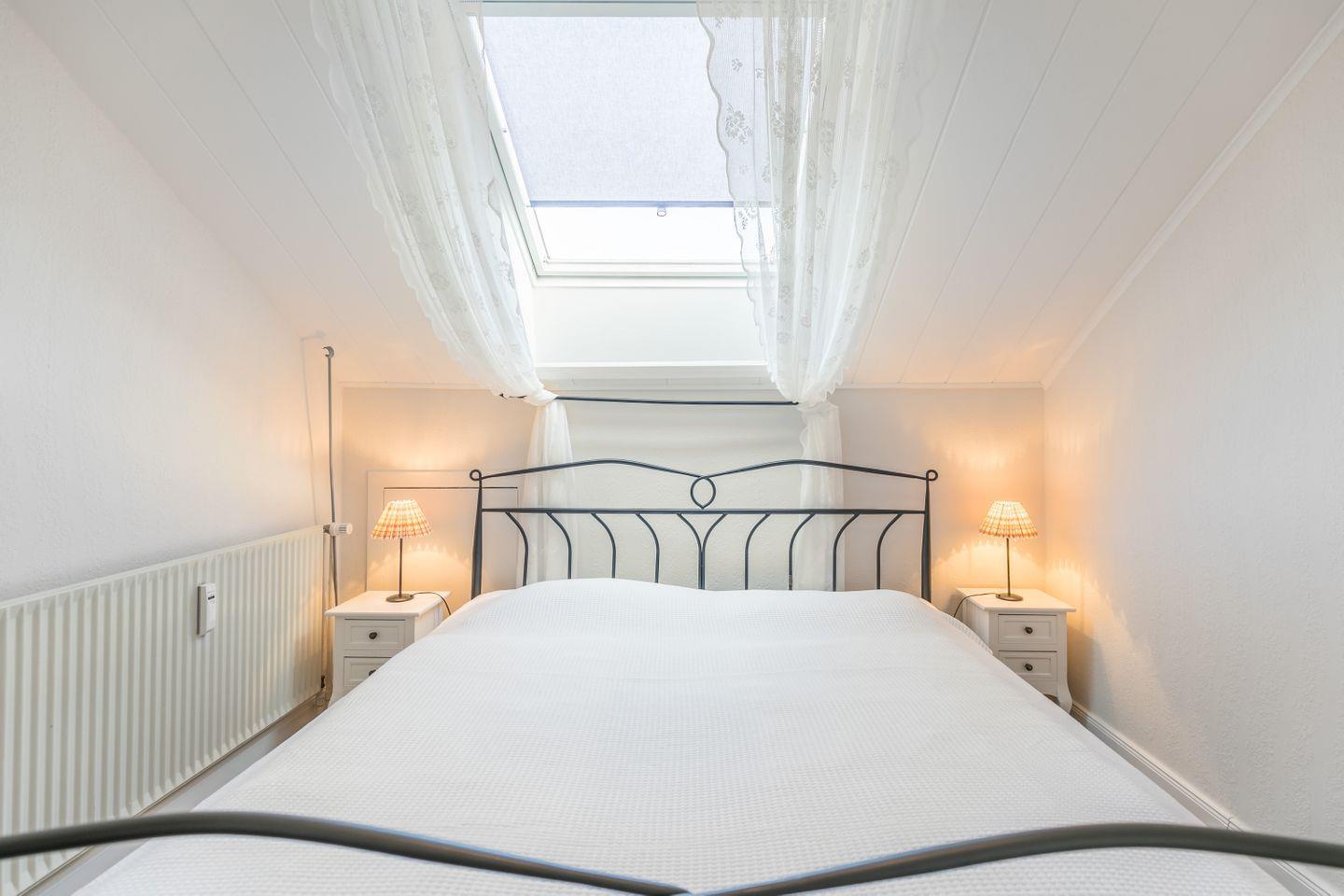 Doppelbett mit verstellbaren Lattenrosten, Kommode, Nachttisch, Wandspiegel, Veluxfenster mit elektr. Außenrollladen
