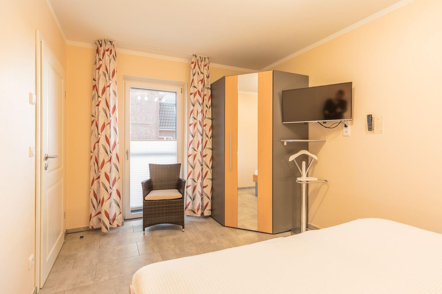 Doppelbett (1,80x2,00m) verstellbare Lattenroste Komforthöhe, Kleiderschrank, Nachttische, Sessel, Herrendiener, Außenrolladen, TV, Zugang zum Balkon