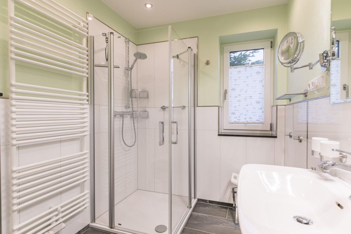 Ebenerdige Dusche, WC, Waschbecken, Spiegel, Fön, Fenster, Duschhocker, Handtuchwärmer