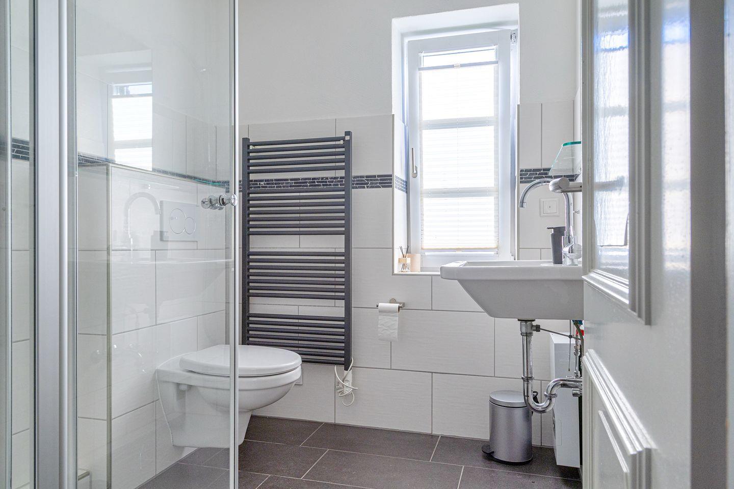 Das freundliche Tageslichtbad bietet eine geräumige Dusche, eine angenehme Fußbodenheizung und ein integriertes Radio für entspannte Momente.
