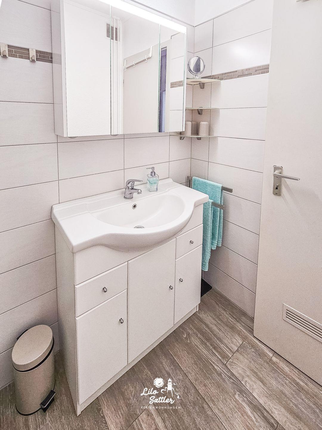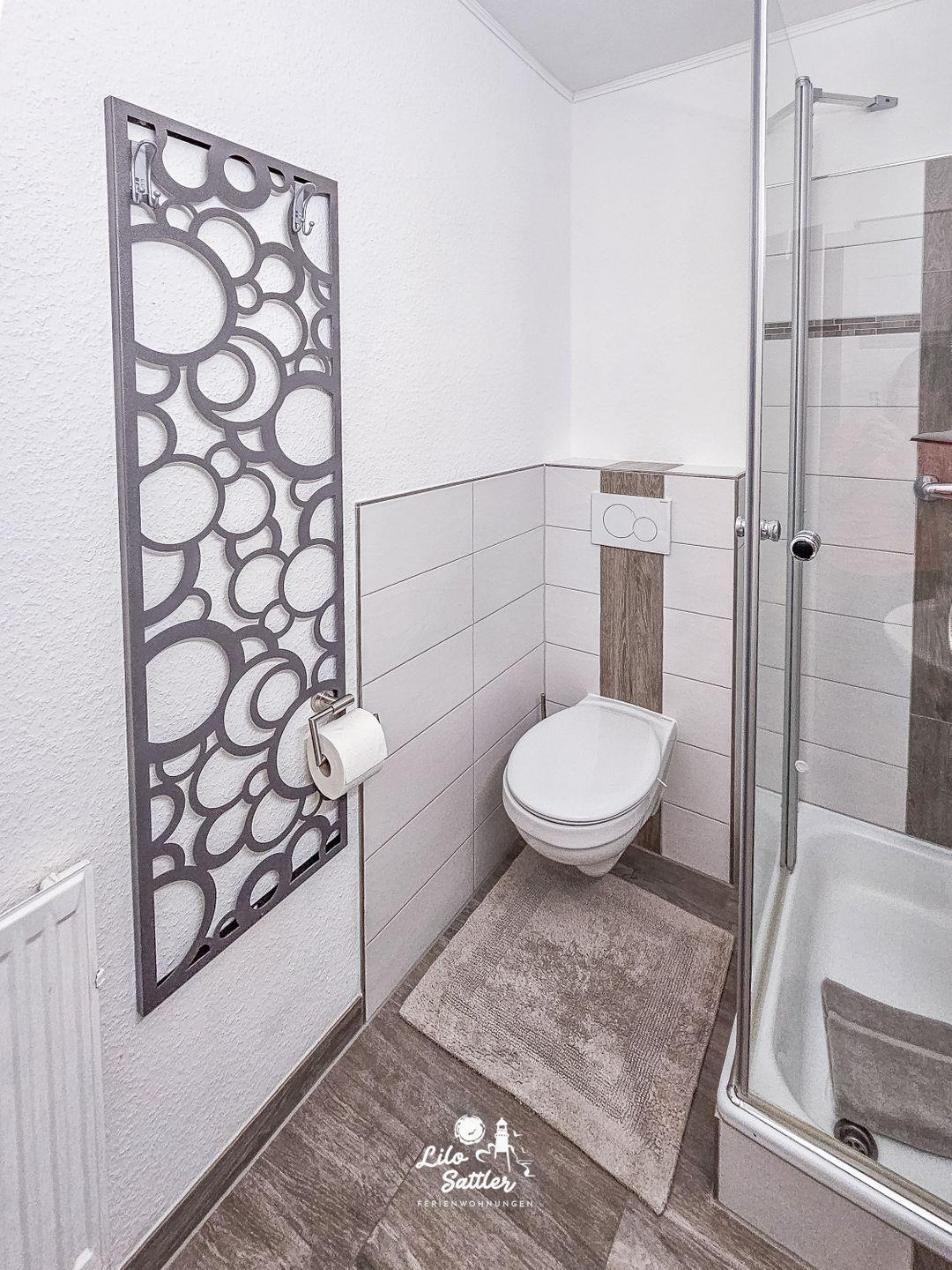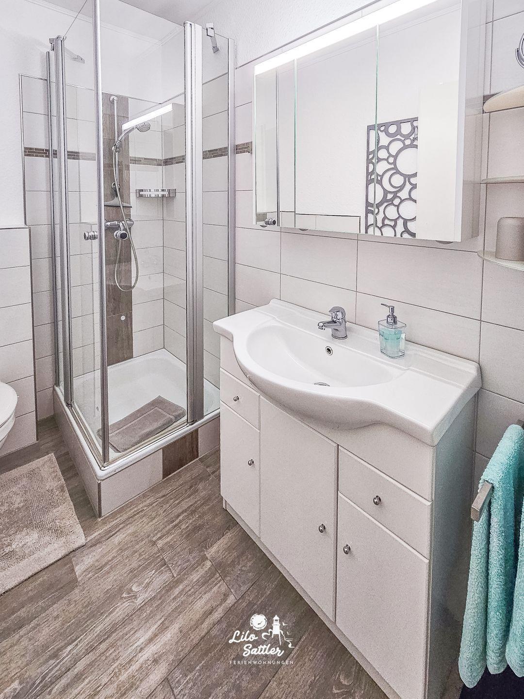 Dusche, WC, Waschbecken, Spiegel, Abluft
