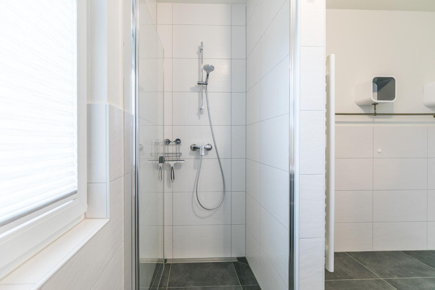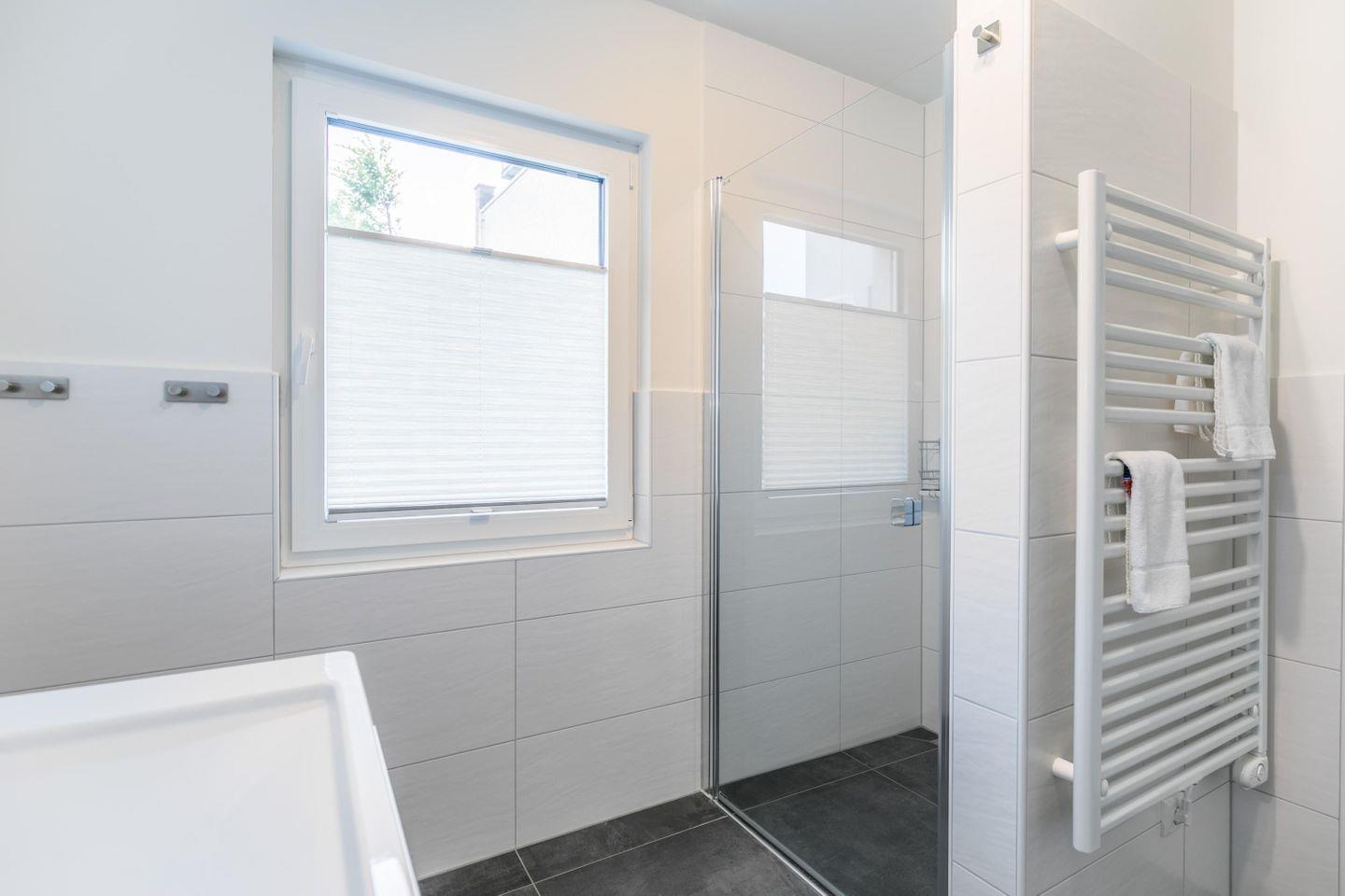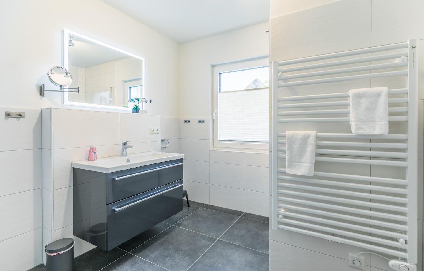 Ebenerdige Dusche, Waschbecken, WC, Spiegel, Kosmetikspiegel, Unterschrank, Fenster, Abluft, Fön, Handtuchtrockner