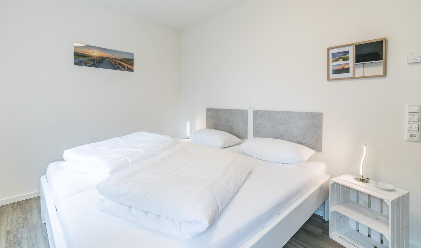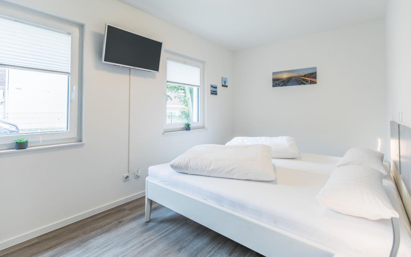 Doppelbett, Nachttische + Lampen, Kleiderschrank, Flachbild-TV, Außenjalousien, Plissees, Insektenschutz