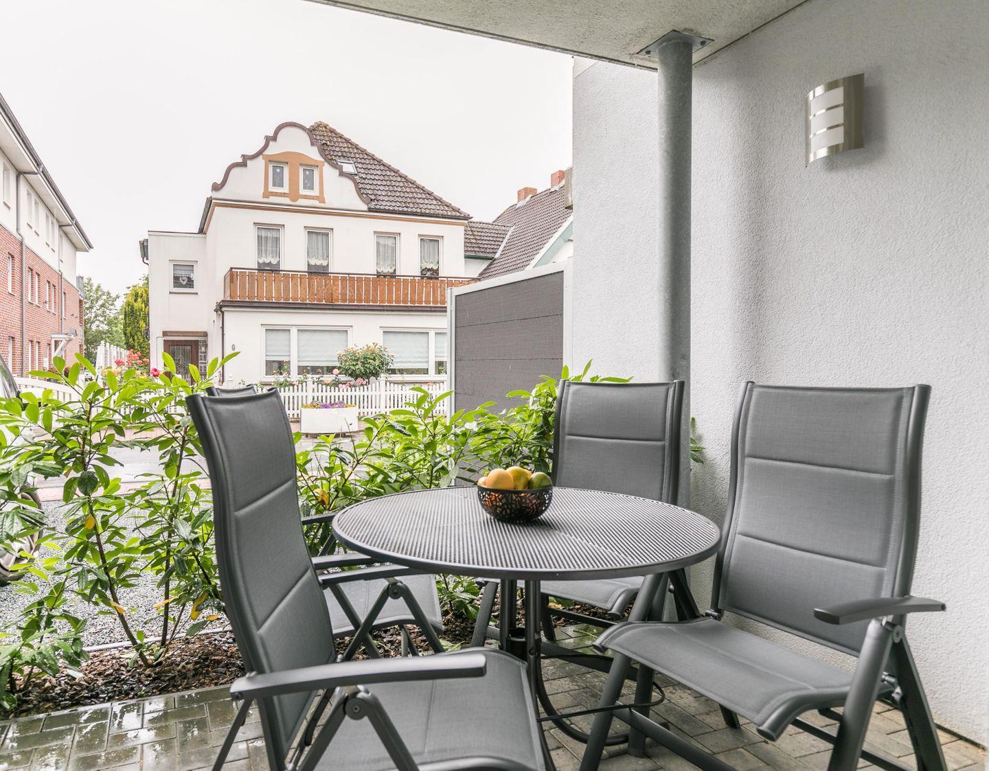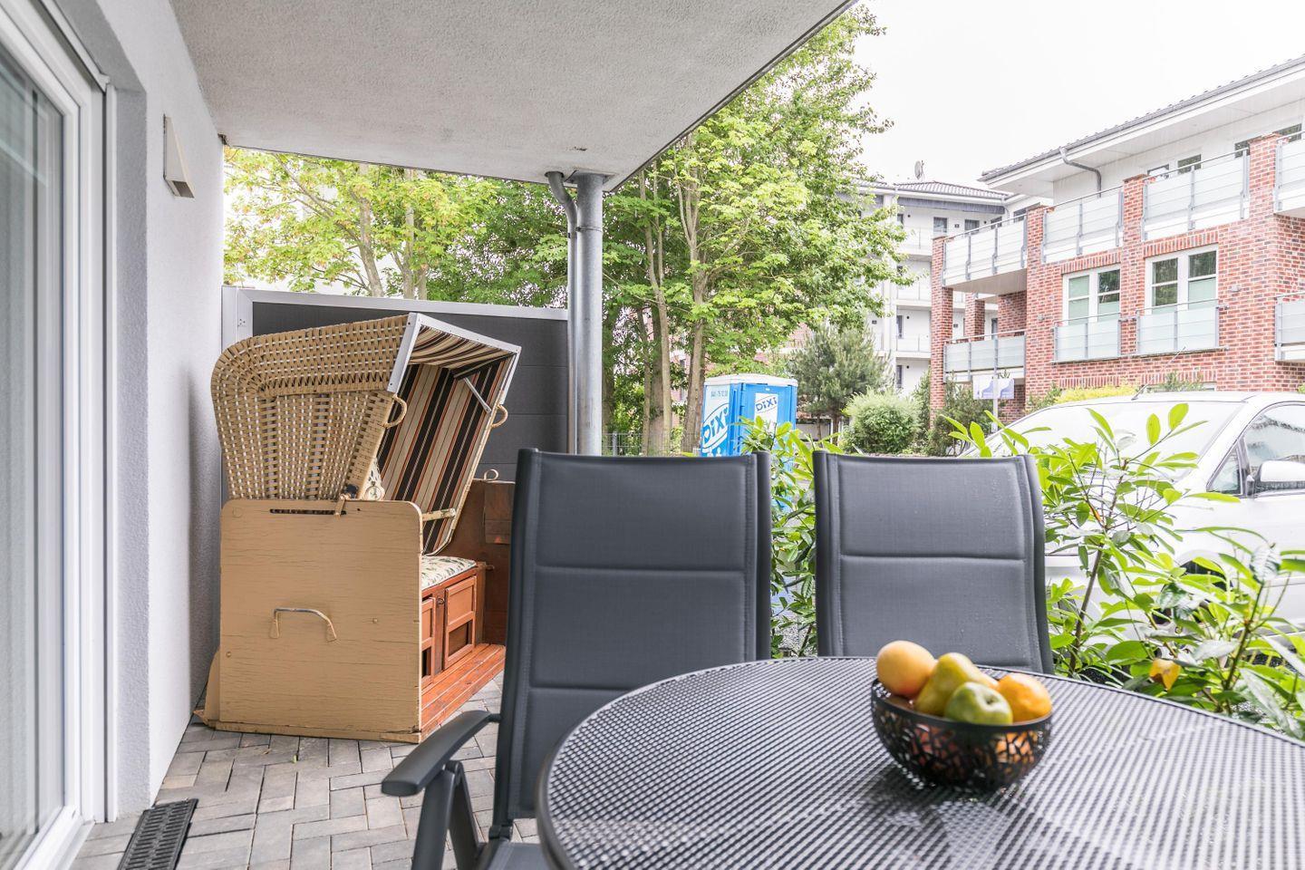 Auf der Terrasse steht außerdem ein echtes Original: Ein Strandkorb vom Büsumer Deich - Nordseefeeling pur!