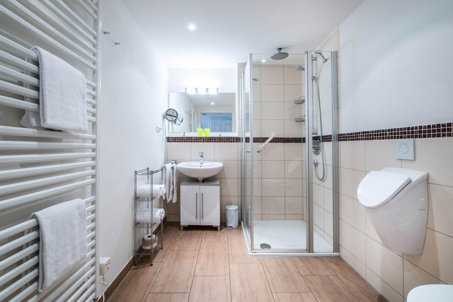 Sanitär: Duschbad mit barrierefreier Dusche, Urinal, Fön, Kosmetikspiegel